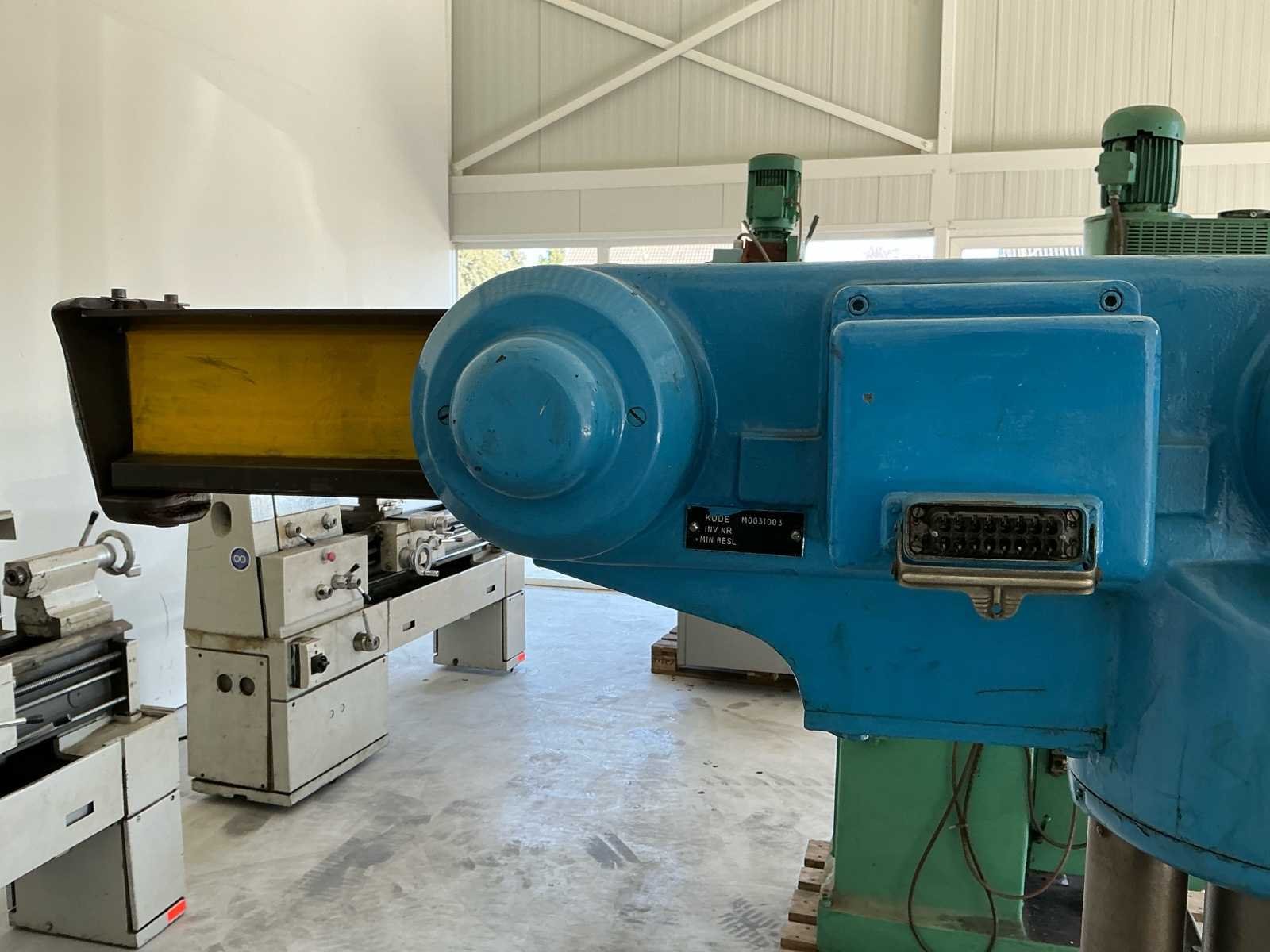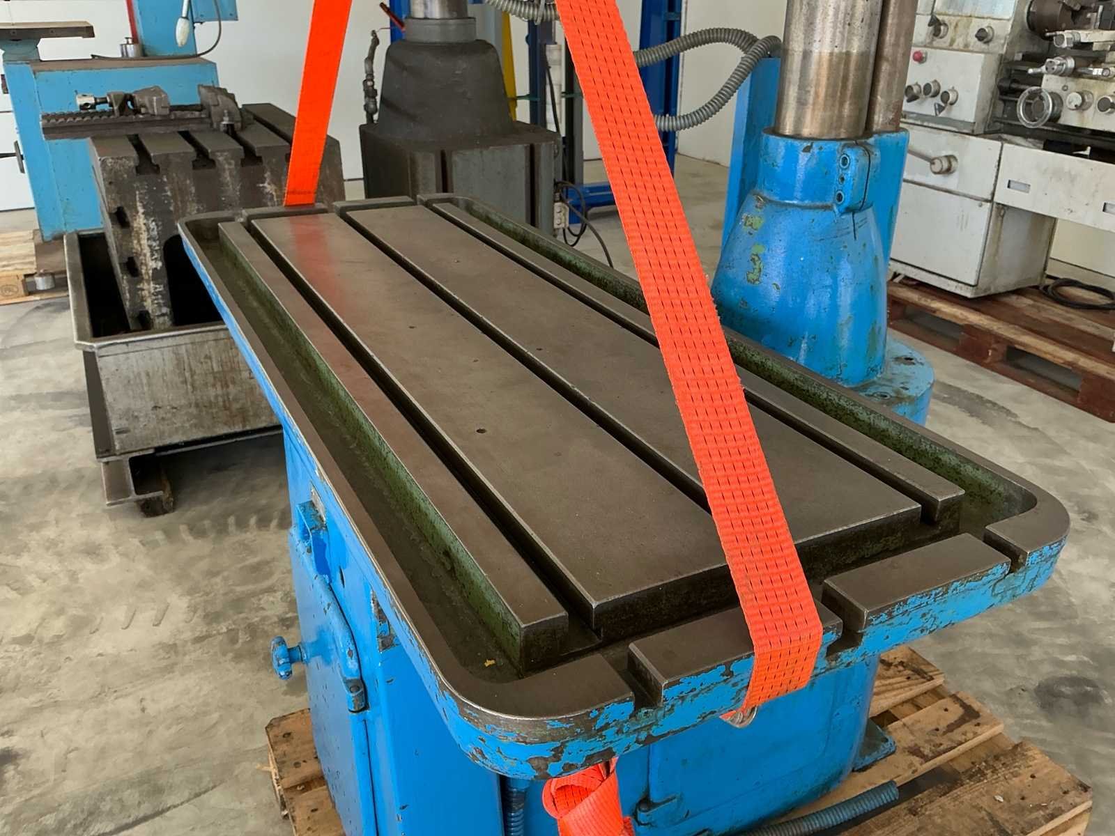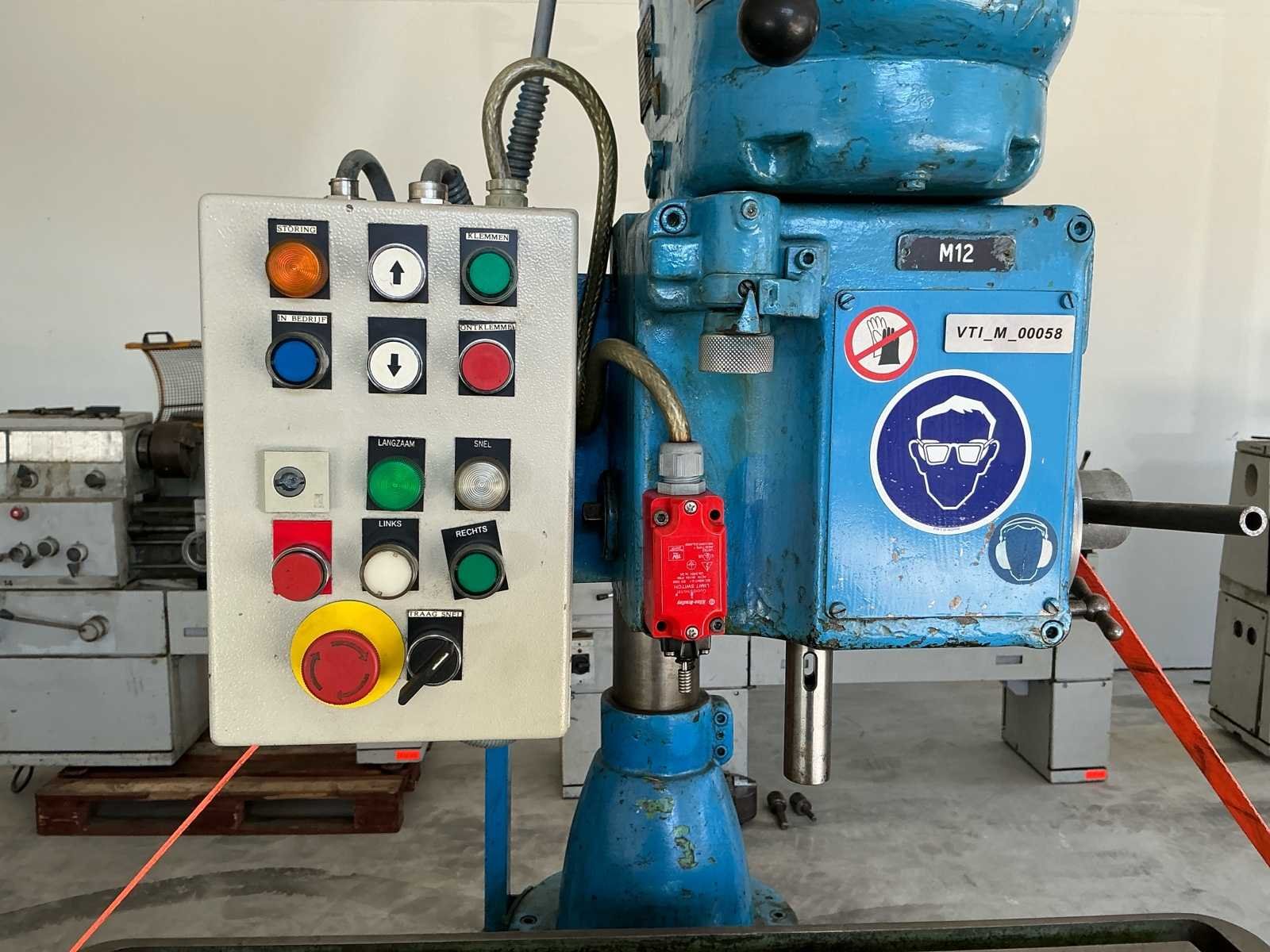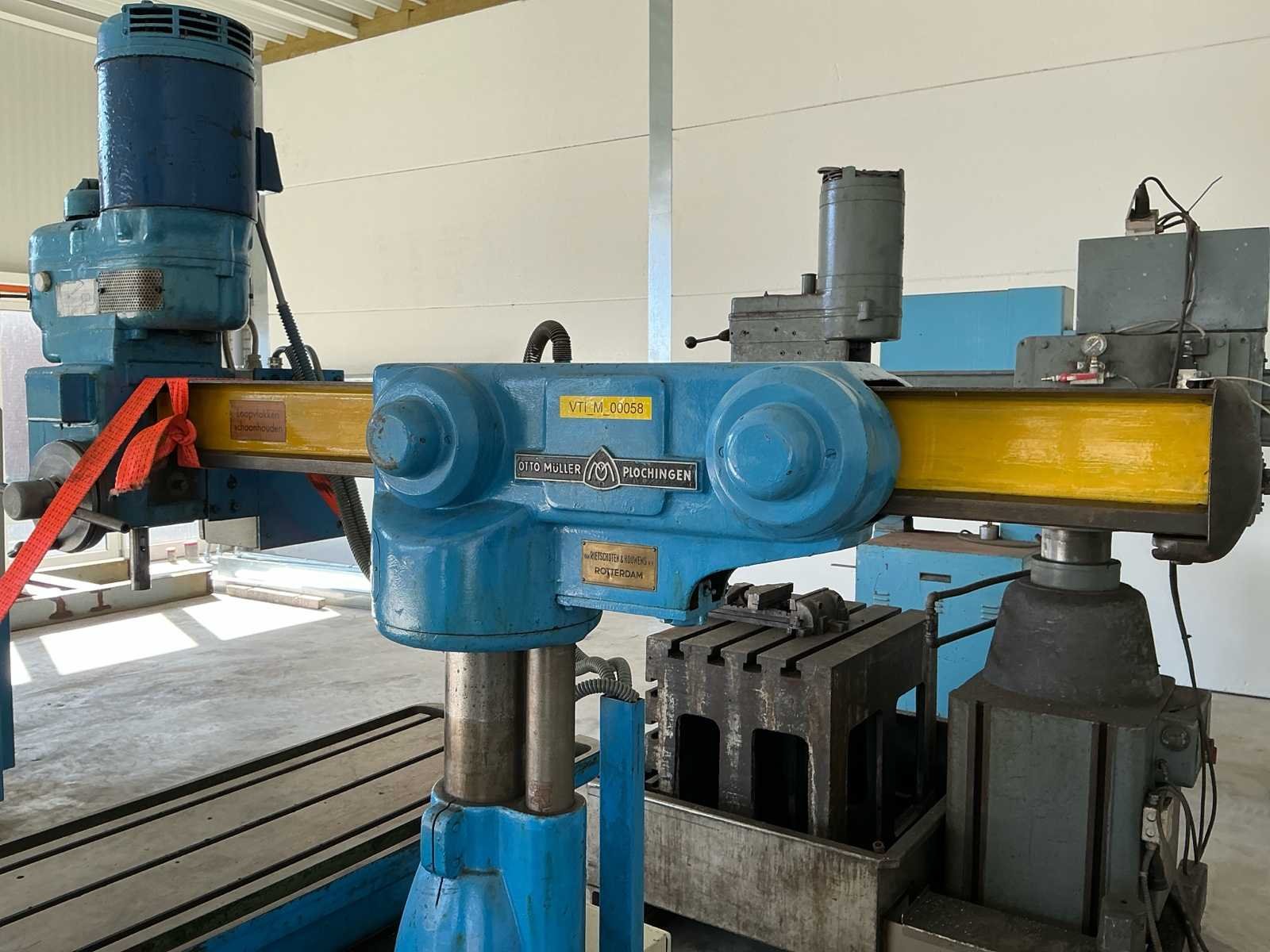 Voorzien van: Otto Müller, M12, snel radiaalboormachine, aansluiting: 380 V – 50 Hz, mechanisch geschakeld toerental, radiaal verstelbare arm, verticale armverstelling langs kolom, spindel met handvoeding, massieve gietijzeren werktafel met T-sleuven, boorspindel opname (morse): 30mm, langsverplaatsing boorkop (X-as): 750 mm, hoogteverplaatsing arm (Y-as): 350 mm, spindeldiameter: 55 mm, max boordiepte: 125 mm, toerental: 2400 rpm, afmetingen: 175x130x215cm (LxBxH), voeding: 380v Nee Merk: Otto Müller Type: SR23 Snelheid tot n =: 2400rpm Boordiepte: 125mm Opname mc: 30 Aansluiting: 380V Afmeting l: 1750mm Afmeting b: 1300mm Afmeting h: 215mm