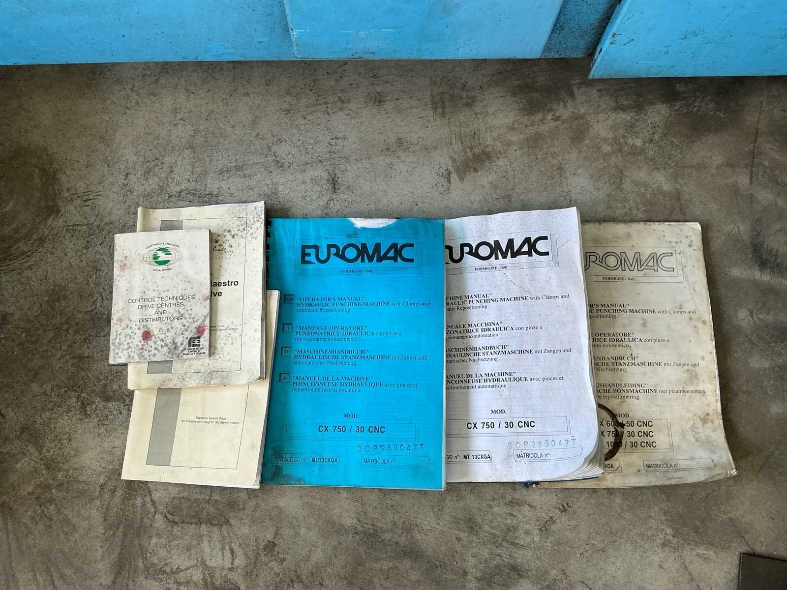 Voorzien van: Euromac CX 750/30, CNC-gestuurde hydraulische ponsmachine v, 30 ton ponskracht, slagregeling instelbaar, geschikt voor standaard Euromac gereedschap, maximale plaatcapaciteit staal: ca. 6 mm, RVS: ca. 4–5 mm, aluminium: ca. 8 mm, werkbereik X-as bereik: ca. 1.250 mm, Y-as bereik: ca. 2.500 mm, maximale plaatgrootte: ca. 1.250 x 2.500 mm, herpositioneerfunctie, CNC-besturing met programmeerunit, handbediening + automatische cyclus, noodstop aanwezig, voeding: 400V – 3~ – 50 Hz, hydraulisch systeem geïntegreerd, machine-afmetingen (circa)lengte: ca. 3.200 – 3.500 mm, breedte: ca. 2.500 – 3.000 mm, hoogte: ca. 2.000 – 2.200 mm, gewicht: ca. 4.000 – 5.000 kg, compleet met diversen gereedschap, werkend gedemonteerd, huidige werking onbekend. Nee Merk: Euromac Type: CX759 Bouwjaar: 1997 Serienummer: 3CP289047T Capaciteit.: 30t Max. plaatdikte: 8mm Digitale uitlezing: true Aansluiting: 400V Machinegewicht: 3000kg Afmeting l: 3200mm Afmeting b: 2500mm Afmeting h: 2000mm