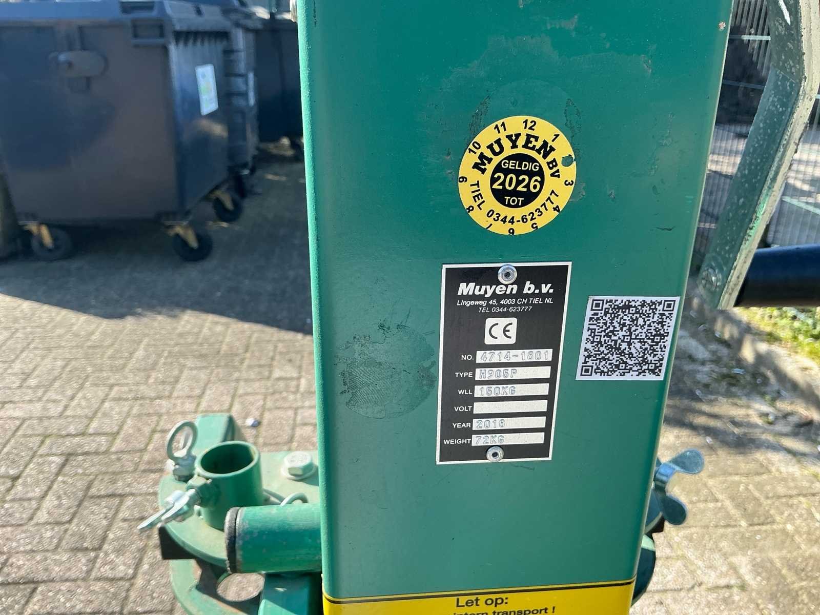 Voorzien van: Draaibare zuiger voor 250 kg, mobiel op luchtbanden, lier, staalkabel, uitschuifbaar tot 2200mm No Merk: Muyen Type: H905P Bouwjaar: 2018 Serienummer: 47141801 Hijsvermogen: 150kg Totale afmeting L: 750mm Totale afmeting Breedte: 580mm Totale afmeting Hoogte: 1690mm
