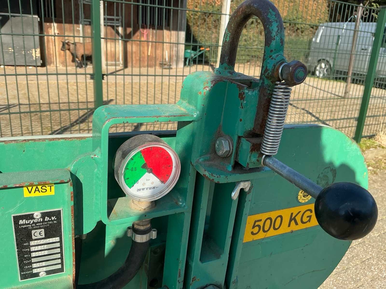 No Merk: Muyen Type: VA811 Bouwjaar: 2015 Serienummer: 47141501 Hijsvermogen: 500kg Eigen gewicht: 50kg Totale afmeting L: 880mm Totale afmeting Breedte: 220mm Totale afmeting Hoogte: 1070mm