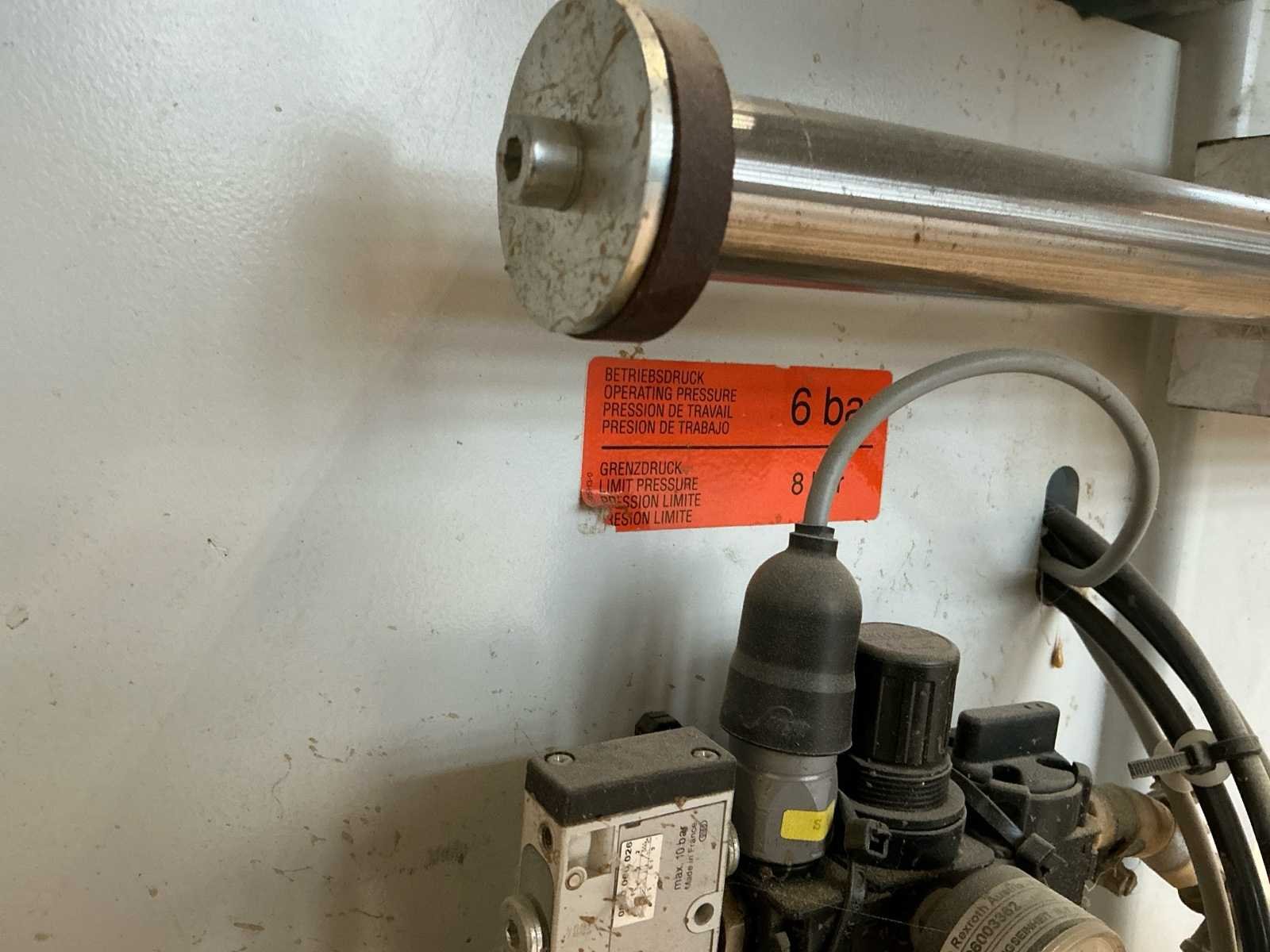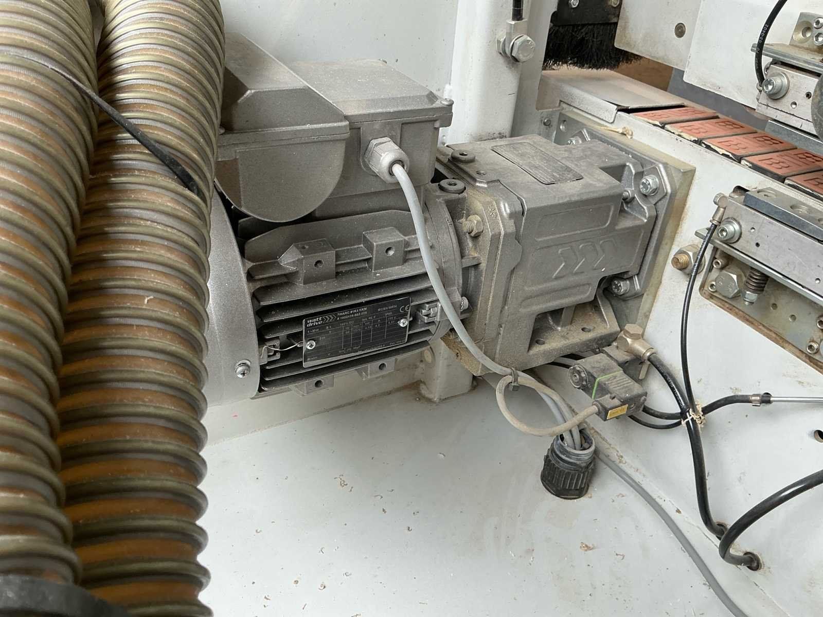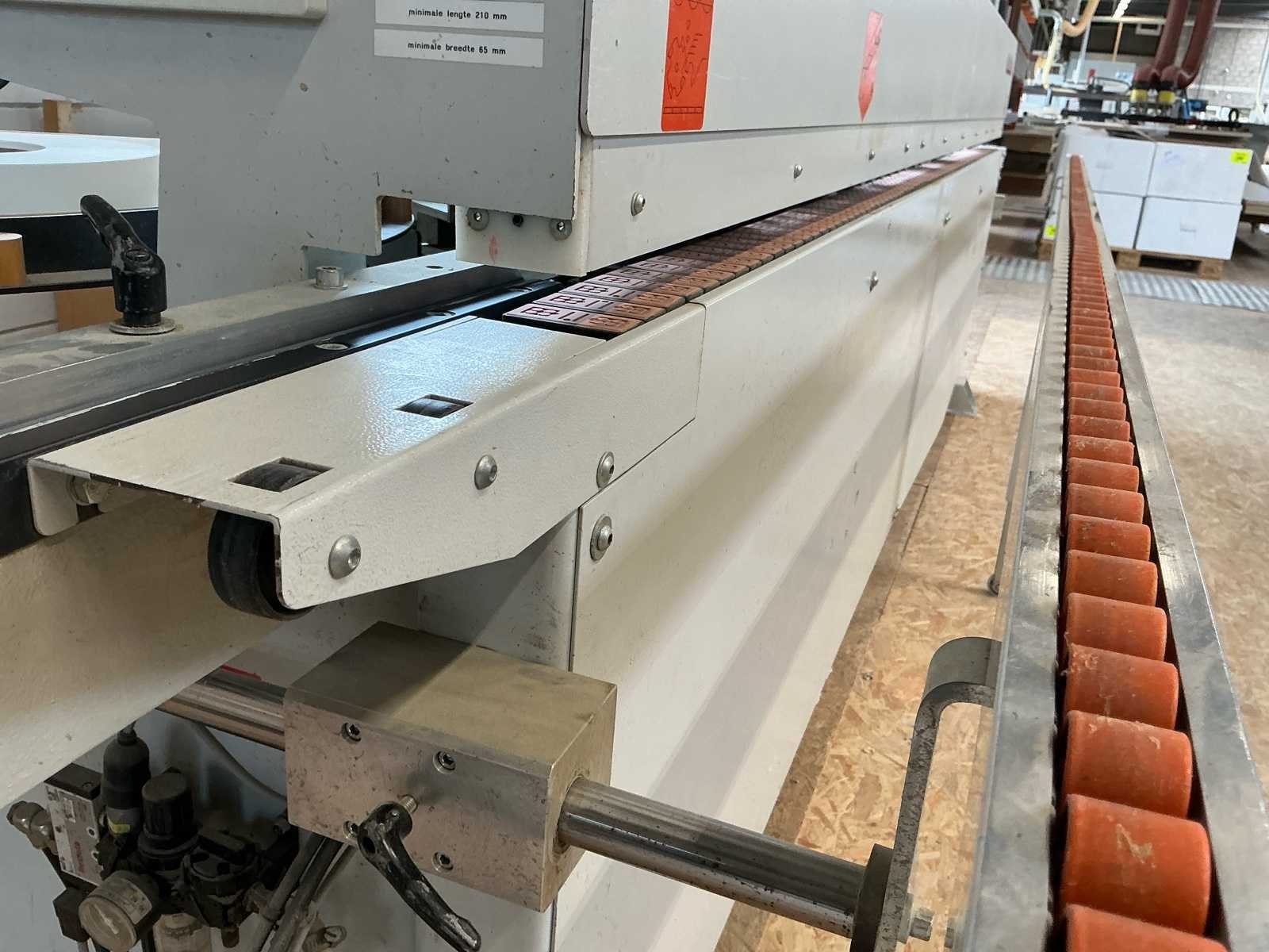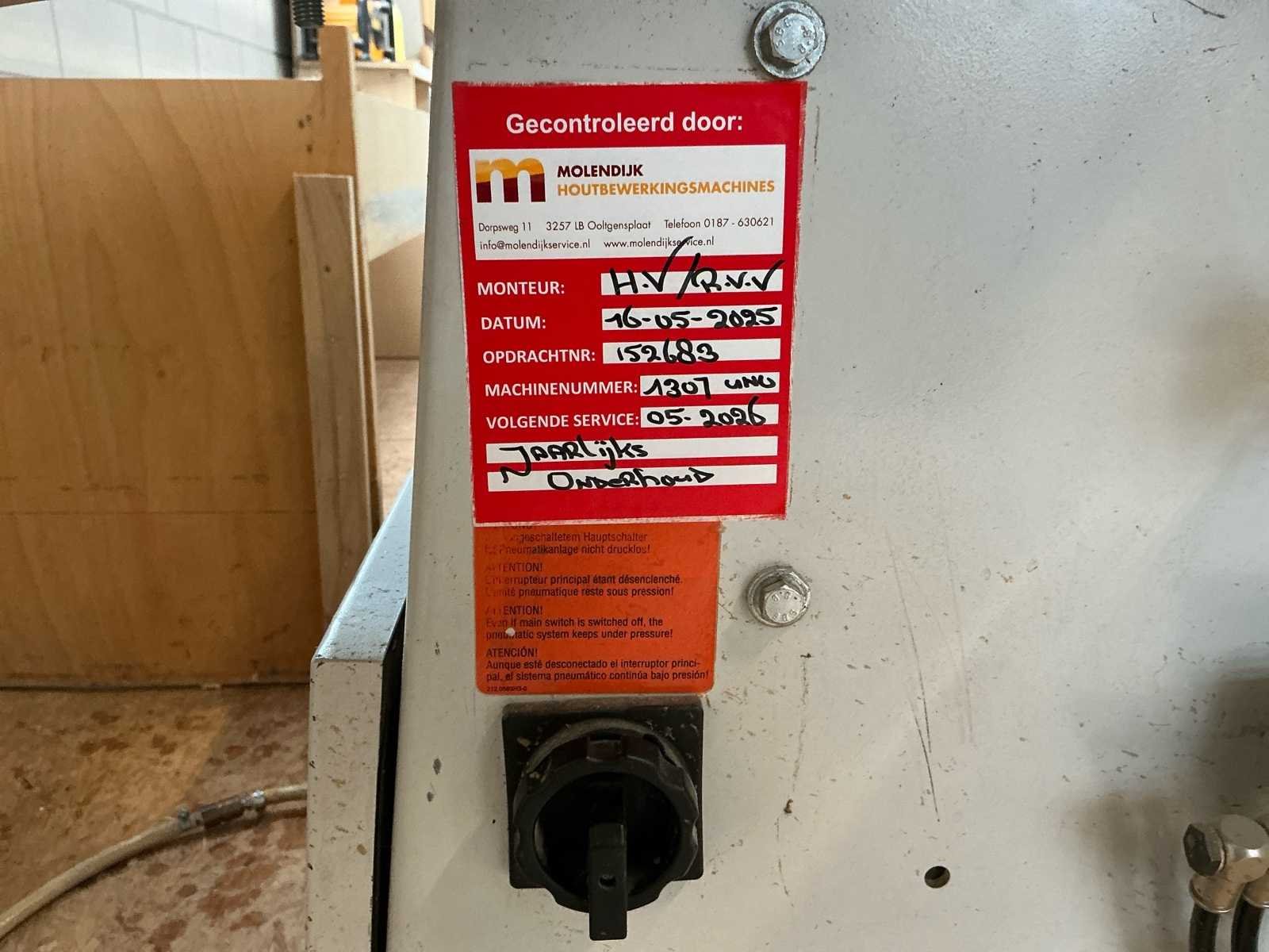 Voorzien van handleiding; Elektrisch Spanning: 400 V AC Fasen: 3 ~ Frequentie: 50 Hz Stuurspanning: 24 V DC Volbelastingsstroom: 55,60 A Max. zekering (traag): 63 A Waarde grootste verbruiker vermoedelijk 21,9 A, zie afbeelding Afmetingen Lengte: 4191 mm Breedte: 934 mm Hoogte: 1299 mm Capaciteit Paneeldikte: 6 – 50 mm Kantdikte: 0,4 – 3 mm Min. werkstukbreedte: 65 mm Min. werkstuklengte: 160 mm Doorvoersnelheid: 10 m/min Luchtdruk: 6 bar Uitvoering / Units Voorfrees: 1801 Lijmstation: 1906MG Glu Jet (cartridge, closed system) Drukunit: 1912-3 Kopse afkorting: 1918P (2 x 4,5 kW, 9000 RPM) Boven/onder trim: 1825 (2 x 0,6 kW, 18.000 RPM) Hoekafronding: 1832 (0,22 kW, 9000 RPM) Schraapunit: 1929 Polijstunit: 1940 (2 x 0,09 kW, 1440 RPM) Magazijn: 1806-1 Nee Merk: Holzher Type: Auriga - UNO 1307 Bouwjaar: 2008 Serienummer: 73/0-809 5014178 Paneeldikte: 50mm Min. werkstuklengte: 210mm Min. werkstukbreedte: 65mm Zaagunit: true Voorfreesunit: true Freesunit: true Rondloopunit: true Schraapunit: true Aansluiting: 400V Afmeting l: 1200mm Afmeting b: 4200mm Afmeting h: 1380mm