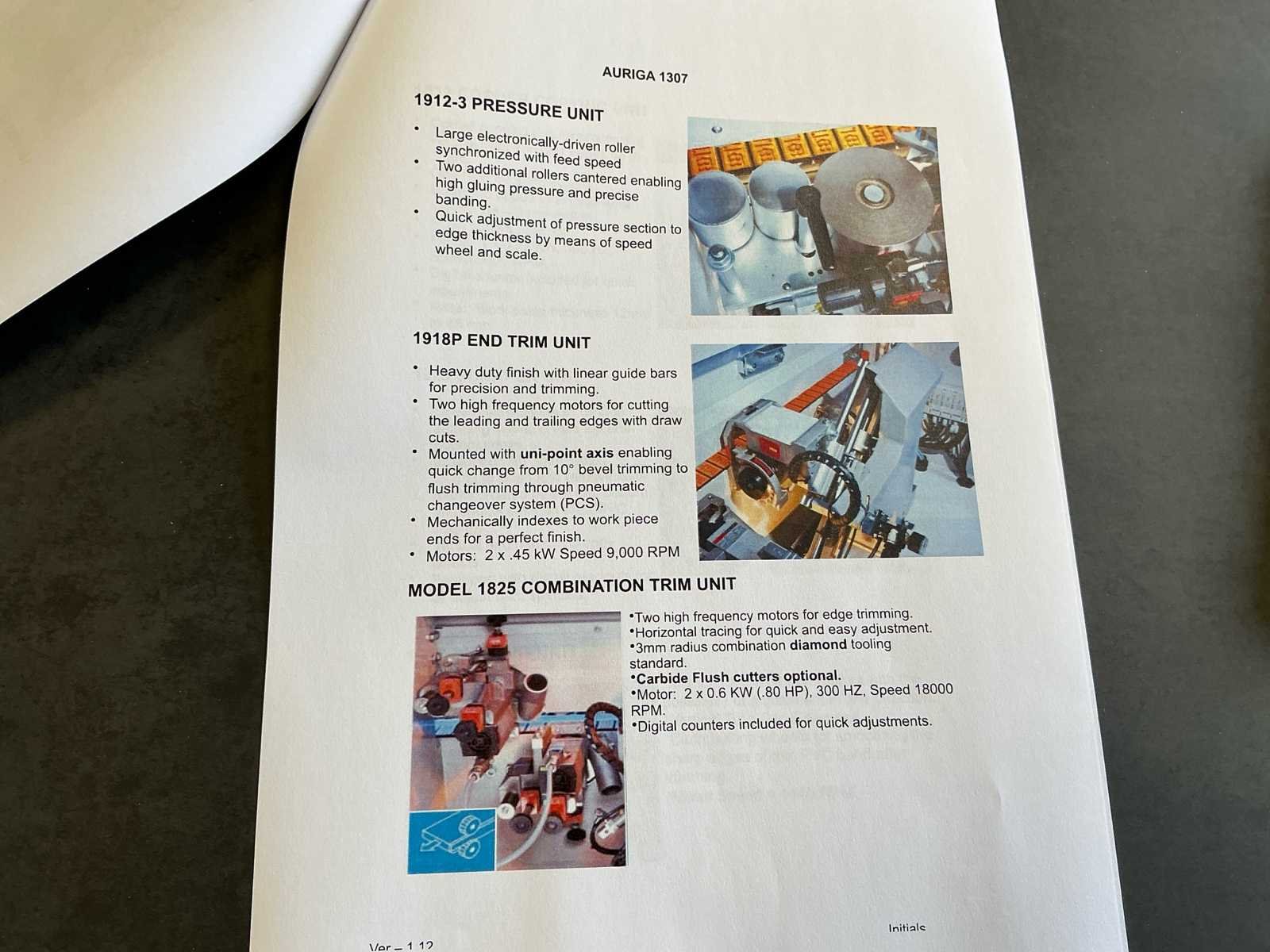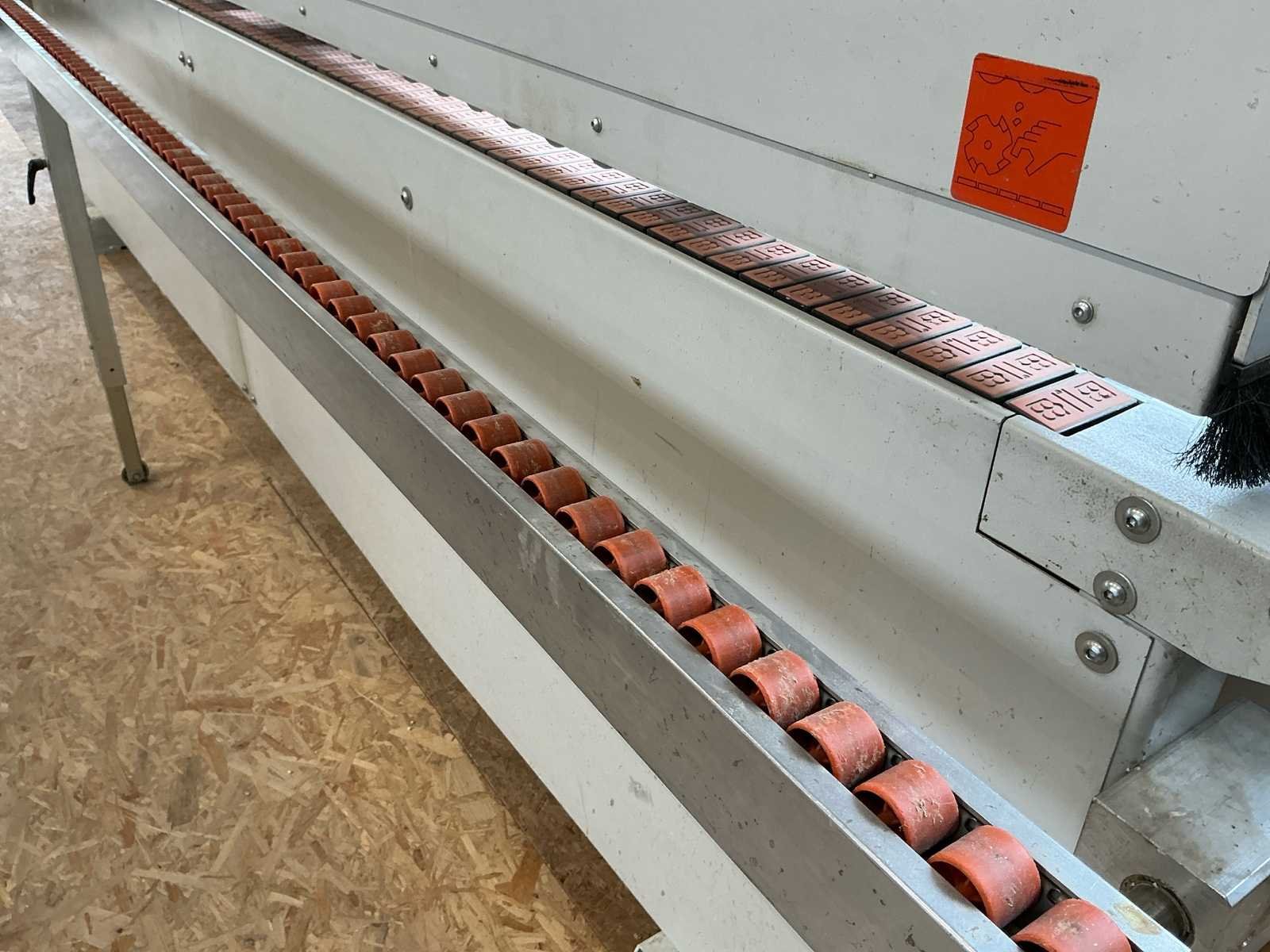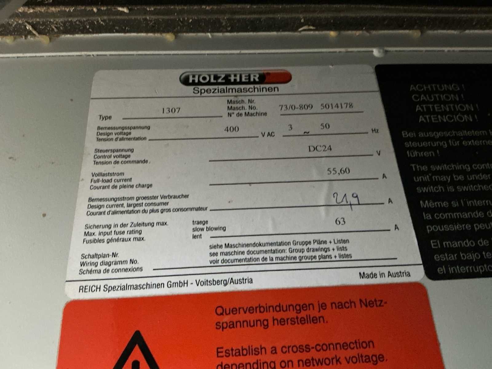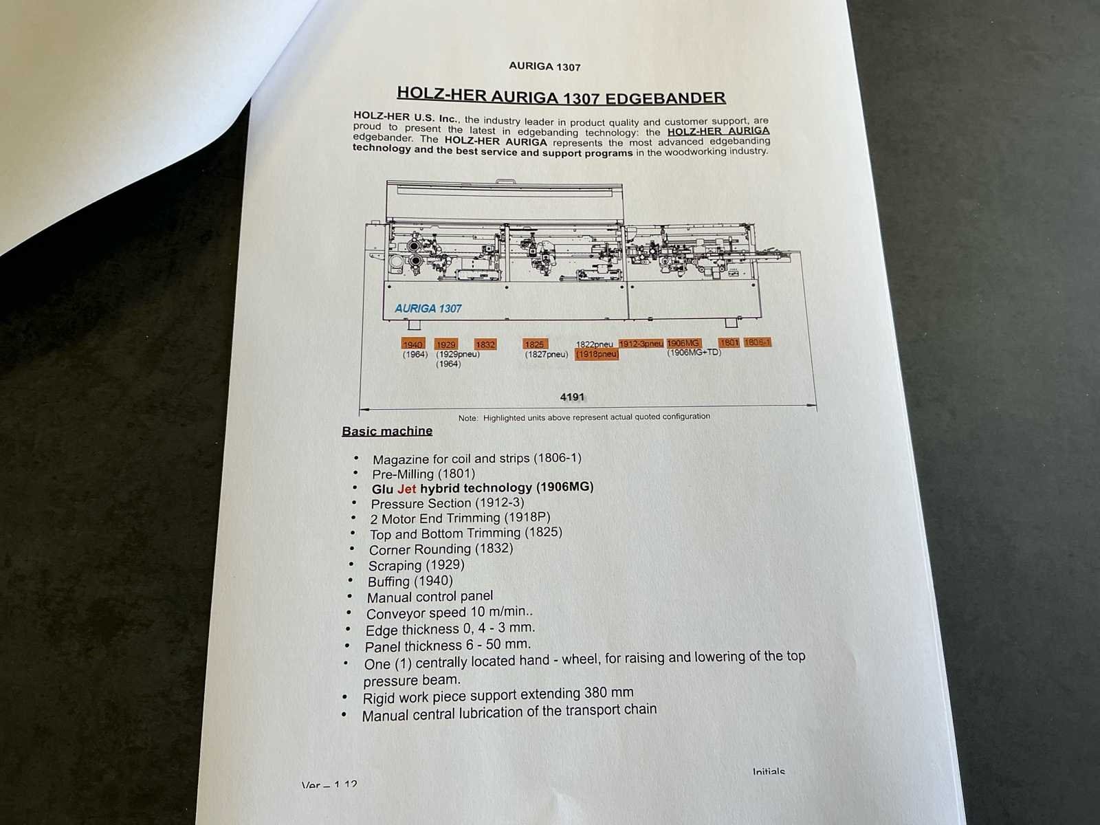 Voorzien van handleiding; Elektrisch Spanning: 400 V AC Fasen: 3 ~ Frequentie: 50 Hz Stuurspanning: 24 V DC Volbelastingsstroom: 55,60 A Max. zekering (traag): 63 A Waarde grootste verbruiker vermoedelijk 21,9 A, zie afbeelding Afmetingen Lengte: 4191 mm Breedte: 934 mm Hoogte: 1299 mm Capaciteit Paneeldikte: 6 – 50 mm Kantdikte: 0,4 – 3 mm Min. werkstukbreedte: 65 mm Min. werkstuklengte: 160 mm Doorvoersnelheid: 10 m/min Luchtdruk: 6 bar Uitvoering / Units Voorfrees: 1801 Lijmstation: 1906MG Glu Jet (cartridge, closed system) Drukunit: 1912-3 Kopse afkorting: 1918P (2 x 4,5 kW, 9000 RPM) Boven/onder trim: 1825 (2 x 0,6 kW, 18.000 RPM) Hoekafronding: 1832 (0,22 kW, 9000 RPM) Schraapunit: 1929 Polijstunit: 1940 (2 x 0,09 kW, 1440 RPM) Magazijn: 1806-1 Nee Merk: Holzher Type: Auriga - UNO 1307 Bouwjaar: 2008 Serienummer: 73/0-809 5014178 Paneeldikte: 50mm Min. werkstuklengte: 210mm Min. werkstukbreedte: 65mm Zaagunit: true Voorfreesunit: true Freesunit: true Rondloopunit: true Schraapunit: true Aansluiting: 400V Afmeting l: 1200mm Afmeting b: 4200mm Afmeting h: 1380mm