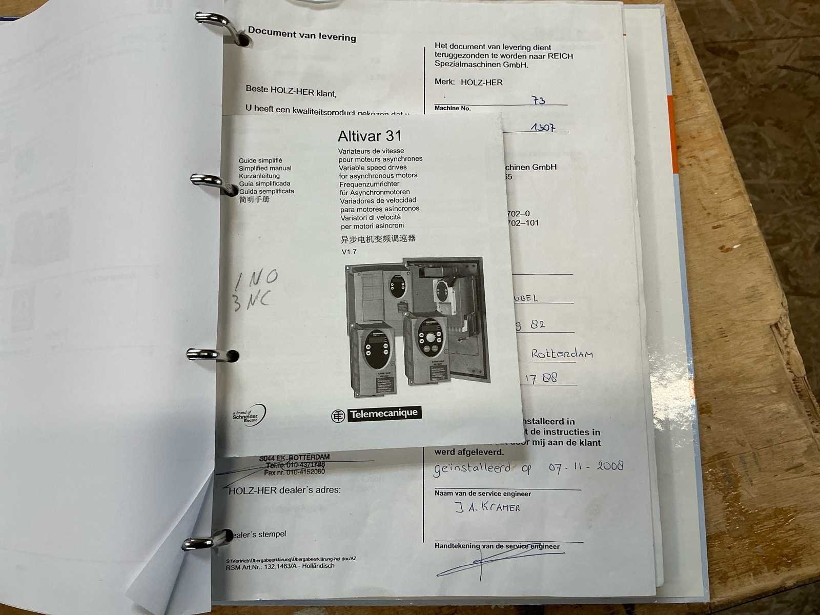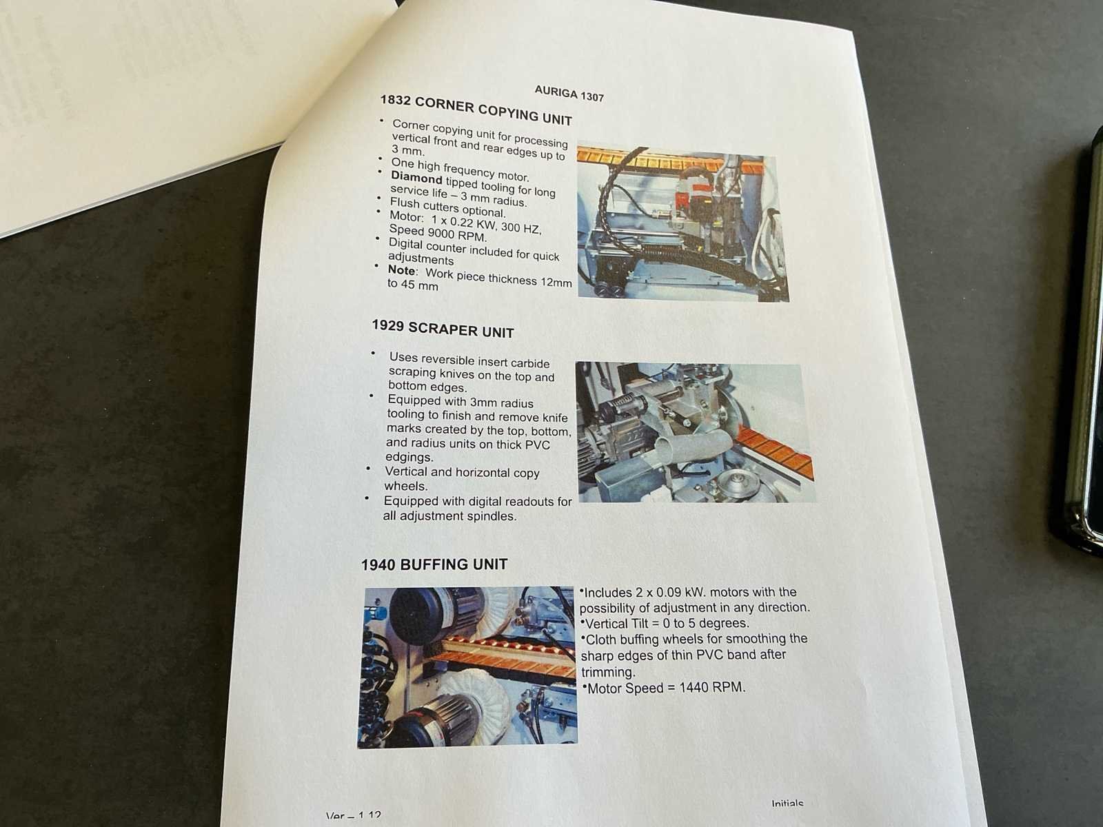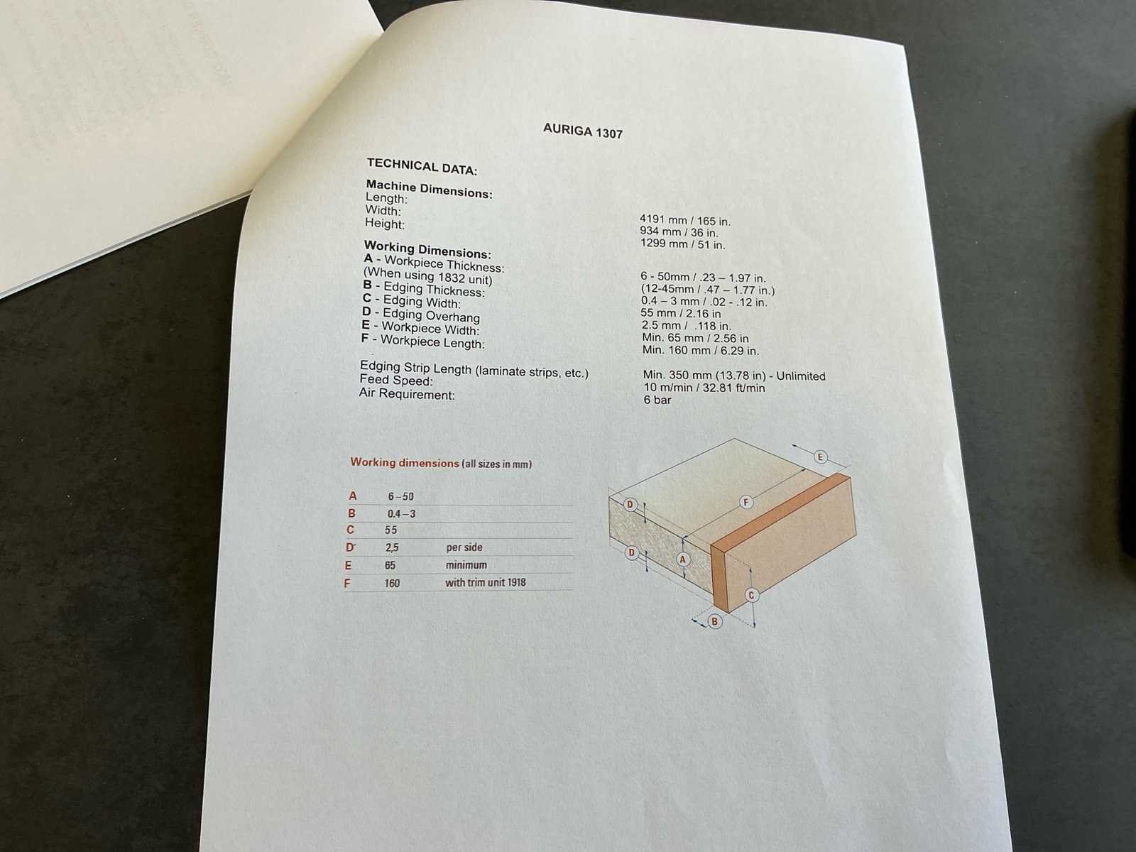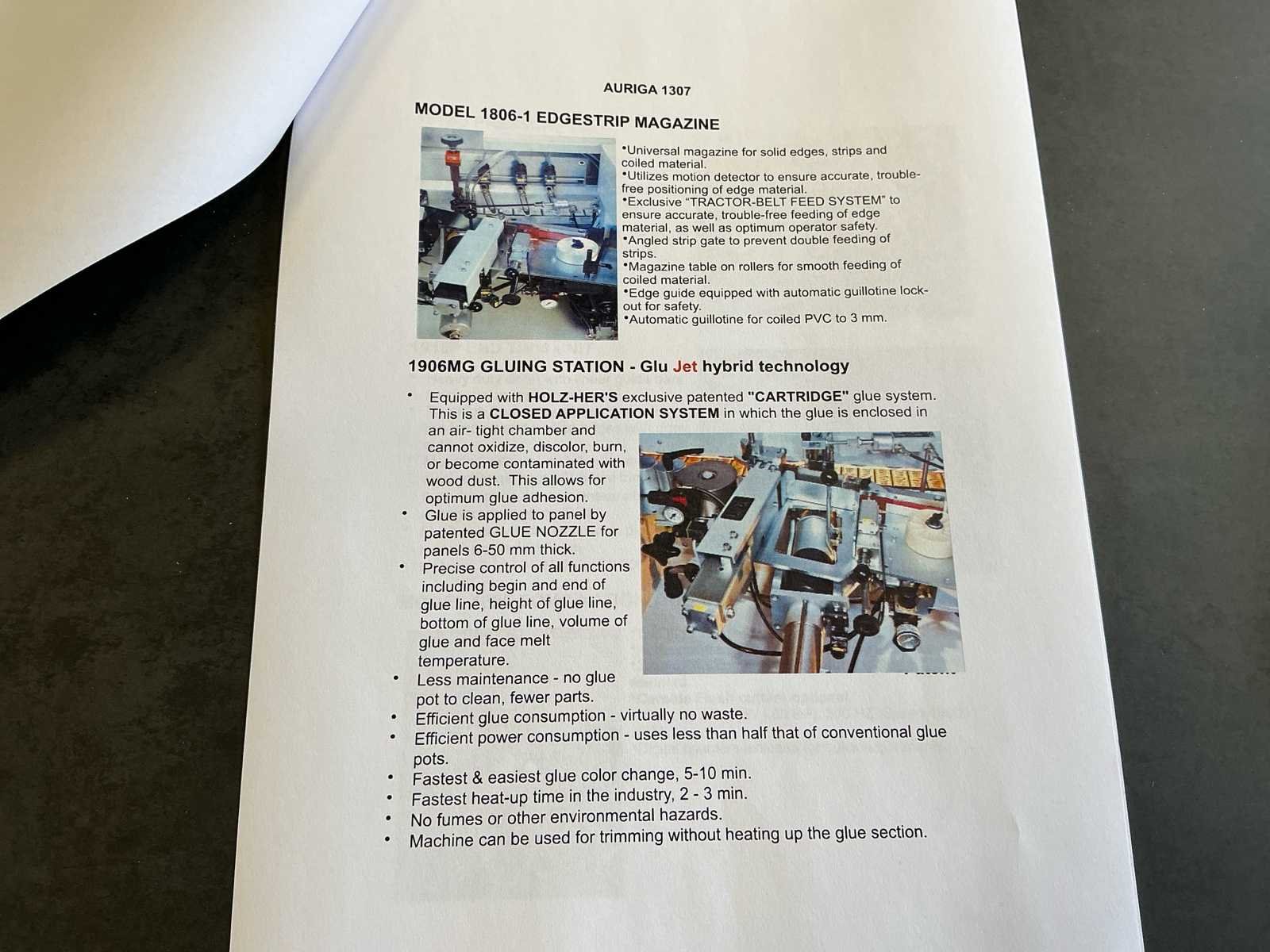 Voorzien van handleiding; Elektrisch Spanning: 400 V AC Fasen: 3 ~ Frequentie: 50 Hz Stuurspanning: 24 V DC Volbelastingsstroom: 55,60 A Max. zekering (traag): 63 A Waarde grootste verbruiker vermoedelijk 21,9 A, zie afbeelding Afmetingen Lengte: 4191 mm Breedte: 934 mm Hoogte: 1299 mm Capaciteit Paneeldikte: 6 – 50 mm Kantdikte: 0,4 – 3 mm Min. werkstukbreedte: 65 mm Min. werkstuklengte: 160 mm Doorvoersnelheid: 10 m/min Luchtdruk: 6 bar Uitvoering / Units Voorfrees: 1801 Lijmstation: 1906MG Glu Jet (cartridge, closed system) Drukunit: 1912-3 Kopse afkorting: 1918P (2 x 4,5 kW, 9000 RPM) Boven/onder trim: 1825 (2 x 0,6 kW, 18.000 RPM) Hoekafronding: 1832 (0,22 kW, 9000 RPM) Schraapunit: 1929 Polijstunit: 1940 (2 x 0,09 kW, 1440 RPM) Magazijn: 1806-1 Nee Merk: Holzher Type: Auriga - UNO 1307 Bouwjaar: 2008 Serienummer: 73/0-809 5014178 Paneeldikte: 50mm Min. werkstuklengte: 210mm Min. werkstukbreedte: 65mm Zaagunit: true Voorfreesunit: true Freesunit: true Rondloopunit: true Schraapunit: true Aansluiting: 400V Afmeting l: 1200mm Afmeting b: 4200mm Afmeting h: 1380mm