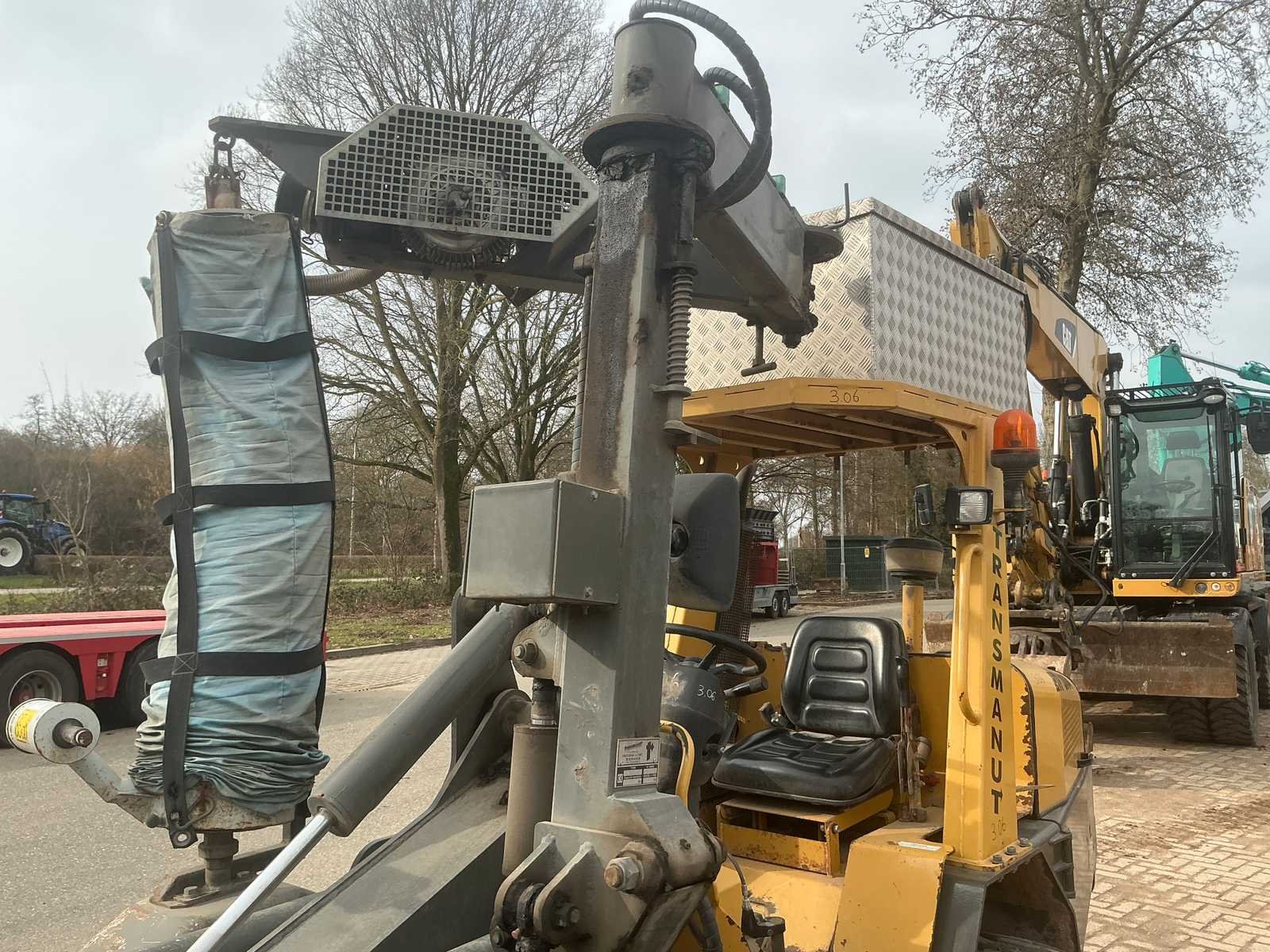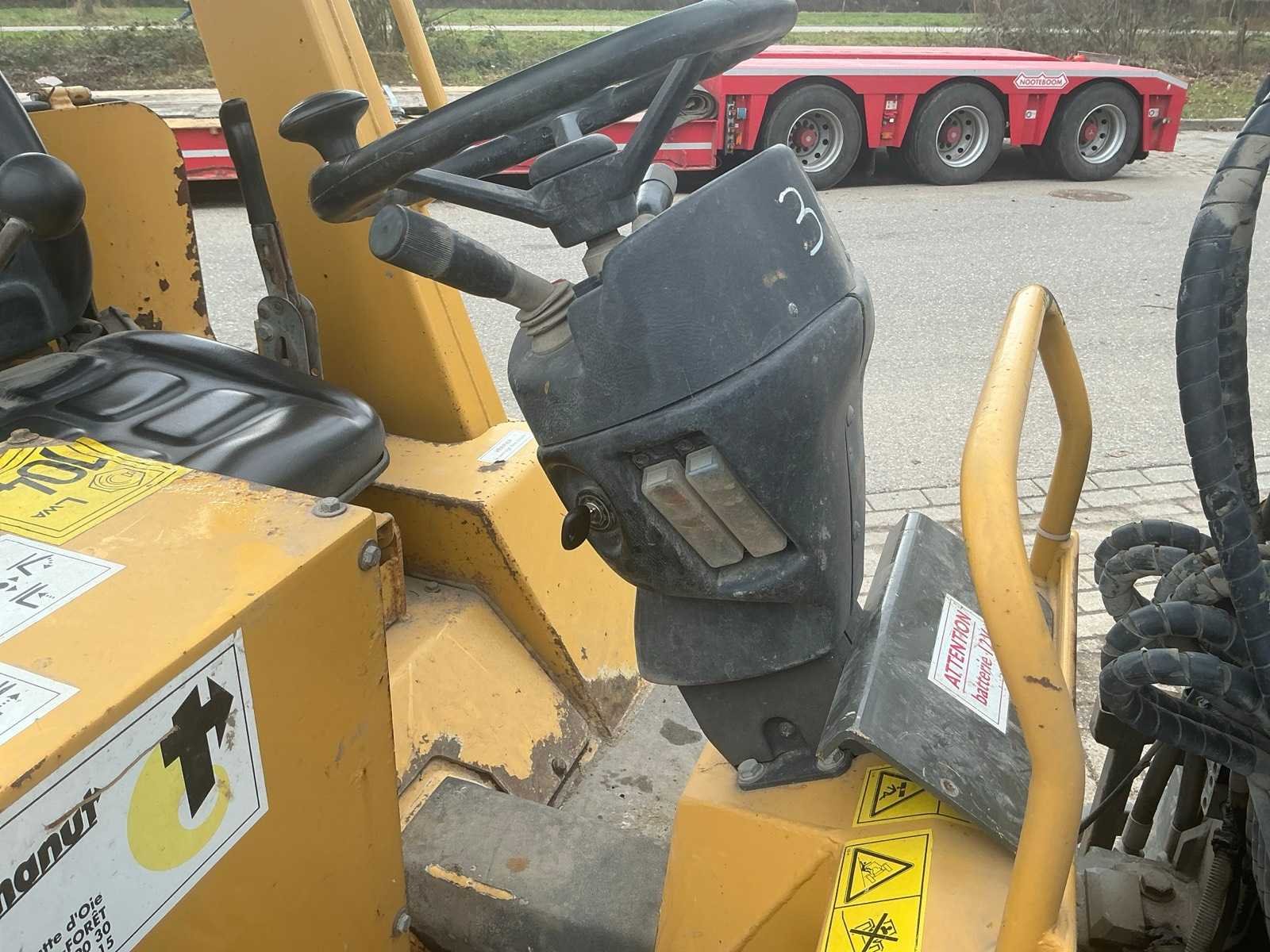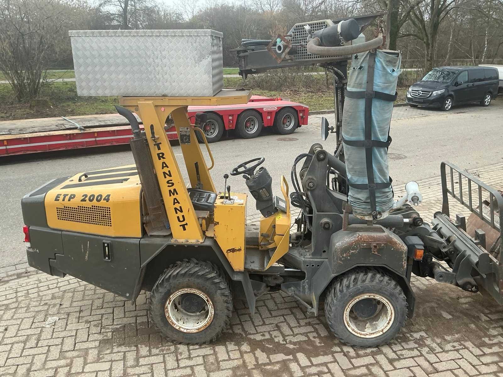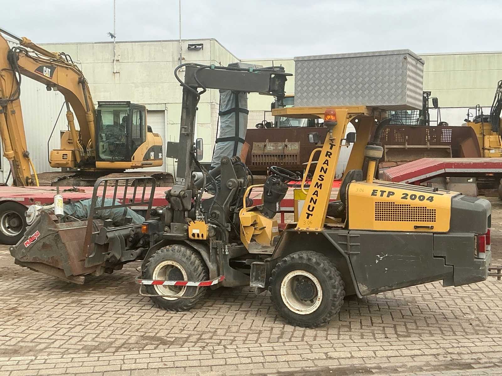 Voorzien van hydraulische uitschuifbare mast. Met Transmanut Potence 300kg en Magsi puinbak, hefvermogen: 1800kg. Nee Merk: Transmanut Type: ETP 2004 Bouwjaar: 2006 Serienummer: 1098-0906 Merk motor: Kubota Motorvermogen (kW): 75kW Aantal cilinders: 4 Brandstof: Diesel Afgelezen urenstand: 1741 Eigen gewicht: 5200kg Totale afmeting L: 6000mm Totale afmeting Breedte: 1450mm Totale afmeting Hoogte: 2700mm