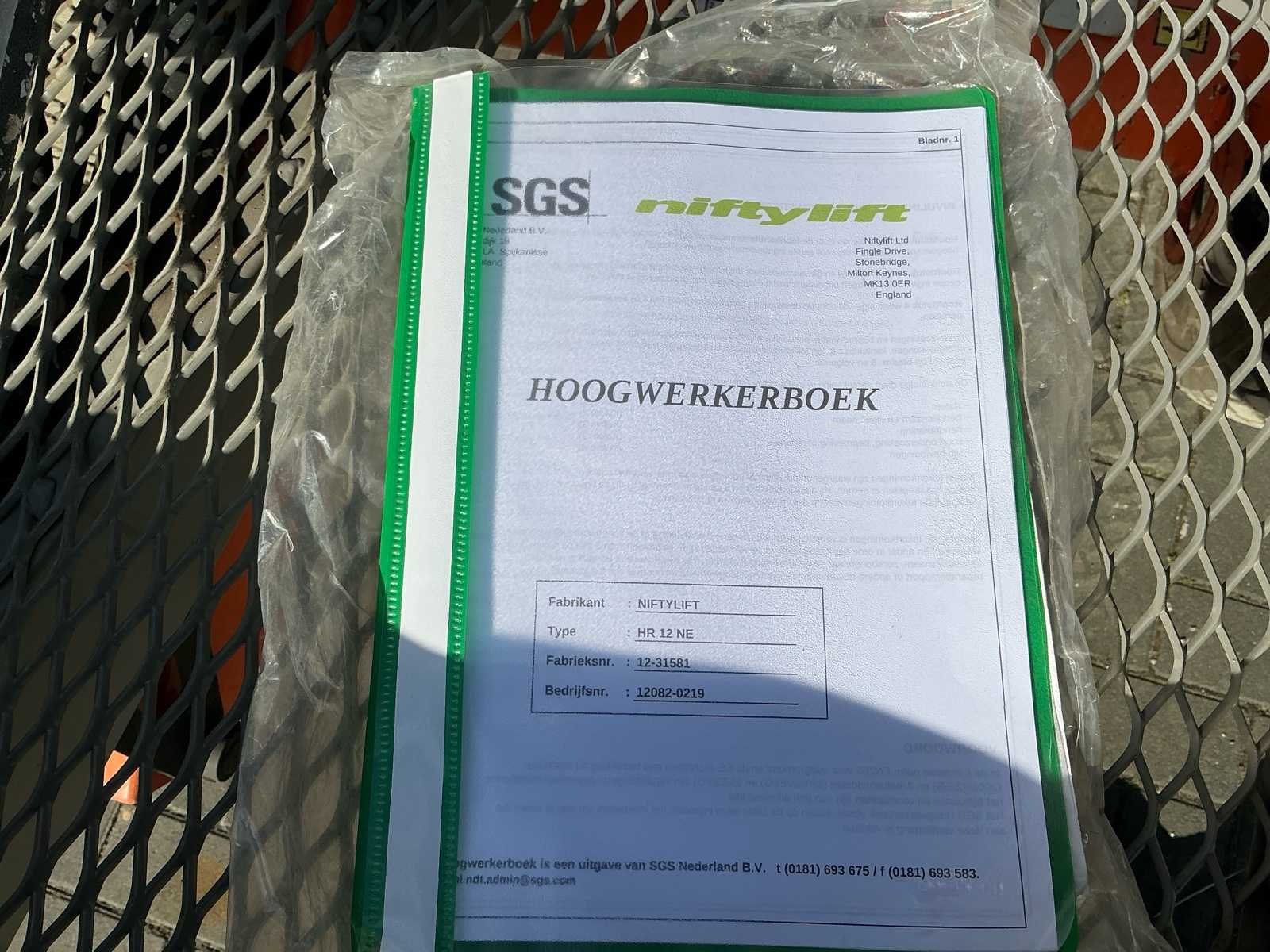 Voorzien van: 1,5 m chassisbreedte, Nul-emissie, volledig elektrische werking, schone, stille prestaties voor binnengebruik, 225kg veilige Werkbelasting (SWL), capaciteit voor twee personen plus gereedschap, onderhoudsvrije Trojan-batterijen, werkhoogte 12,1m, machinebreedte 1,5m, kooidiepte 0,85m, kooibreedte 1,2m, horizontaalbereik 6,4m, draaicirkel 3,3m, proportionele bediening, Nee Merk: Nifty Type: HR12NE Mk1b Bouwjaar: 2015 Serienummer: 12 31581 Elektrisch: true Knikarm hoogwerker: true Werkhoogte: 12100mm Horizontale rijkwijdte: 6400mm Plateau afm. l: 1200mm Plateau afm. b: 850mm Platform capaciteit: 200kg Eigen gewicht: 3500kg Totale afmeting L: 4050mm Totale afmeting Breedte: 1500mm Totale afmeting Hoogte: 1980mm