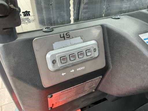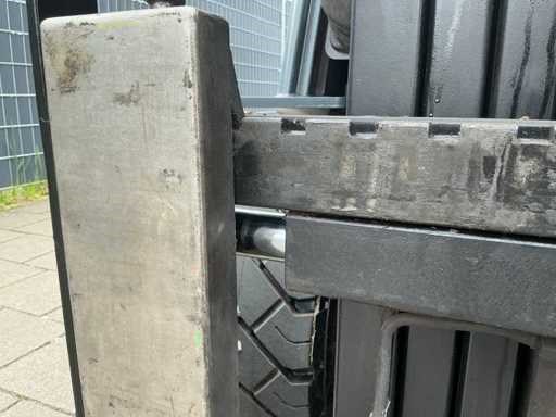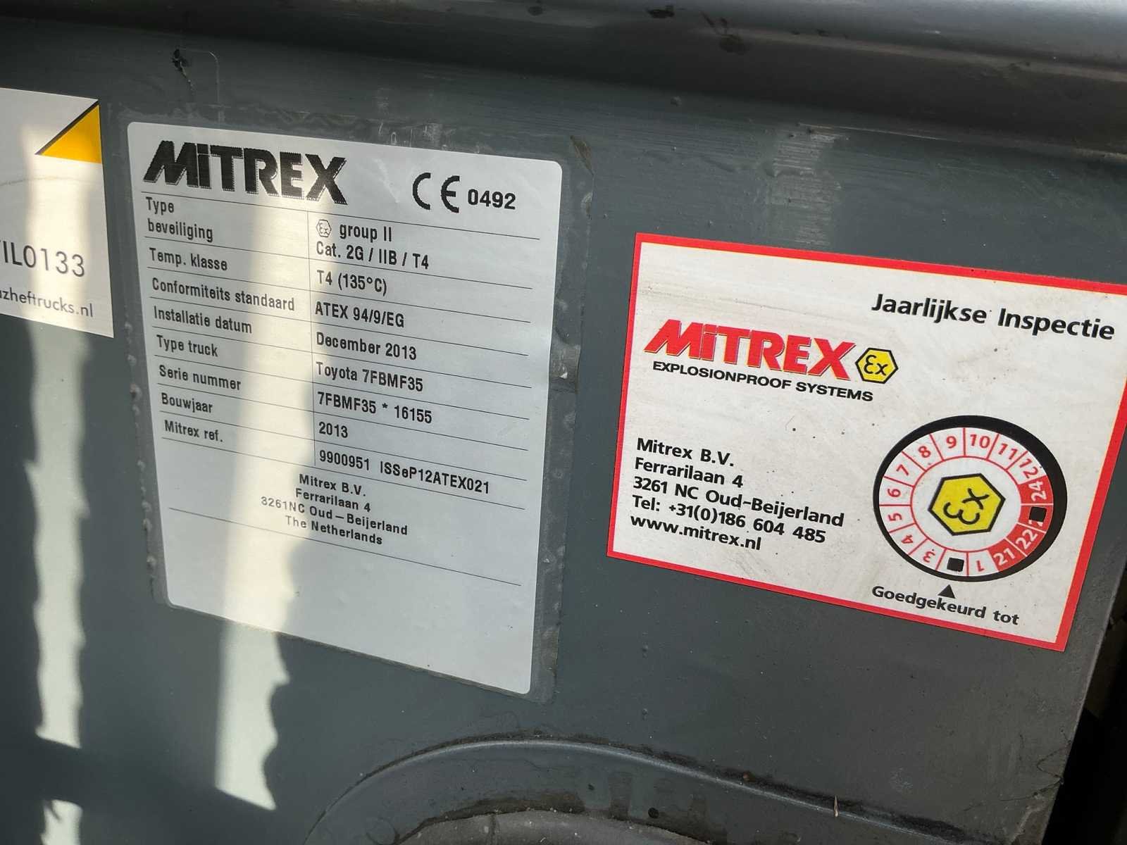 Voorzien van: accu enkele jaren geleden vervangen, accu lader, explosie vrije machine categorie 2G, ombouw gedaan door Mitrex, werkverlichting, triplex mast, rijverlichting, cabine, vol rubber banden, Nee Merk: Toyota Type: 7FBMF35 Bouwjaar: 2013 Brandstof: Elektrisch Mast: Triple Soort band: Volrubber banden Aantal wielen: 4 Afgelezen urenstand: 6132 Accu lader: true Free-lift: true Side-shift: true Triple mast: true Eigen gewicht: 6000kg Hefvermogen: 3500kg Lepellengte: 1200mm Max. hefhoogte: 4700mm Vol rubber banden: true Minimale doorrijhoogte: 2500mm Totale afmeting L: 2600mm Totale afmeting Breedte: 1150mm Totale afmeting Hoogte: 2500mm