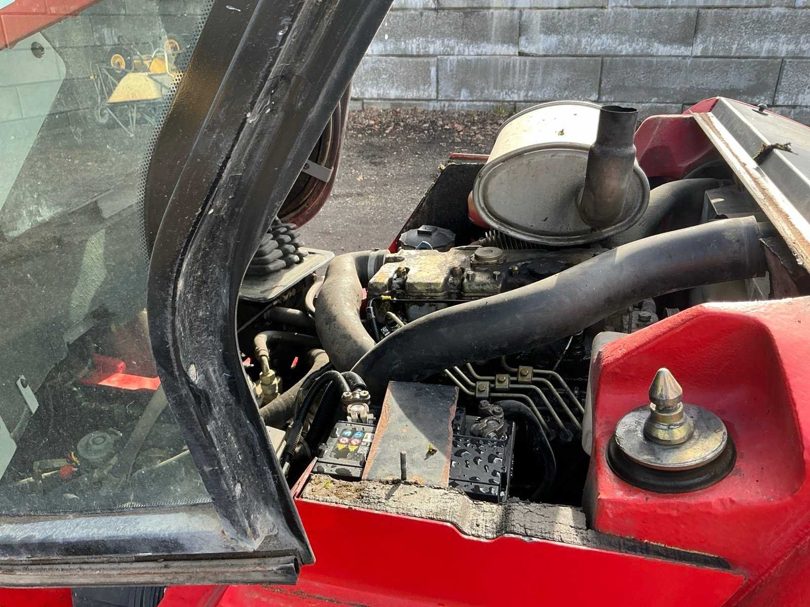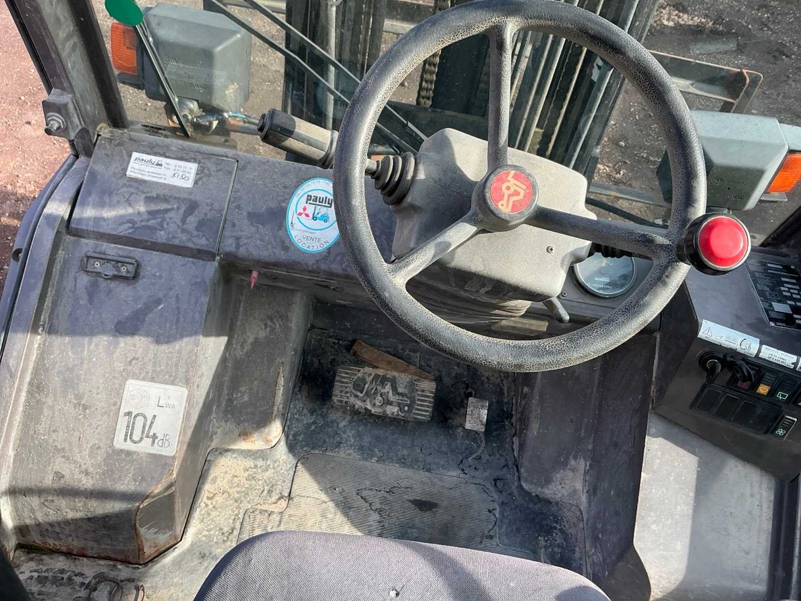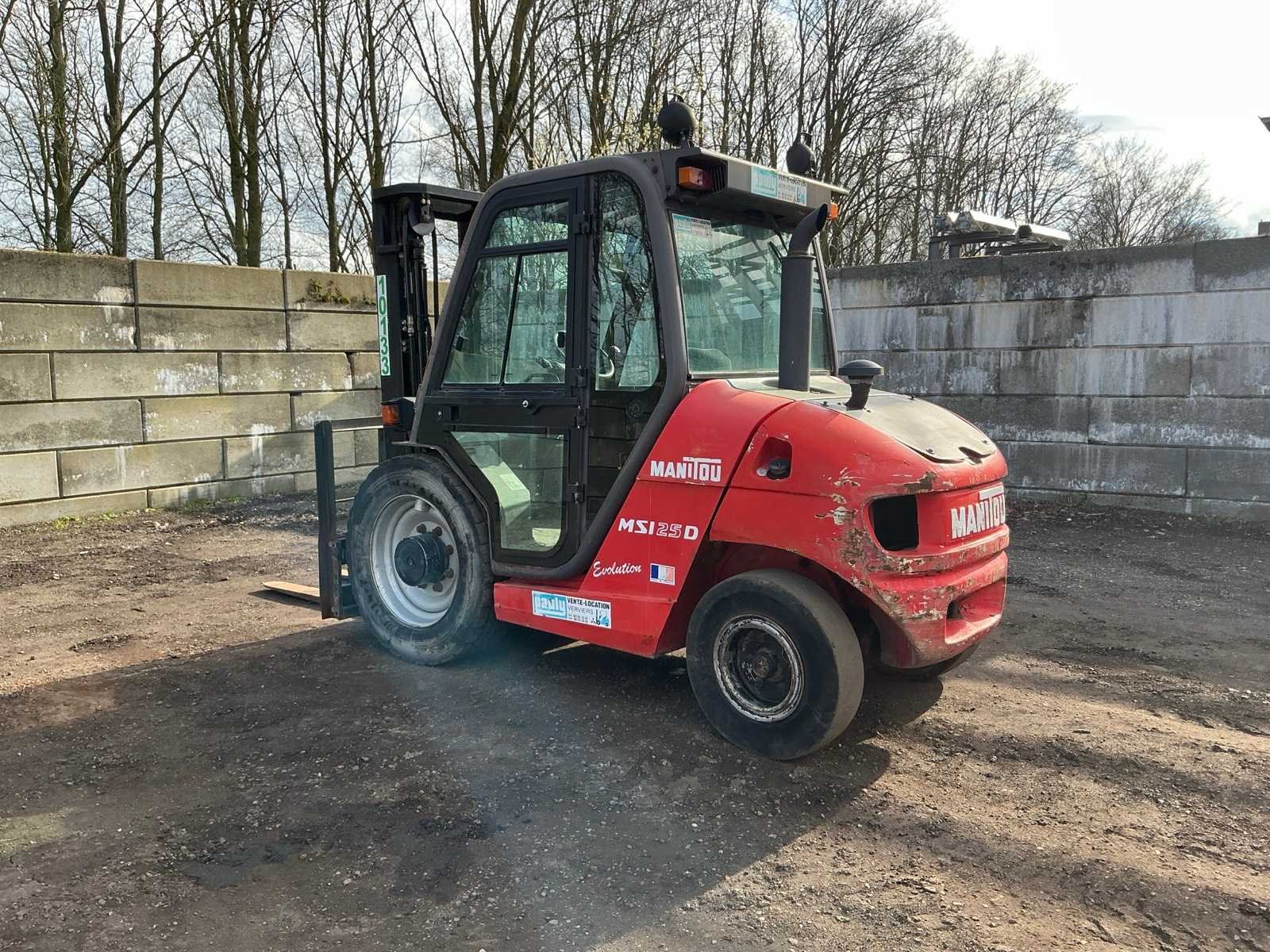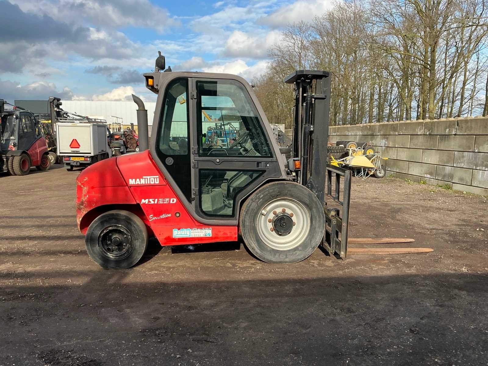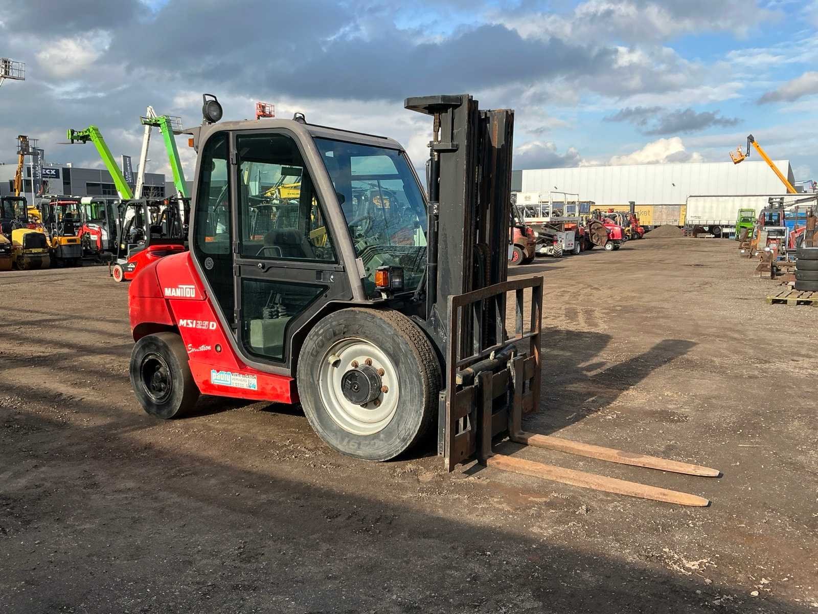 Lepels 1200mm, lepelbord 1400mm, triplex mast, side shift, werkverlichting, trekoog met pin 30mm, verwarming, elektrische cabine kanteling, Nee Merk: Manitou Type: MSI 25D Serienummer: 1210104 Brandstof: Diesel Mast: Triple Soort band: Luchtbanden Aantal wielen: 4 Afgelezen urenstand: 5235 Side-shift: true Triple mast: true Eigen gewicht: 4395kg Hefvermogen: 2500kg Lepellengte: 1200mm Max. hefhoogte: 4000mm Luchtbanden: true Minimale doorrijhoogte: 2500mm Totale afmeting L: 4200mm Totale afmeting Breedte: 1400mm Totale afmeting Hoogte: 2500mm