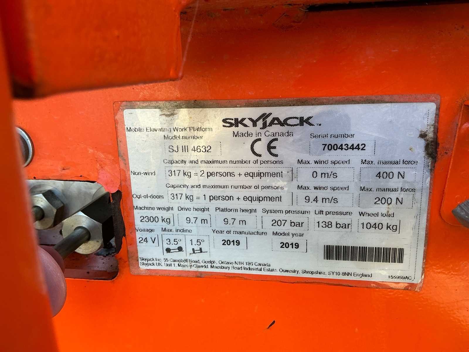 Voorzien van: nieuwe accu’s, DC-motorcontroller, dijdbaar op volle hoogte, variabele snelheid, hydraulische aandrijving op twee achterwielen, dubbele remmen, proportionele bediening voor rij- en heffuncties, uitschuifbaar platform van 1,22 m, 24V DC-voeding, bescherming tegen lage accuspanning, massieve rubberen banden Non-marking, AC-stopcontact op het platform met aardlekschakelaar, kantelalarm met uitschakeling voor rijden en heffen, hoorbaar alarm bij alle bewegingen, bevestigingspunten voor veiligheidskoorden, heftruckvakken en bevestigings-/hefogen. Nee Merk: Skyjack Type: SJ 3 4632 Bouwjaar: 2019 Serienummer: 70043442 Elektrisch: true Schaarhoogwerker: true Knikarm hoogwerker: false Werkhoogte: 9700mm Platform capaciteit: 317kg Accu lader: true Afgelezen urenstand: 56 Eigen gewicht: 2300kg