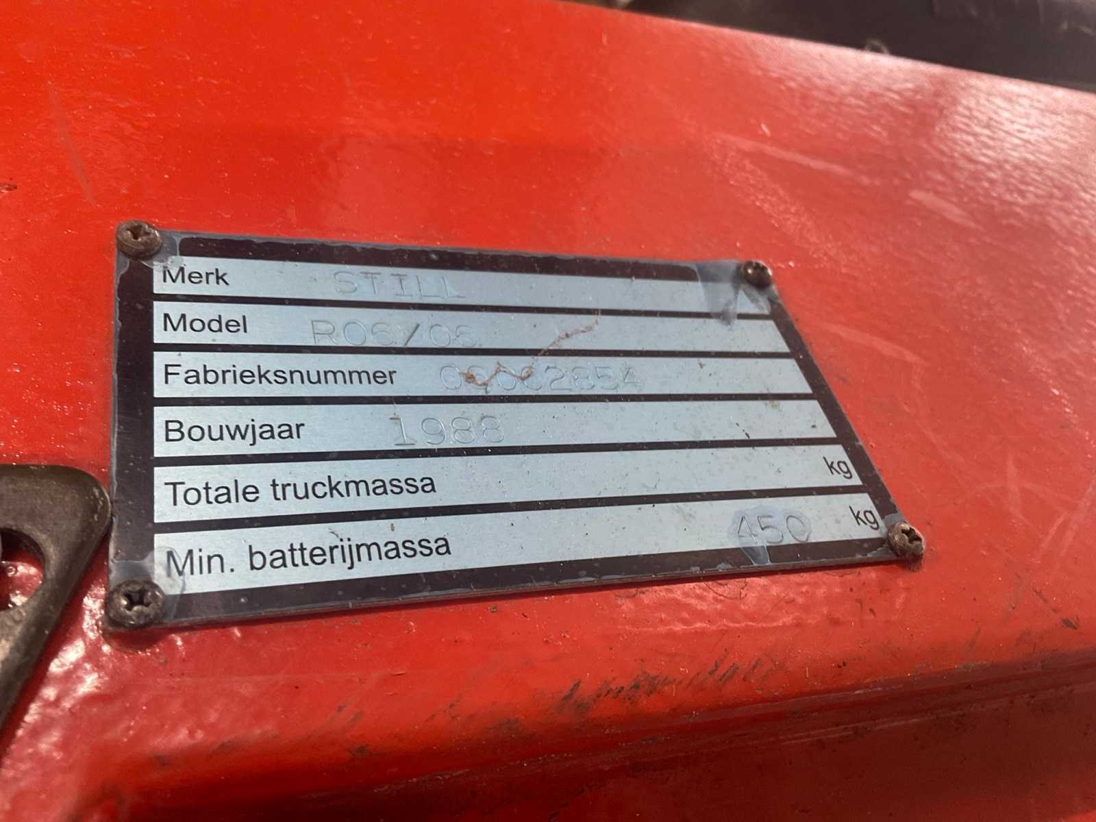 24. V. Geen. Lader Nee Merk: Still Type: R 06/06 Elektrisch: true Trekcapaciteit: 6000kg Afgelezen urenstand: 5122 Totale afmeting L: 1900mm Totale afmeting Breedte: 1000mm Totale afmeting Hoogte: 1300mm
