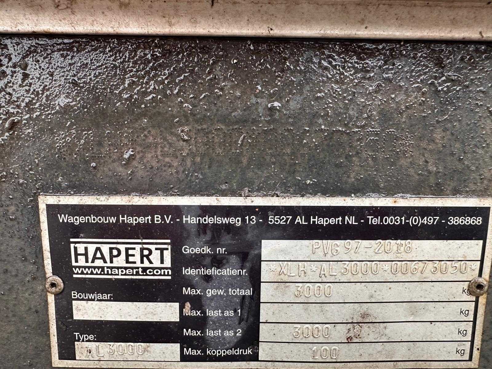Voorzien van: Trekhaakkoppeling, neuswiel, verlichting Nee Merk: Hapert Bouwjaar: 2018 Chassisnummer: XLHAL300000673050 Aantal assen: 2 Laadvermogen: 3000kg Lengte: 335cm Breedte: 180cm