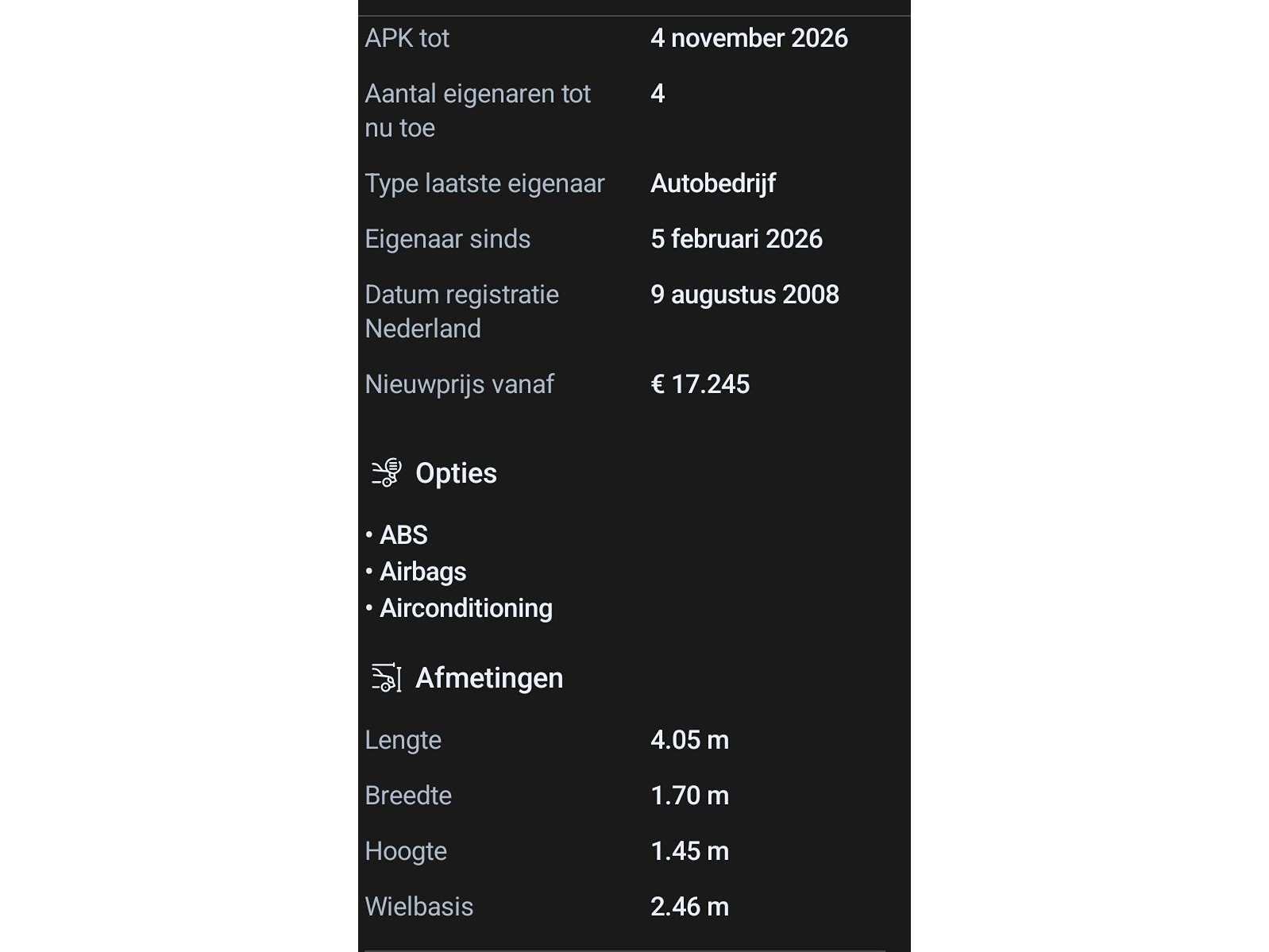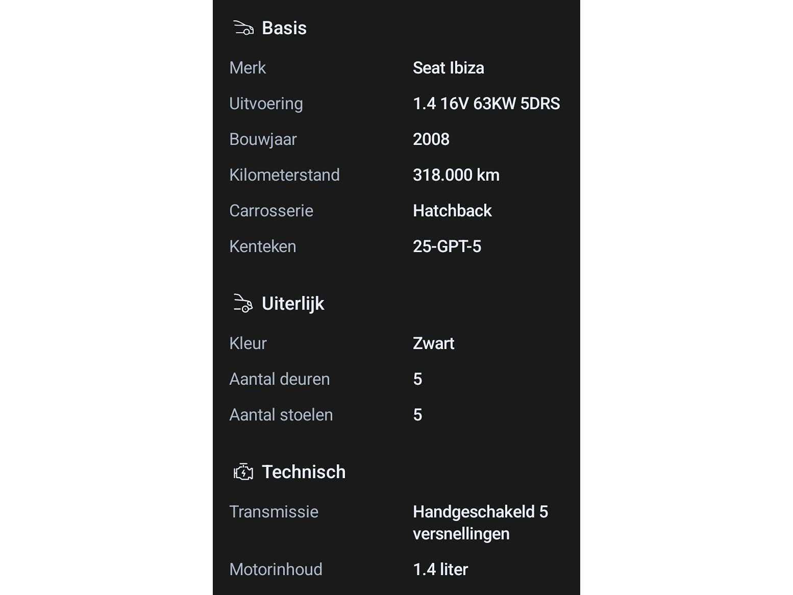 Beschikt over : Buitenspiegels elektrisch verstel- en verwarmbaar, Bumpers in carrosseriekleur, Centrale deurvergrendeling met afstandsbediening, Lichtmetalen velgen 15" Metaalkleur, mistlampen, Radio-cd/mp3 speler, Achterbank in delen neerklapbaar, Airco(automatisch), Buitentemperatuurmeter, Cruise control, Elektrische ramen voor, Stuurbekrachtiging, Stuur verstelbaar, Voorstoelen in hoogte verstelbaar, Veiligheid Airbag(s) side voor, Airbag bestuurder, Airbag passagier, Alarm klasse 1(startblokkering), Anti Blokkeer Systeem, Derde remlicht, centrale vergrendeling met afstandsbediening, stuur multifunctioneel Nee Kenteken: 25gpt5 Merk: SEAT Model: Ibiza Type: 1.4 Sport-up Bouwjaar: 2008 Afgelezen kilometerstand: 317683km Cilinderinhoud: 1390cc Vermogen (kW): 63kW Brandstof: Benzine Chassisnummer: VSSZZZ6JZ9R016997 Datum eerste toelating: 2008-08-09 APK vervaldatum: 2026-11-04 Vermogen (pk): 84hp Aantal zitplaatsen: 5 Maximaal trekgewicht ongeremd: 1000kg Maximaal trekgewicht geremd: 550kg Kleur: zwart Transmissie: Handgeschakeld (5) Emissieklasse: 4 Aantal deuren: 4 Ledig gewicht: 1000kg Bruto BPM (NL): 3458€ Aantal cilinders: 4 Carrosserie: MPV Carfax Link: https://was.carfax.eu/v0/api/ccdid/5100016408/svc/201/vinreg/25GPT5/checksum/eyJhbGciOiJIUzI1NiIsInR5cCI6IkpXVCJ9.eyJleHAiOjE3NzgyNDgyODl9.bbKmUjuQTgeoPquurlBmASwI52ilOJBQa8_vbvERL6A