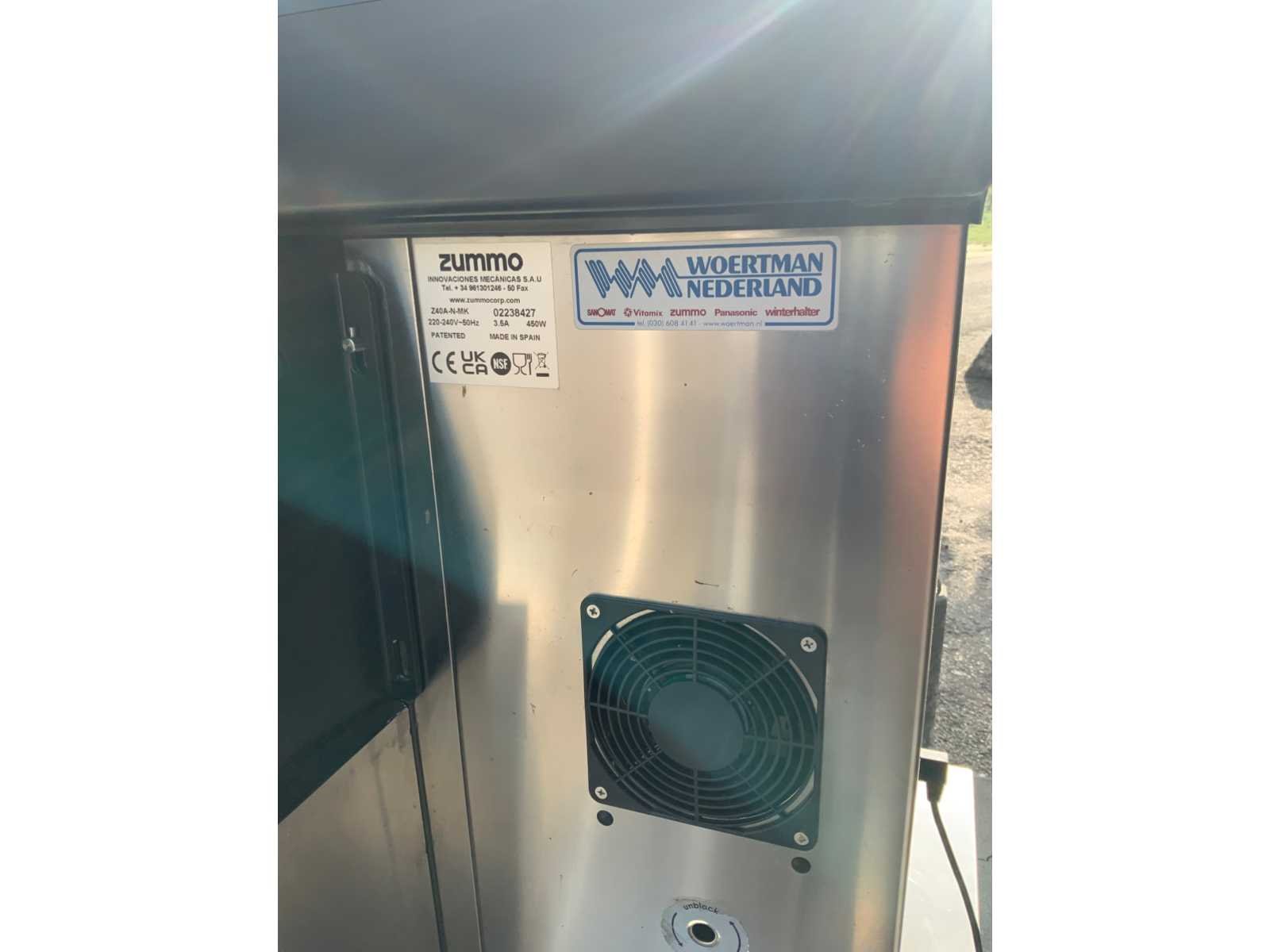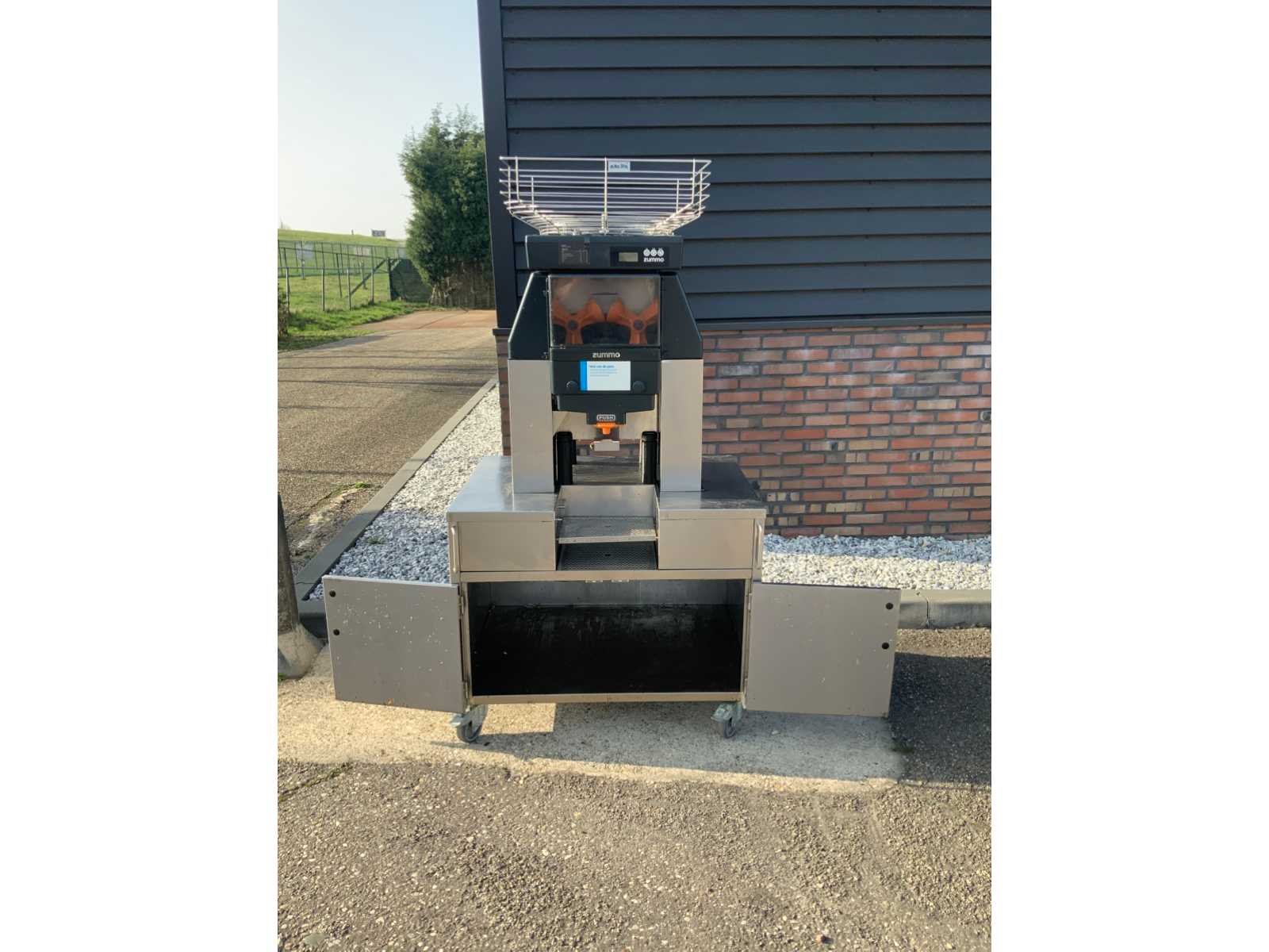 Zummo sinaasappelpersmachine met flessenrek. De Zummo Z40 is het snelste model, deze sinaasappelpers perst moeiteloos 40 sinaasappels per minuut. Uitstekend voor in supermarkten en horecagelegenheden waar de vraag groot is en snelheid gewenst is. Tevens ideaal voor scholen, tankstations, treinstations, ziekenhuizen en verpleeghuizen. Uniek perssysteem dat wereldwijd is gepatenteerd, snijdt het fruit in tweeën en perst de sinaasappel rechtstandig zonder de schil te beschadigen. Dit zorgt voor heerlijk sinaasappelsap zonder een bittere bijsmaak. Perst sinaasappels, granaatappels en optioneel ook mandarijnen of limoenen. Bezichtigen op afspraak. Nee Merk: Zummo Type: Z40 Bouwjaar: 2024 Serienummer: 02238427 Aansluiting: 230V Totale afmeting L: 700mm Totale afmeting Breedte: 950mm Totale afmeting Hoogte: 1800mm