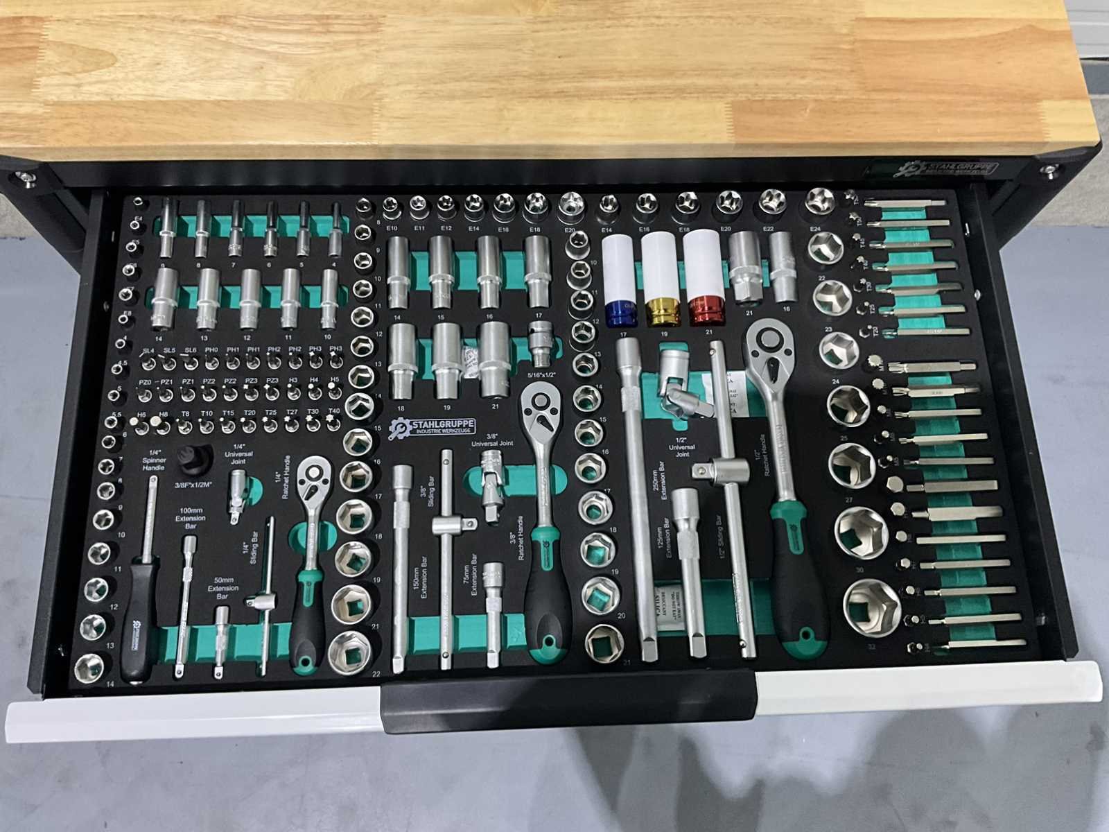 Staat: ongebruikt, in de originele verpakking Merk: Stahlgruppe Aantal laden: 7 laden Aantal gevulde laden: 6 gevulde laden Gereedschap: Chrome Vanadium gereedschap Inhoud: 3 dopsleutelsets (1/2”, 3/8” & 1/4”) ring- steeksleutelset (6-32 mm) ringratel-steeksleutelset (8-19 mm) diverse tangen (12 stuks) schuifmaat (0-150 mm * 0,02 mm) schroevendraaiers (21 stuks) T-greep Torxsleutels (T10-T45) T-greep dopsleutels (8-14 mm) T-greep Inbussleutels (2-8mm) krachtdoppen (10-32 mm) momentsleutel (0-300 Nm) Nee Merk: Stahlgruppe Type: S36 Bouwjaar: 2026 Aantal laden: 7 Met inhoud: true