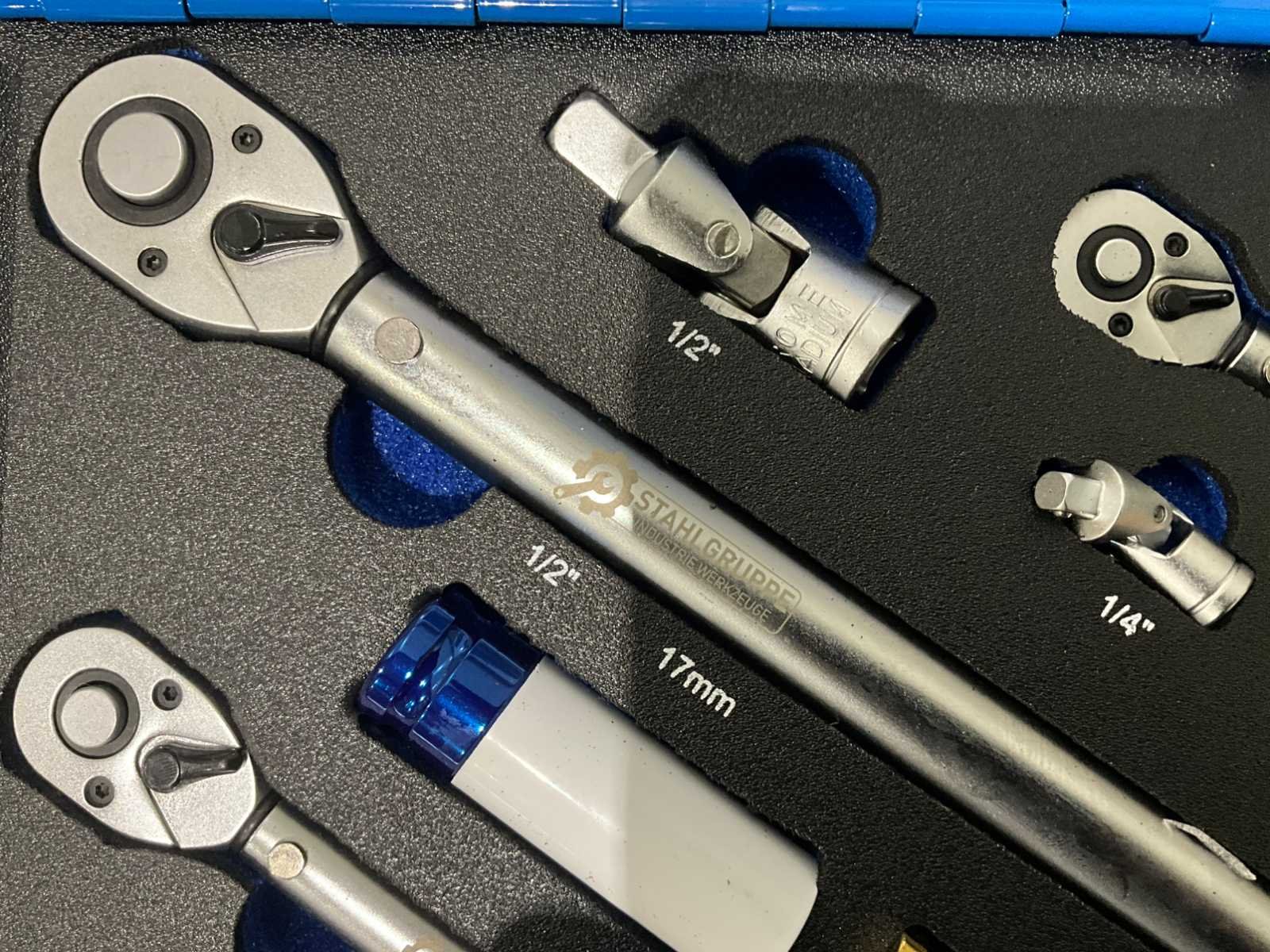 Ongebruikt 1x 1/4" momentsleutel met 72-tands aandrijving (bereik: 5-25 N/M) 1x 3/8" momentsleutel met 72-tands aandrijving (bereik: 10-60 N/M) 1x 1/2" momentsleutel met 72-tands aandrijving (bereik: 40-220 N/M) 3x Impactdoppen (1/2"): 17mm, 19mm, 21mm 3x Dopsleutels (1/2"): 17mm, 19mm, 21mm 3x Verlengstukken: 1/4" x 3", 3/8" x 3", 1/2" x 5" 2x Universele koppelingen (1/4" & 1/2") 16x Bitdoppen (1/4"): PH1, PH2, PH3, T10, T15, T20, T25, T30, H2, H2.5, H3, H4, H5, H6, H8, H10 2x Bougiesleutels (14mm, 16mm) met dunne wand, 3/8" aandrijving voor BMW Nee Merk: Stahlgruppe Type: 32PC Bouwjaar: 2026 Lengte: 45 Breedte: 33 Hoogte: 5
