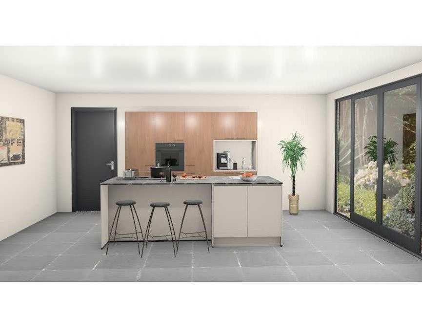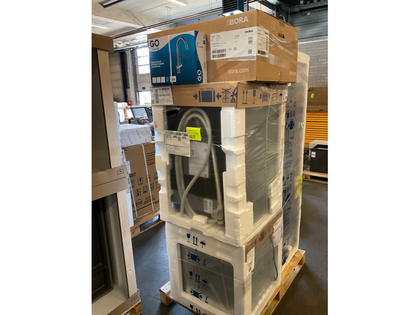 Indeling wandopstelling: kleurrijker cognacbruin imitatie; 3 hoge kasten; 1 onderkast; 2 bovenkasten; indeling kook-spoeleiland: kleur zandgrijs mat; 3 onderkasten waarvan 1 ladekast; barzitdeel; inbouwapparatuur: Bora 4-zone inductie kookplaat met afzuiging; type Puru; Whirlpool inbouwoven; type WO15S8HM2SBA; inhoud 73 liter; Whirlpool inbouw koelvriescombinatie; type WHC18D051A; inhoud 189/79 liter; Bosch inbouwvaatwasser; type SBV4ECX23E; Let op: keuken wordt geleverd in verpakking; er staat geen showmodel opgesteld; zonder de transportwagen. Nee Merk: Schüller Lengte: 273cm Kraan: eengreeps Gootsteen: Kemie Regular Aanrechtblad: Kemie composiet kleur Pearl Lava gepolijst Lengte kookeiland: 264cm Breedte kookeiland: 100cm