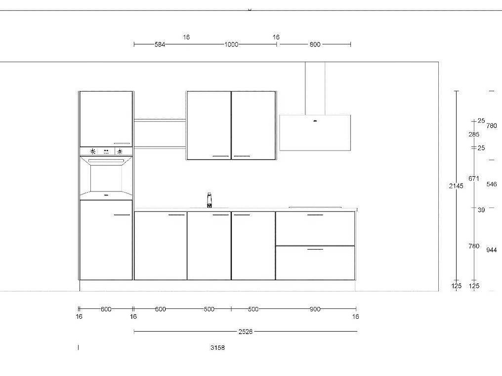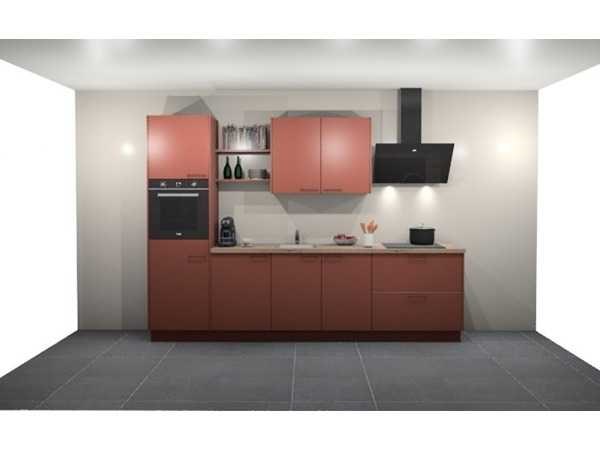 Indeling: 4 onderkasten; waarvan 1 ladenkast; 1 bovenkast ; 2 wandplanken; afm. 58x25 cm; 1 hoge zijkast; pelgrim 4-pits gaskookplaat; type GK415RVSA; Indesit afzuigkap; type IHVP873FLMK; Indesit inbouwoven; type IFW4841JHBL; Siemens koelkast; type KI21R2FEO; cap. 136 liter; Let op: keuken geleverd in verpakking op 3 pallets; er staat geen showmodel opgesteld Nee Merk: Schuller Lengte: 315cm Kraan: eengreeps Gootsteen: opbouw Aanrechtblad: met hardkunststof toplaag kleur Patagonië-eiken imitatie Hoofdkleur: Oriëntrood mat
