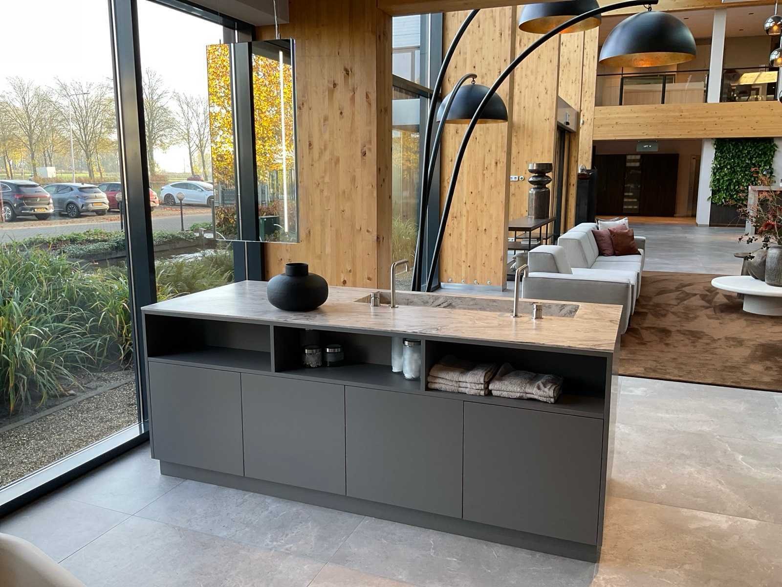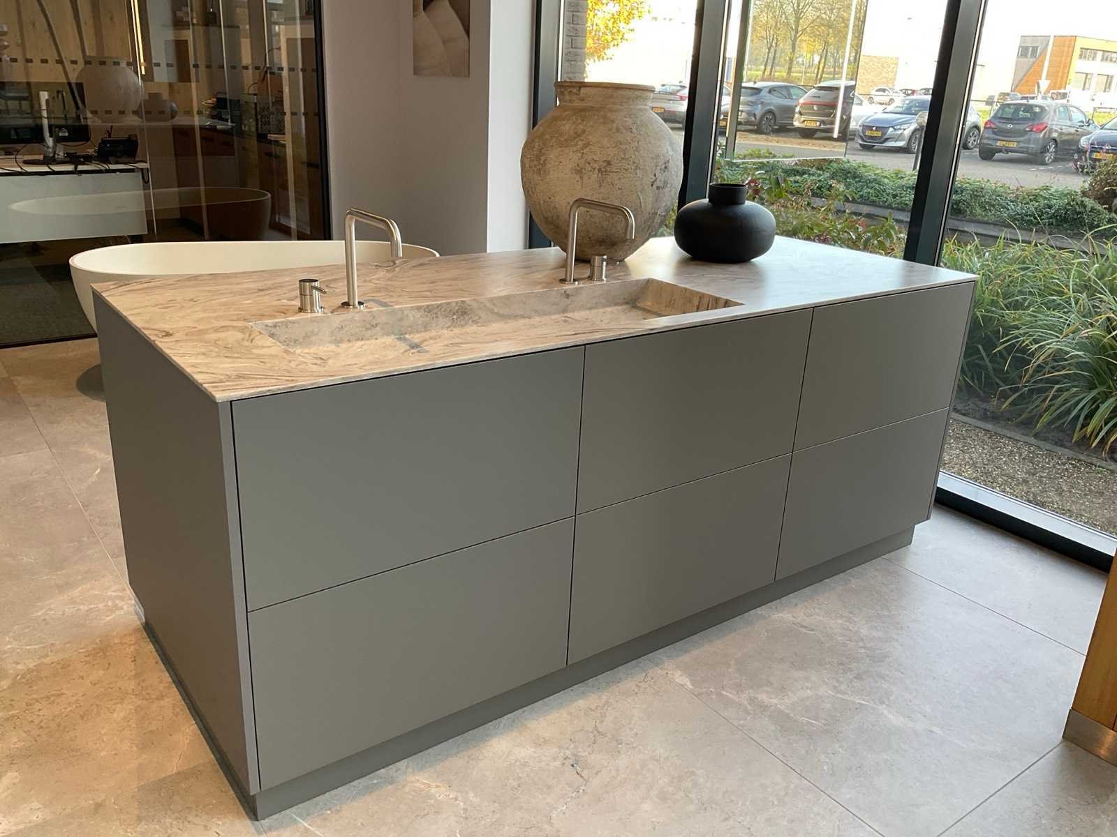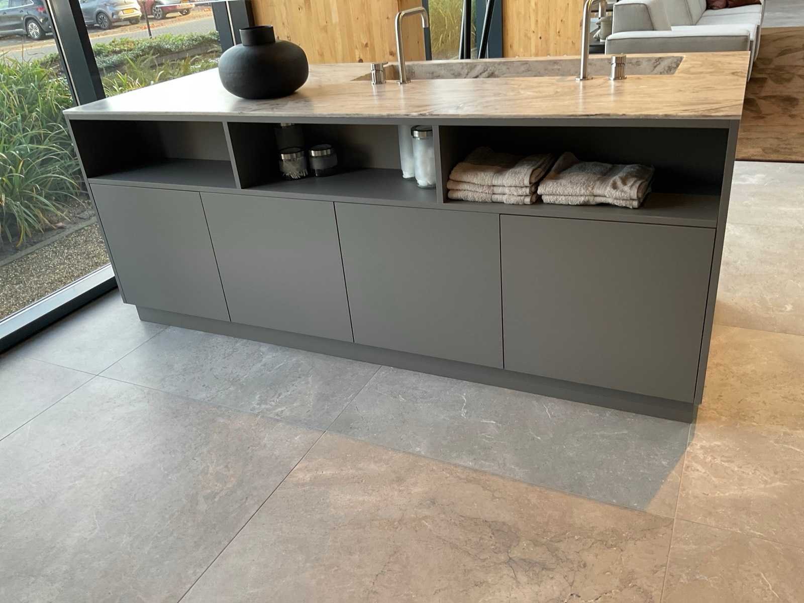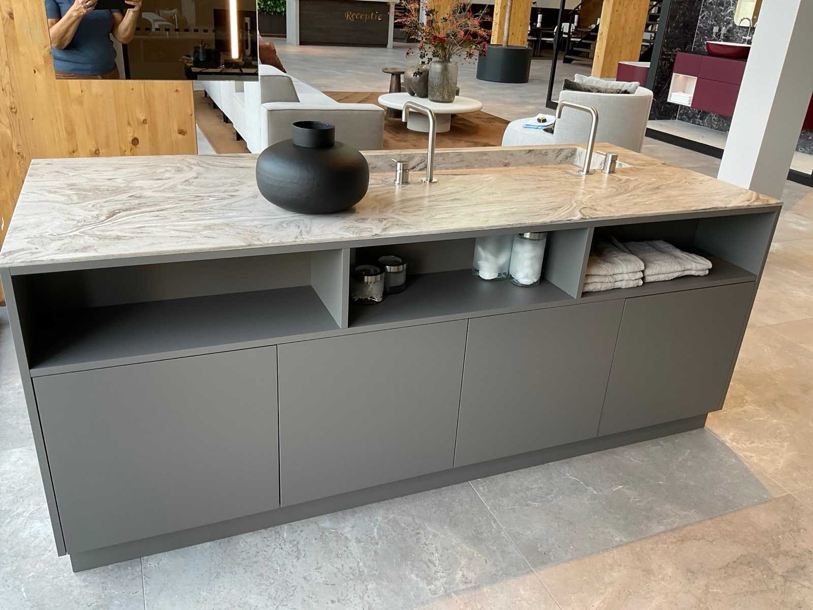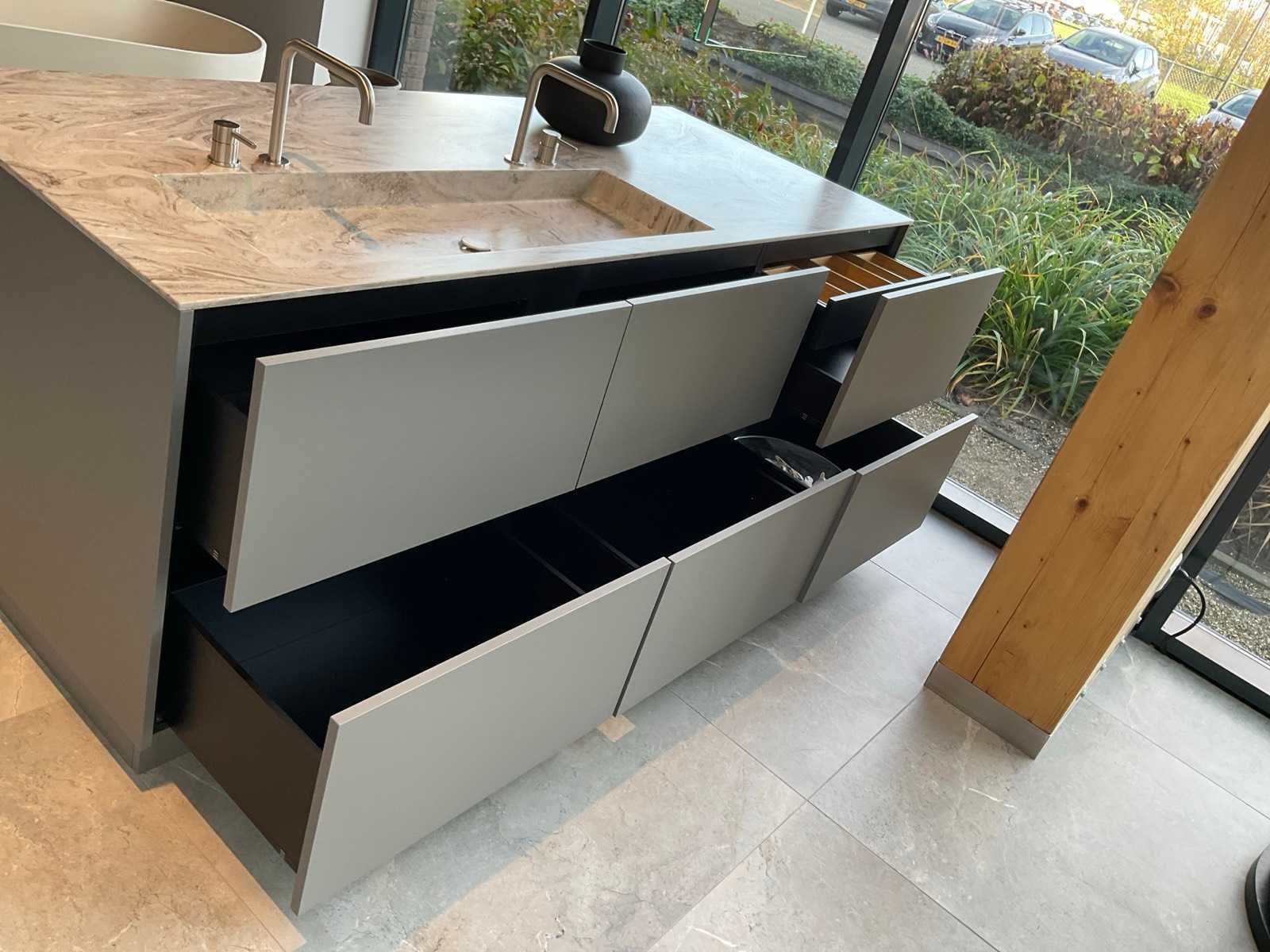 Vrijstaand meubel met 6 laden; 1 binnenlade en stopcontact; 2 onderkasten en 3 open regaalvakken; push-to-open; Corian werkblad kleur smoke drift; 2 Jee-O wastafelmengkranen rvs; Mene vrijhangende spiegelen verlichting; afm. 50x100 mm; Reeds gedemonteerd . Nee Merk: Elis Hoogte: 90cm Lengte: 222cm Breedte: 91cm