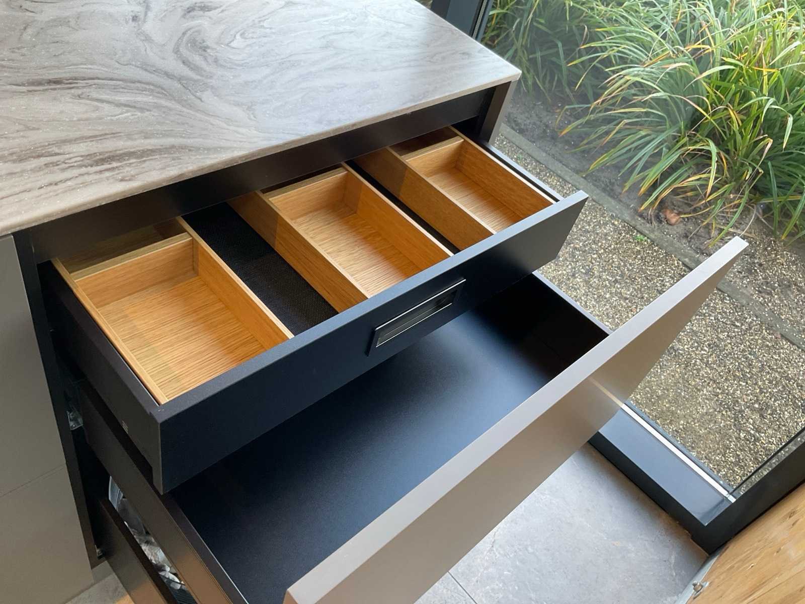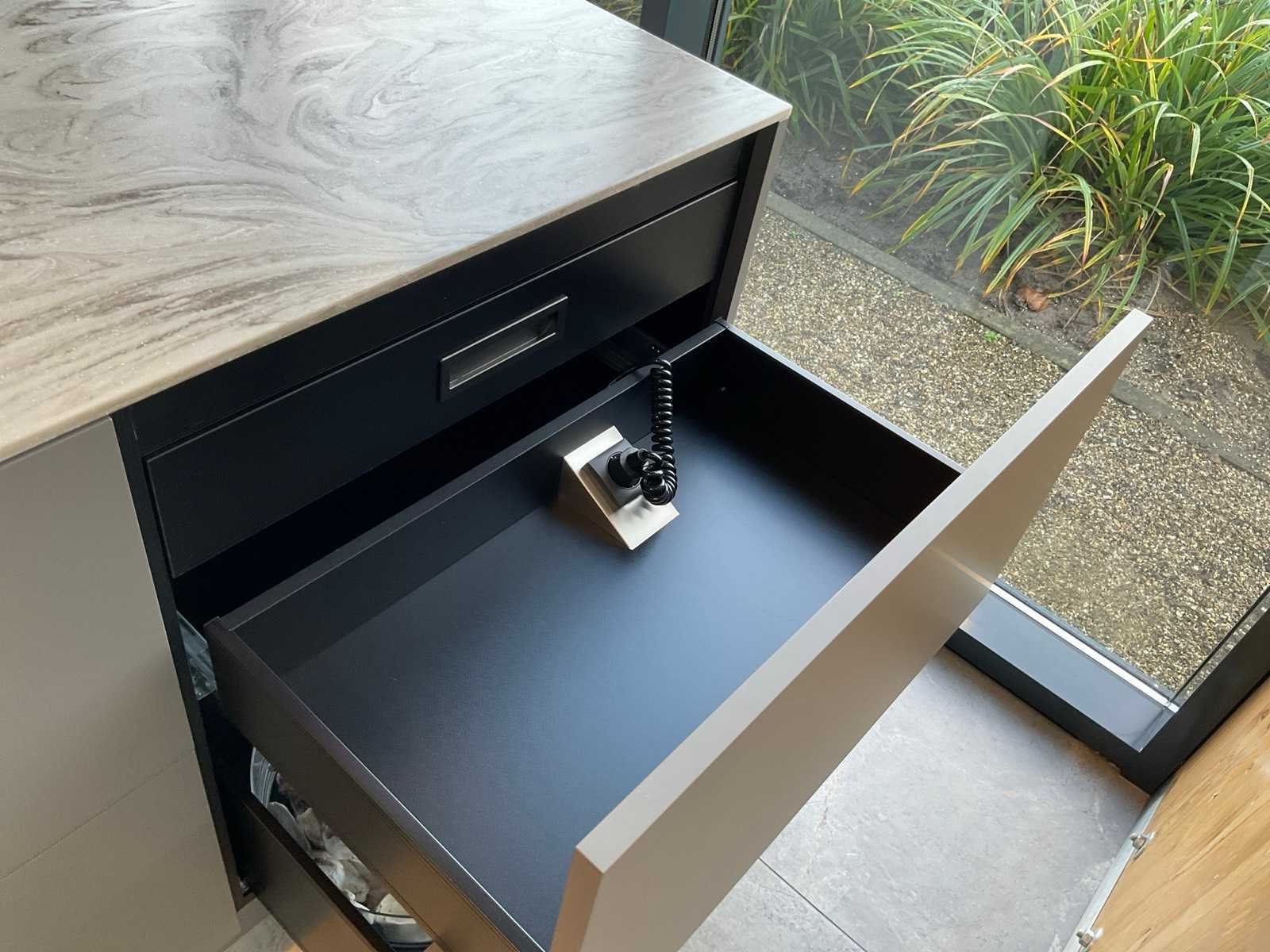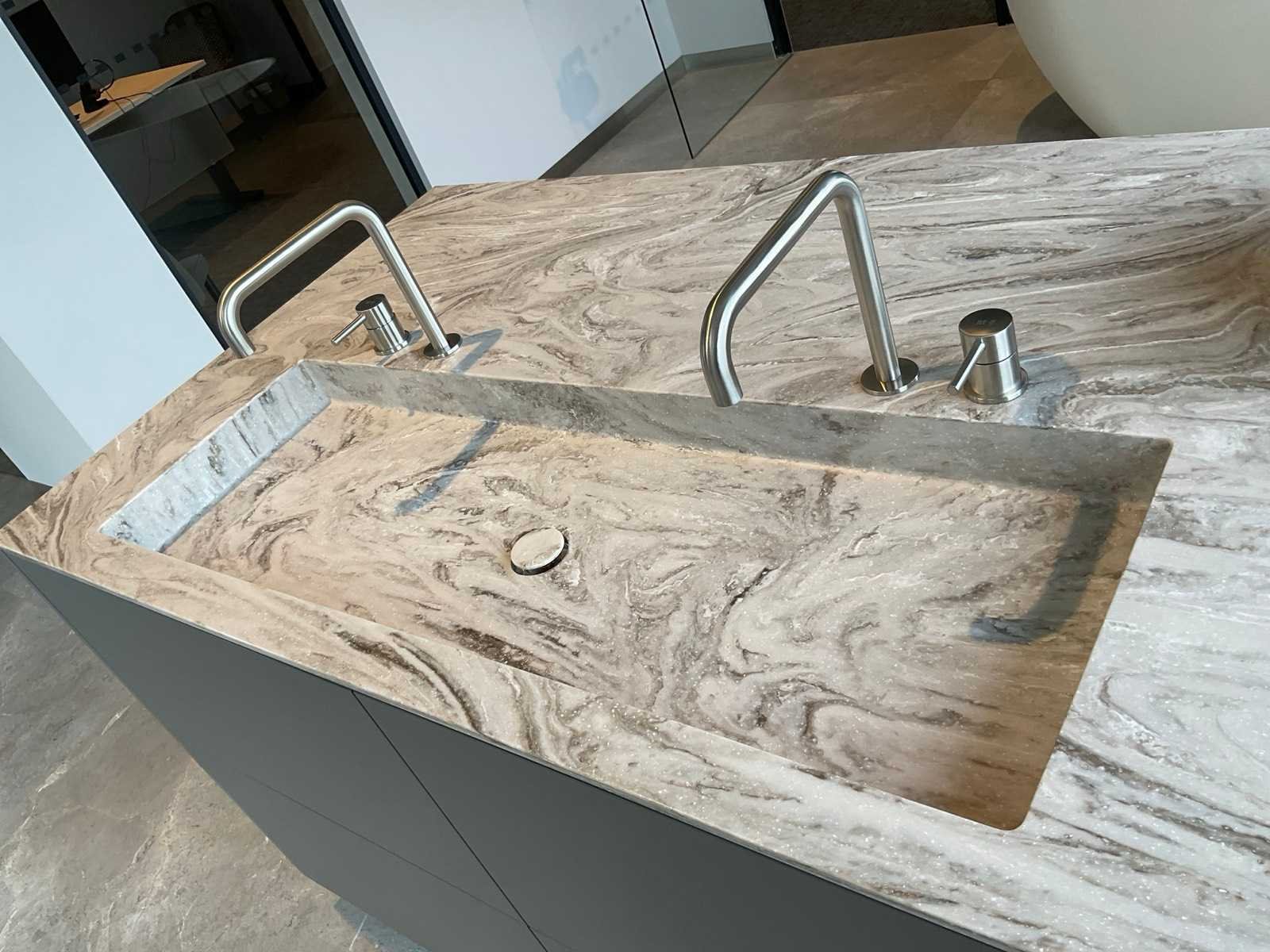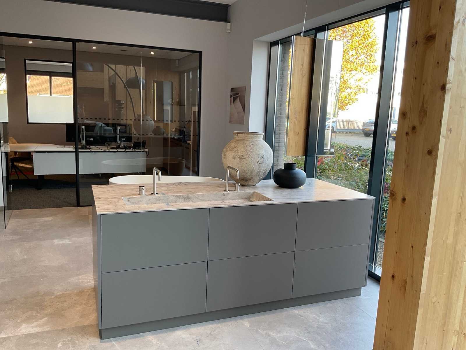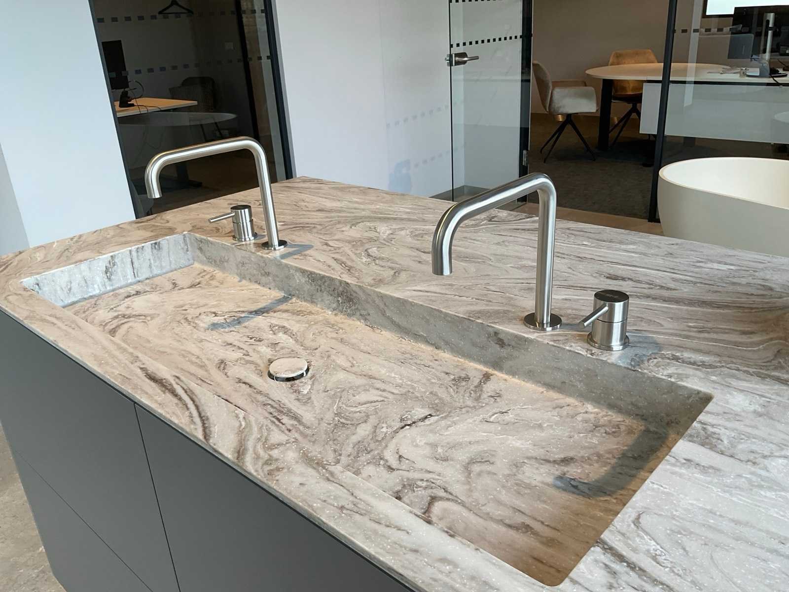 Vrijstaand meubel met 6 laden; 1 binnenlade en stopcontact; 2 onderkasten en 3 open regaalvakken; push-to-open; Corian werkblad kleur smoke drift; 2 Jee-O wastafelmengkranen rvs; Mene vrijhangende spiegelen verlichting; afm. 50x100 mm; Reeds gedemonteerd . Nee Merk: Elis Hoogte: 90cm Lengte: 222cm Breedte: 91cm