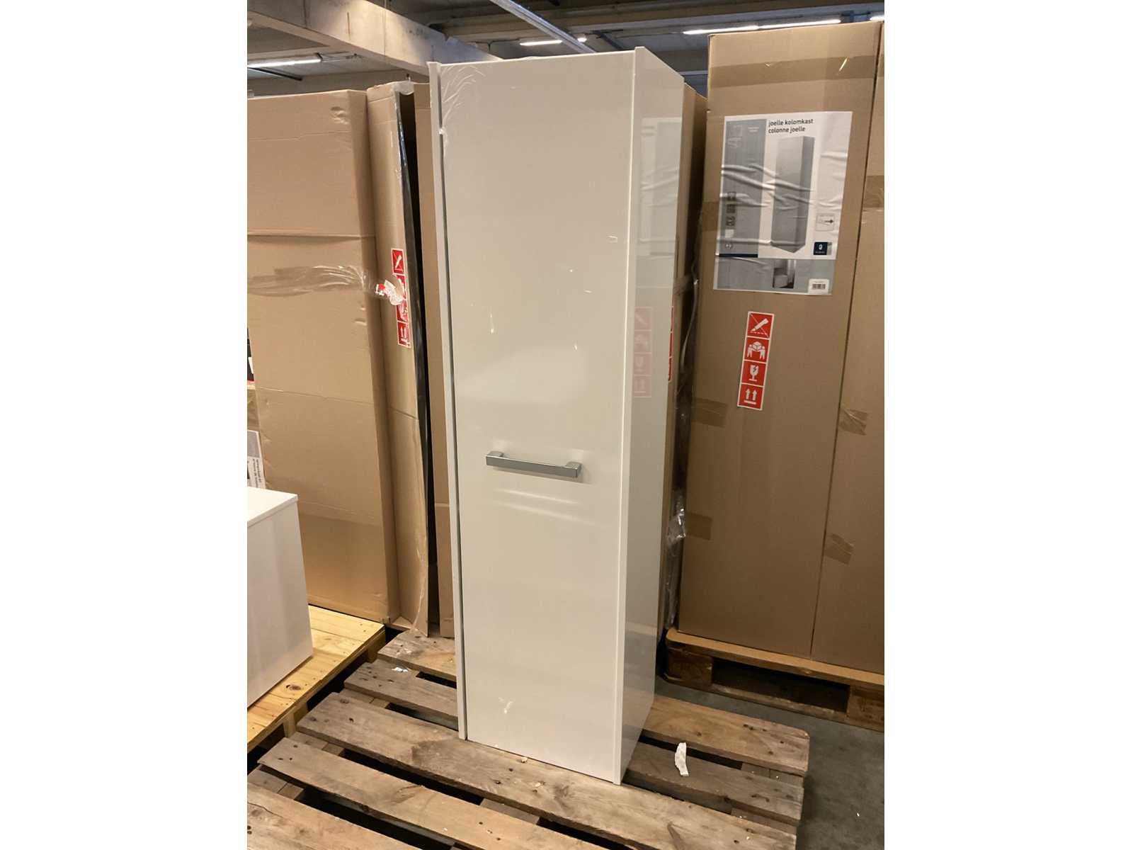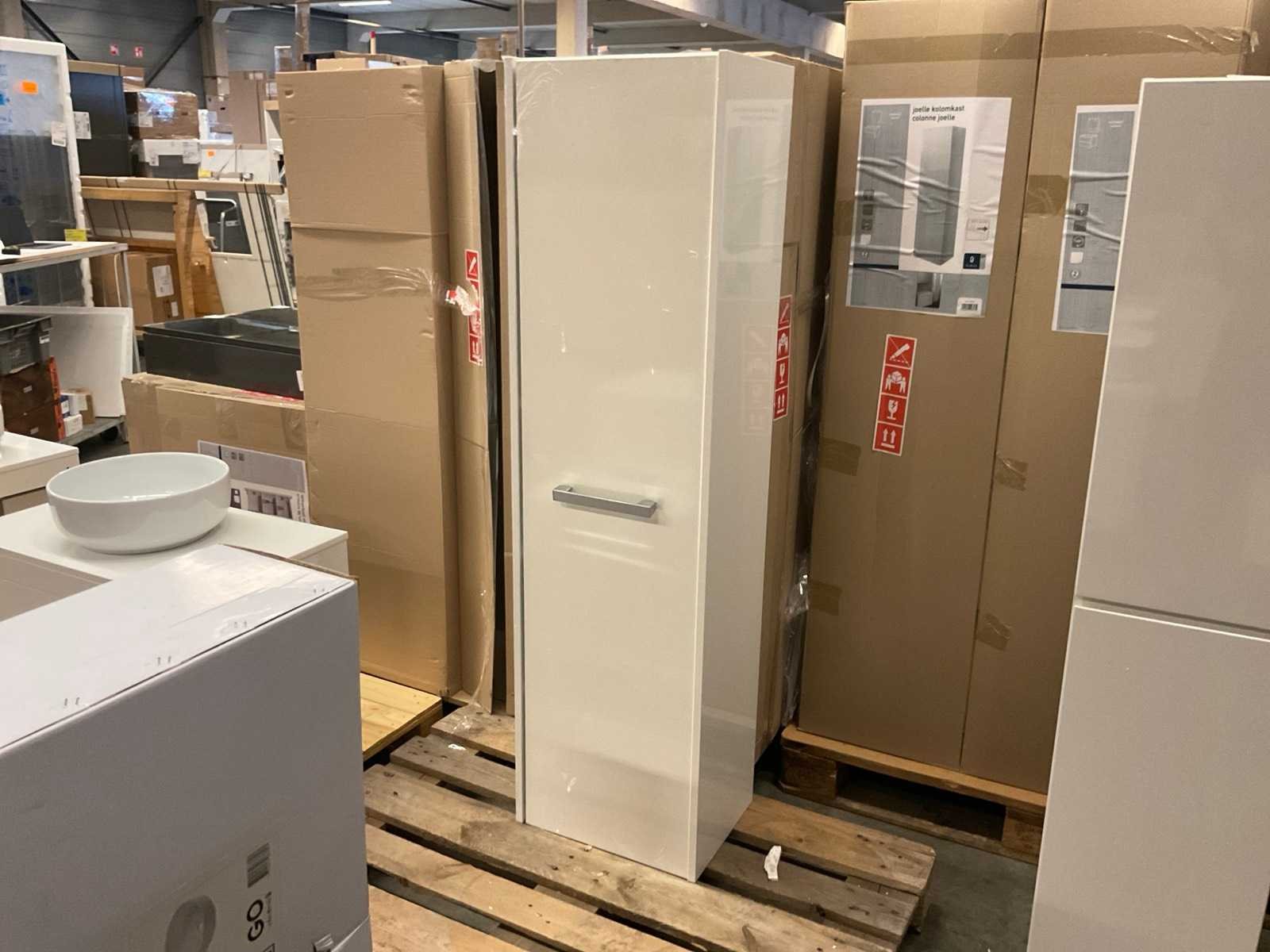 1 deur met 4 legplanken; showmodel Nee Merk: van Marcke Model: Selena Kleur: hoogglans wit Lengte: 40cm Breedte: 31cm Hoogte: 150cm