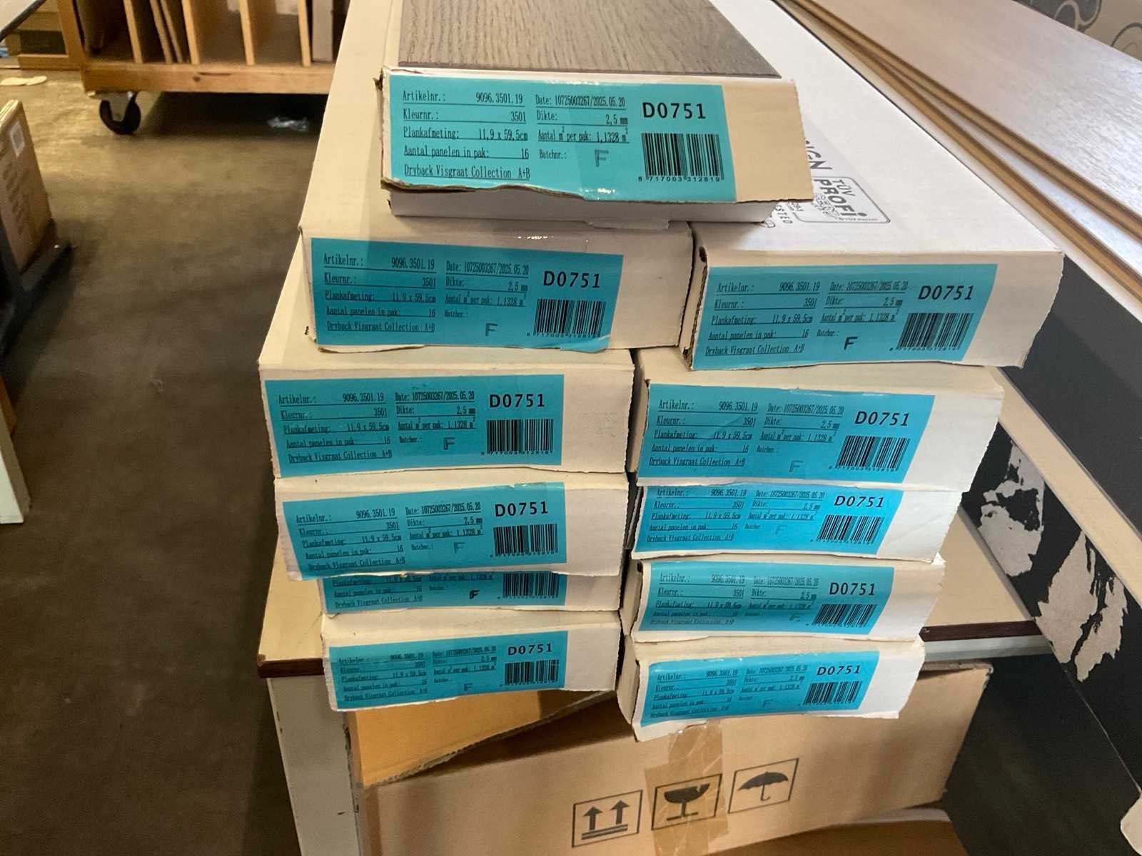 1,13 m² per pak; totaal 11 pakken ca. 12 m² Nee Merk: Design Floor Model: D7051 Lengte: 595mm Breedte: 119mm Hoogte: 2.5mm