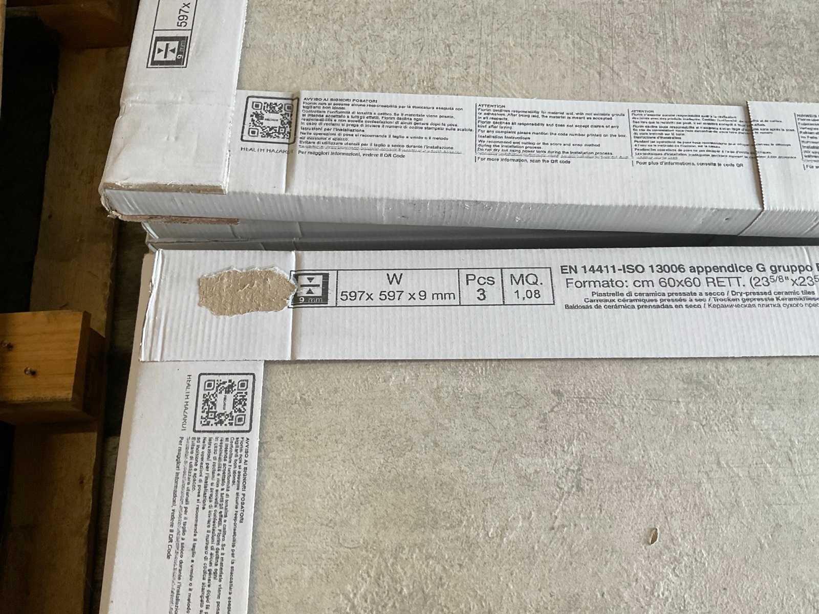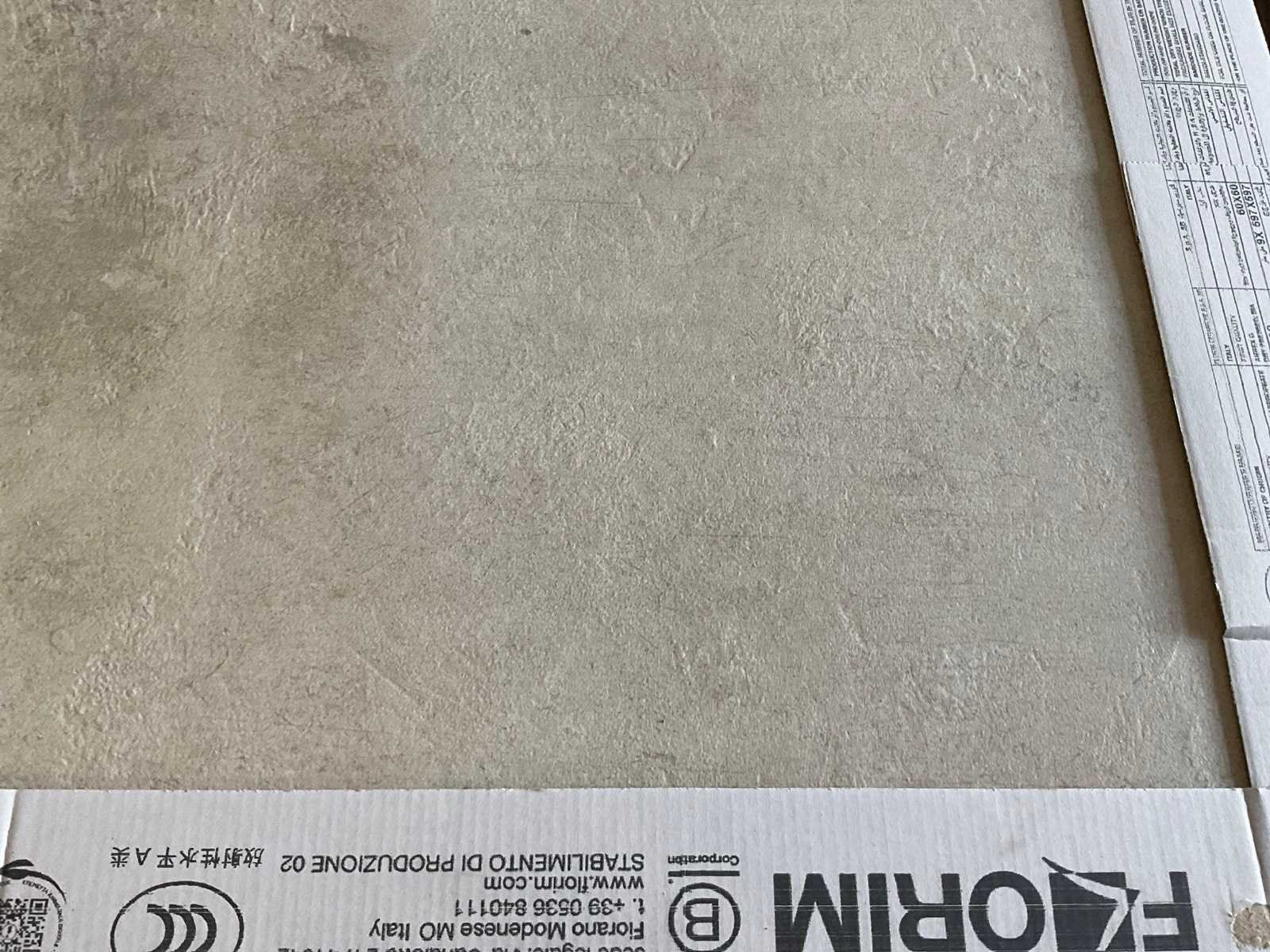 1,08 m² per pak; totaal 13 pakken ca. 14 m² Nee Merk: Forim Kleur: Mati Sable Lengte: 600mm Breedte: 600mm Dikte: 9mm