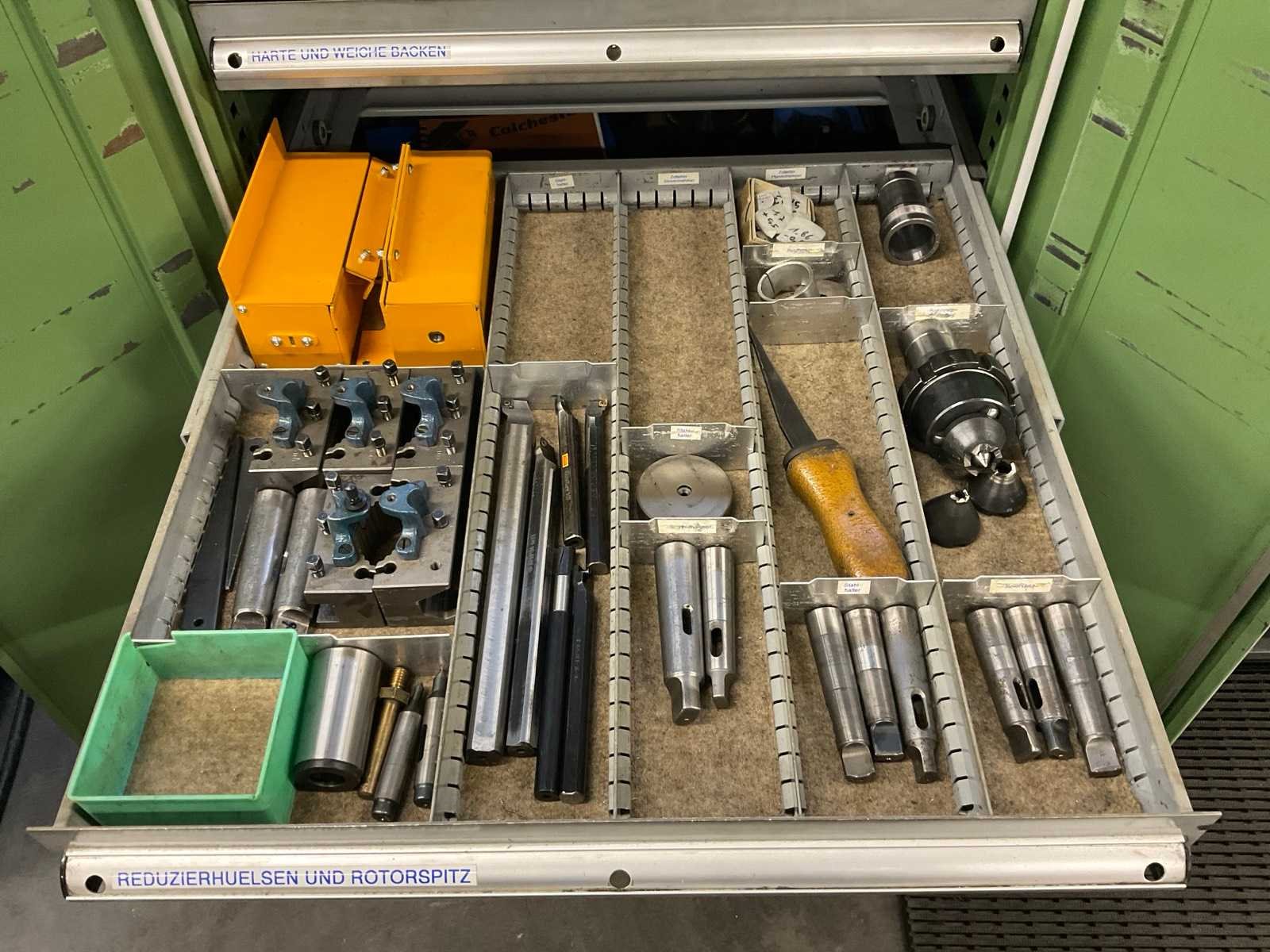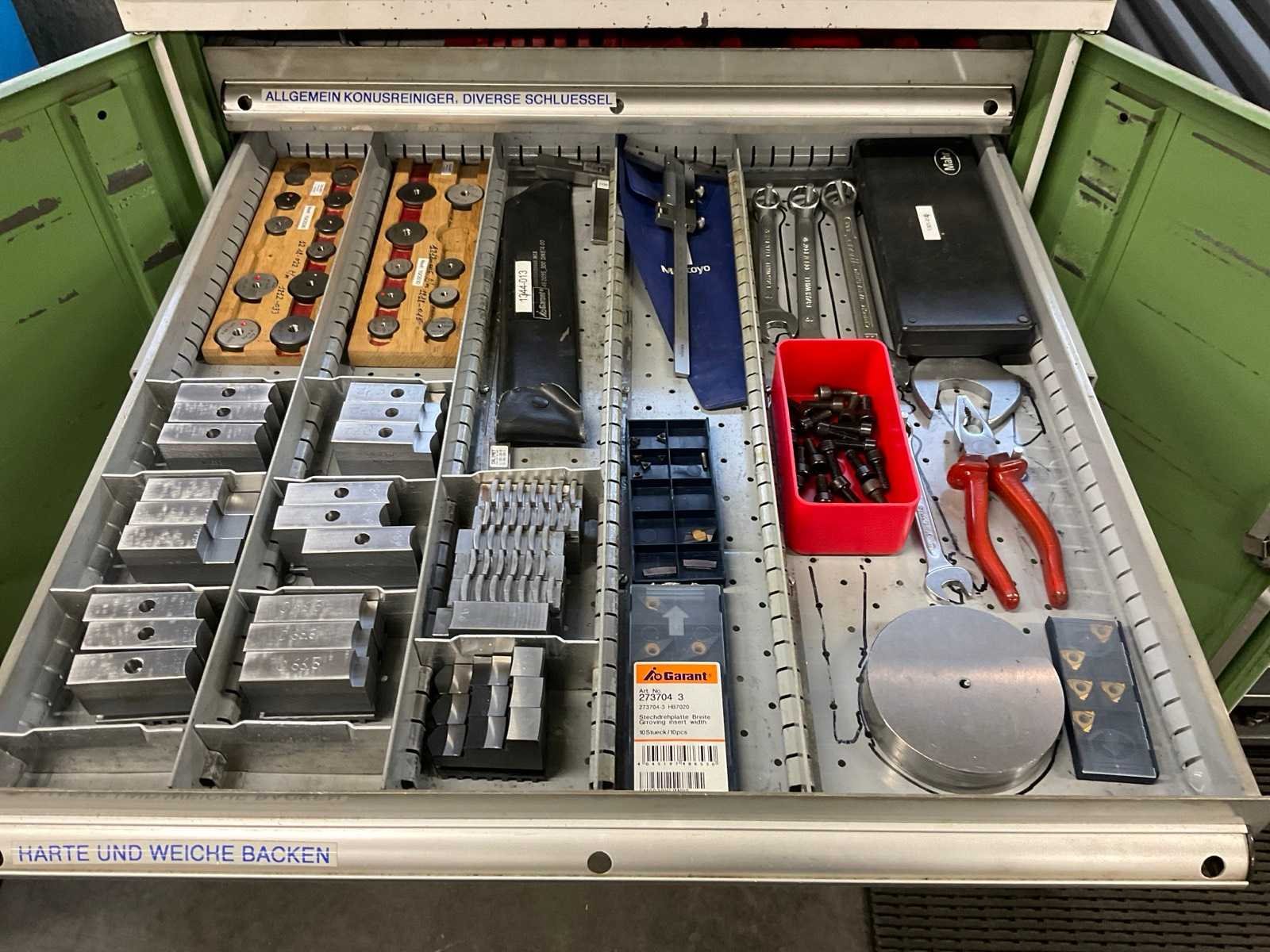Inclusief kast met inhoud 75x71x100 cm. No Merk: Colchester Type: Master 3250 Draailengte: 650mm Aantal gereedschapwisselstations: 3 Koelmiddelpomp: true Aansluiting: 400V Afmeting l: 1400mm Afmeting b: 2000mm Afmeting h: 1500mm
