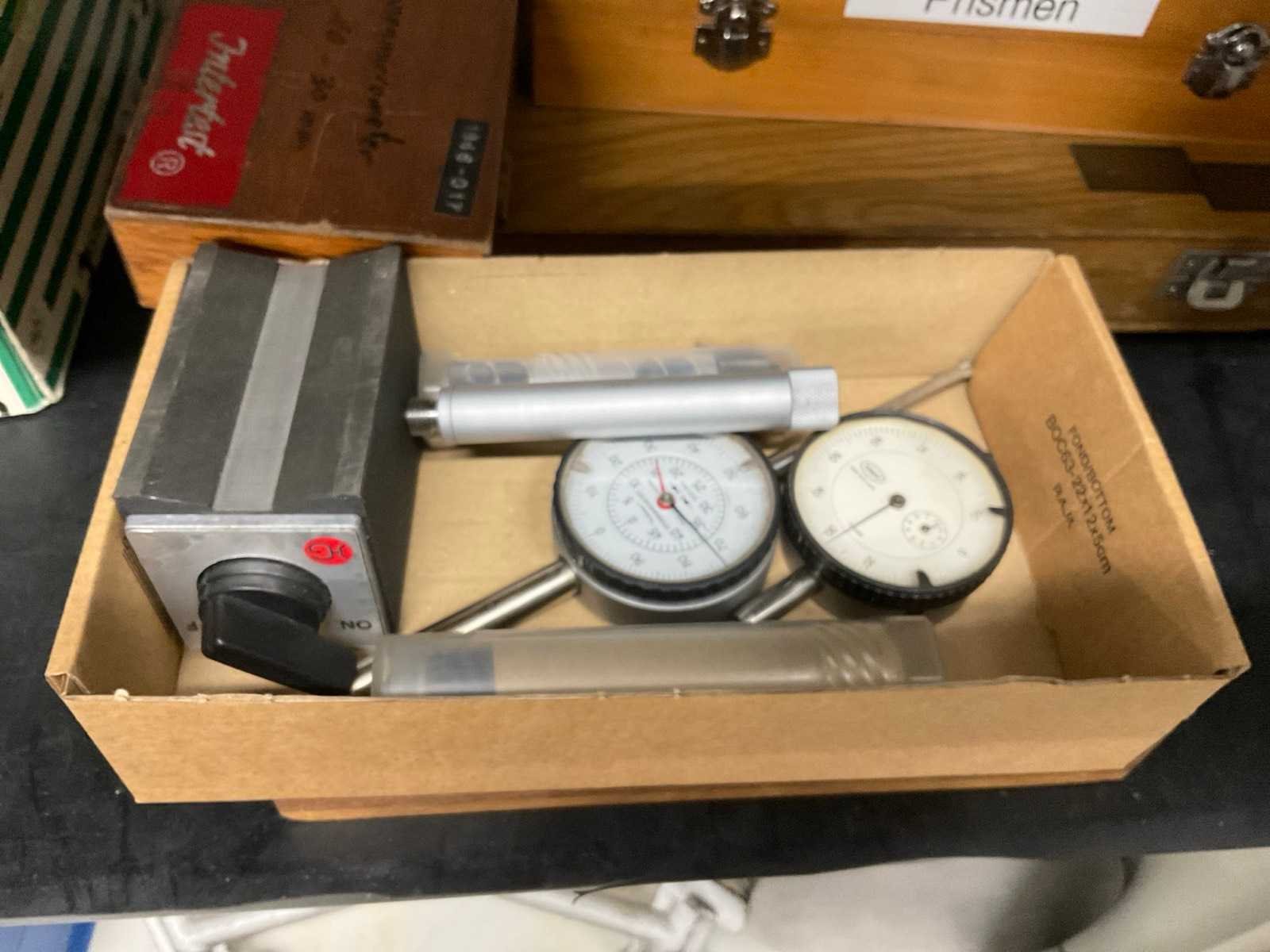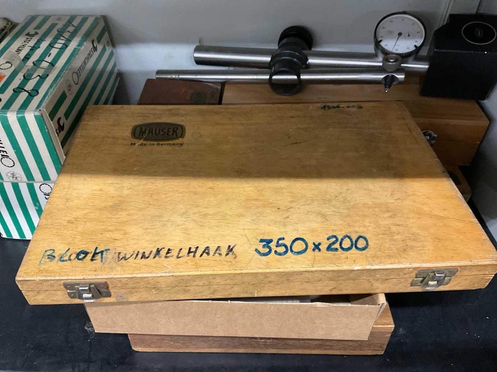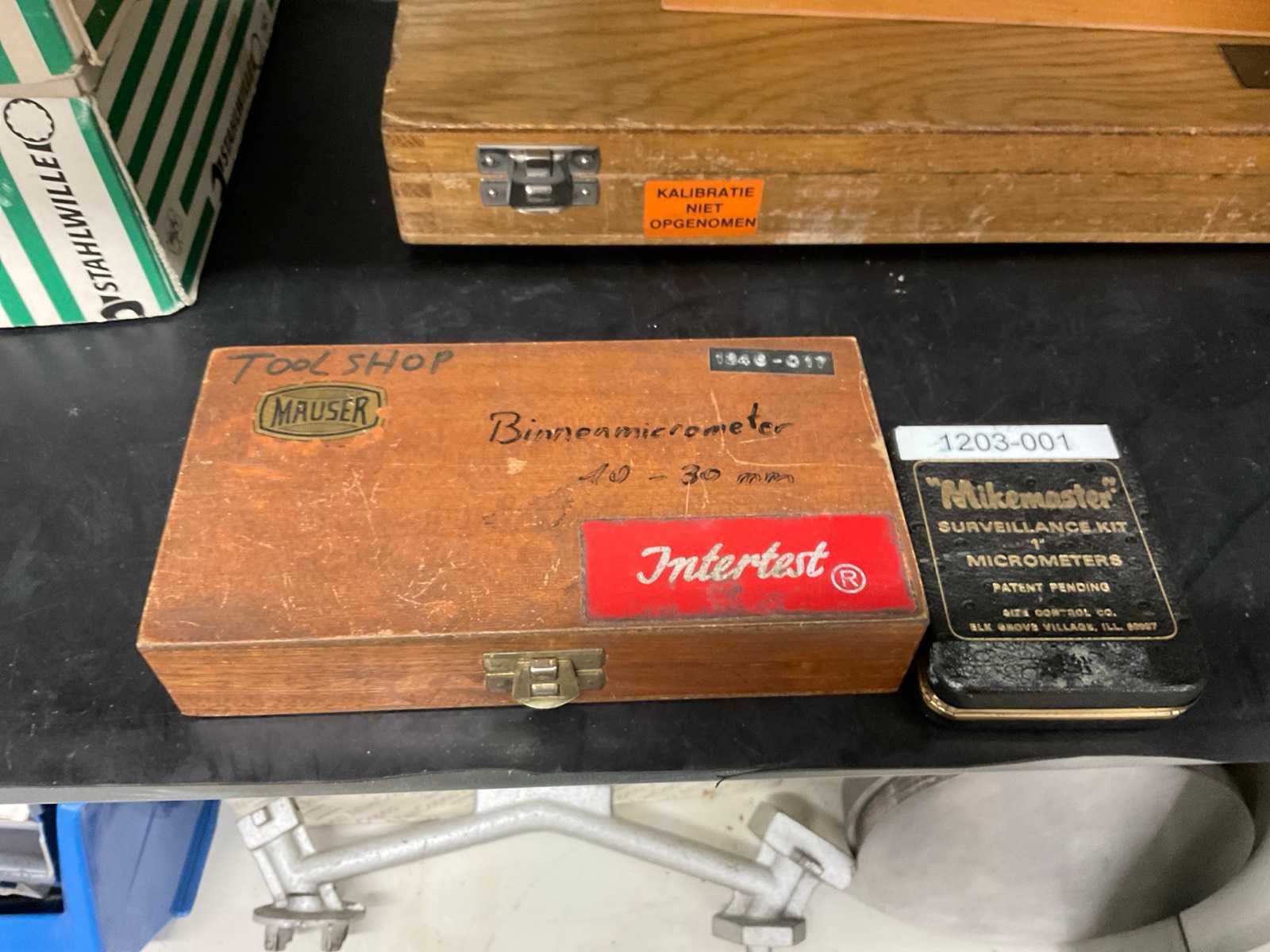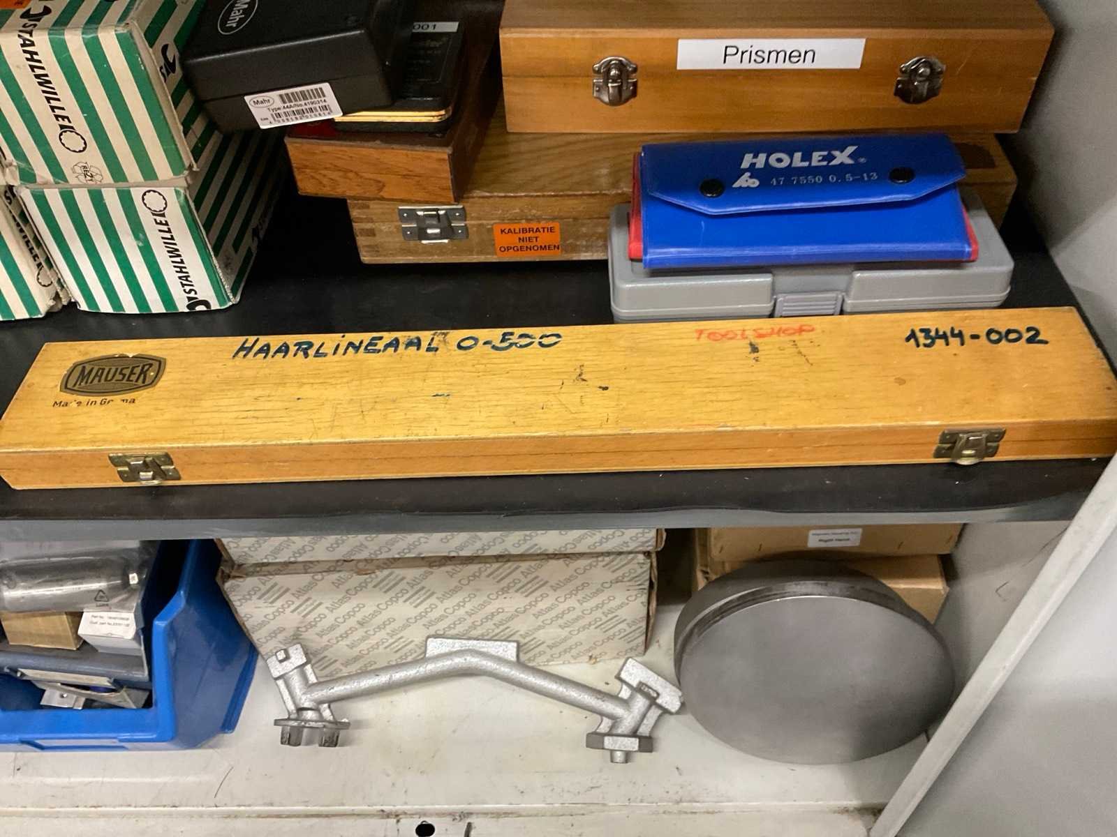 Bestaande uit onder andere: binnenschroefmaat, haarlineaal 0-500 mm, Prismen, refractometer, hoogtemeter, mikrometer, kalibratiekaliber voor schuifmaten. Kast 40x94x195 cm. No