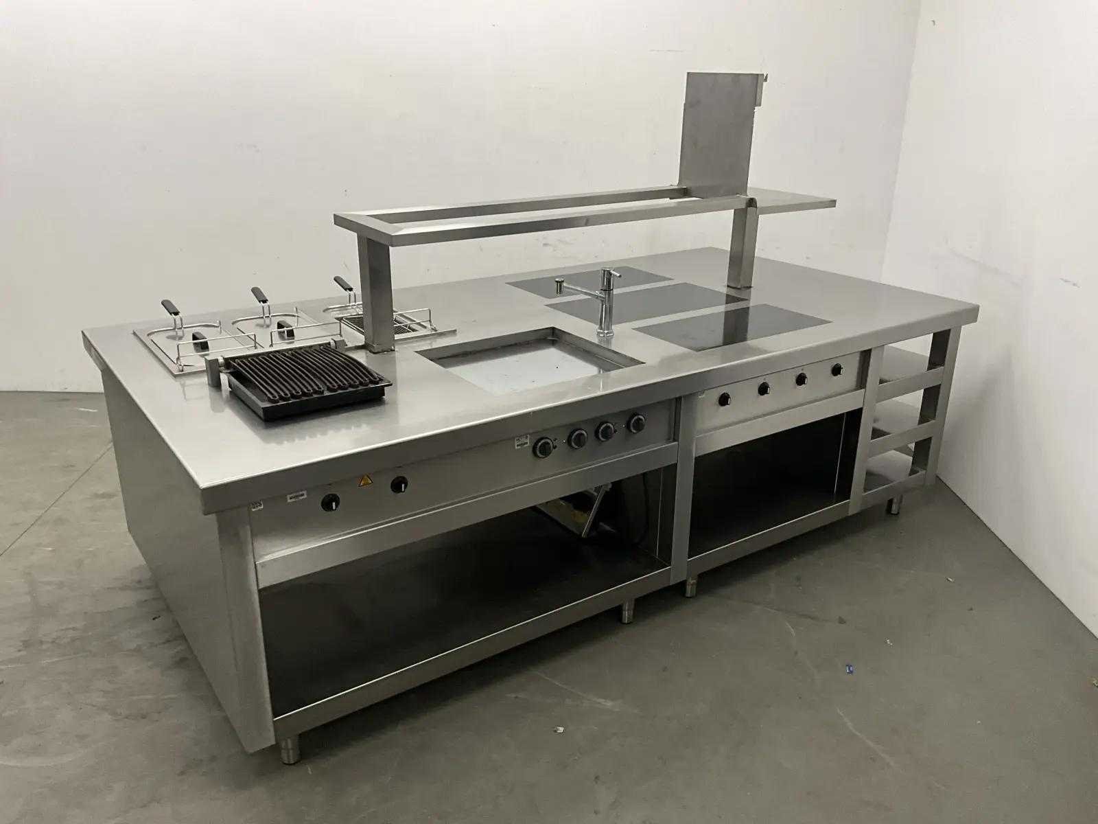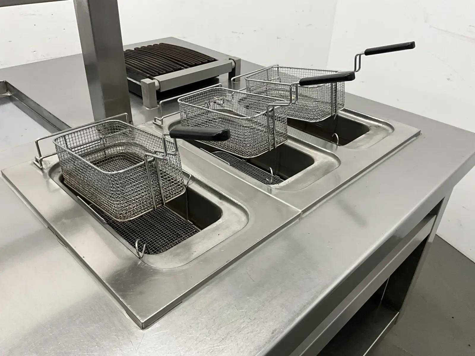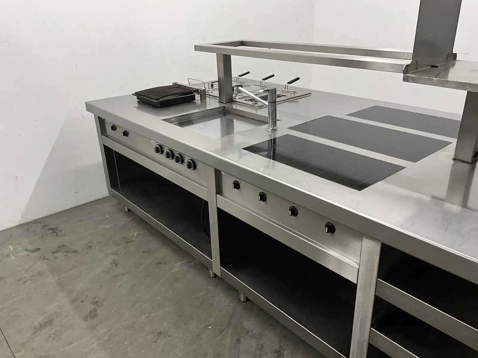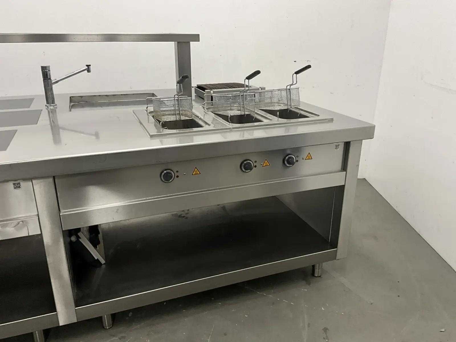 V.v. inductiefornuis, 3 elektrische friteuses, een waterbadgrill, en verchroomde bakplaat. Nee Lengte: 3200cm Breedte: 160cm Hoogte: 190cm Totale afmeting Breedte: 1600mm Totale afmeting L: 32000mm Totale afmeting Hoogte: 1900mm