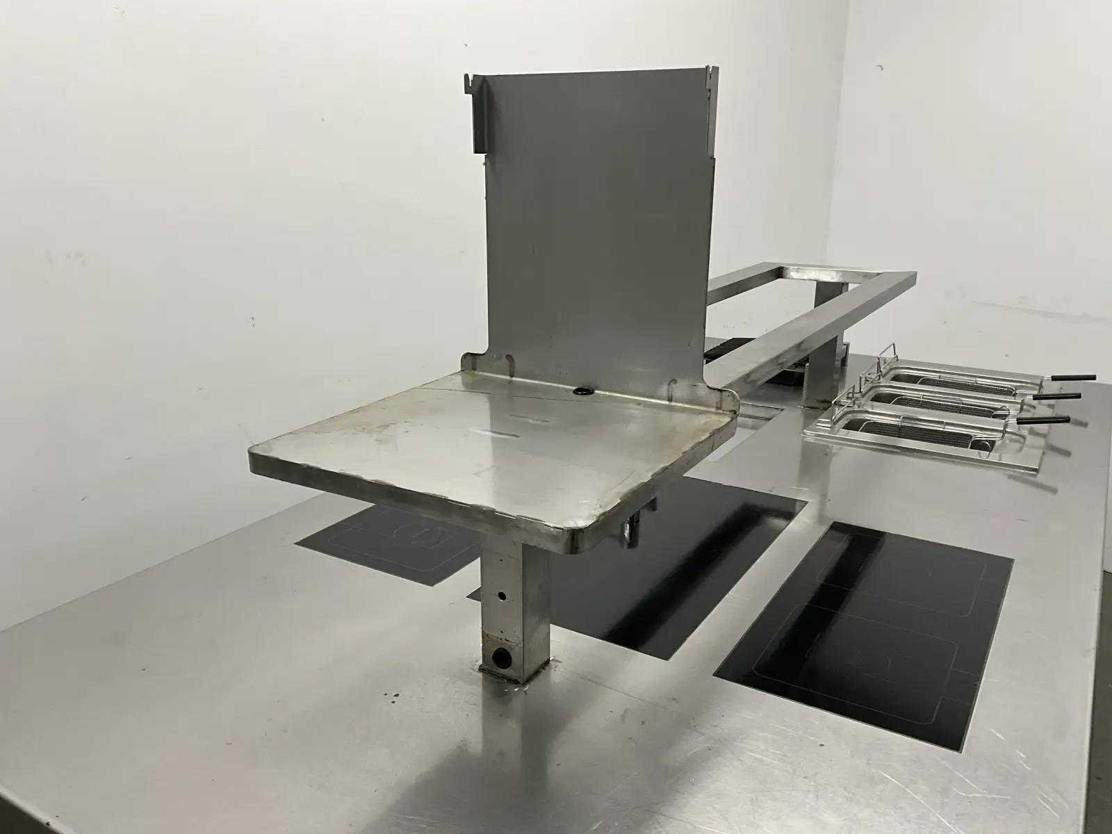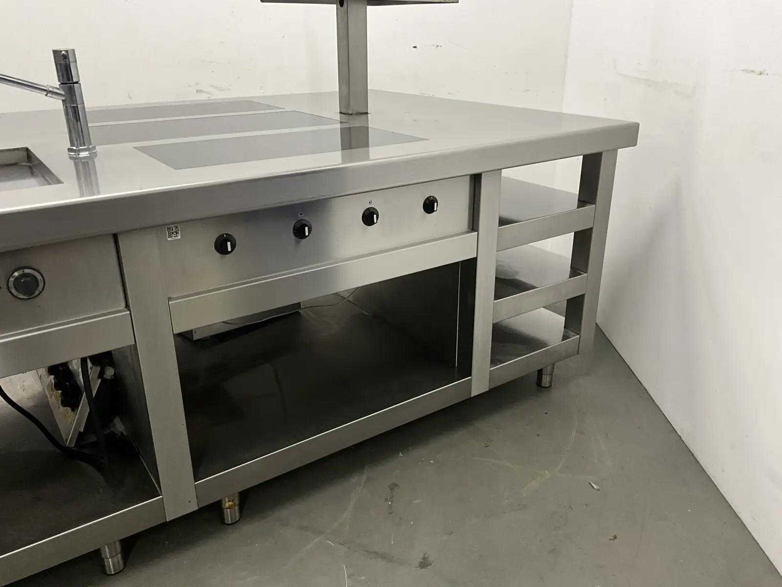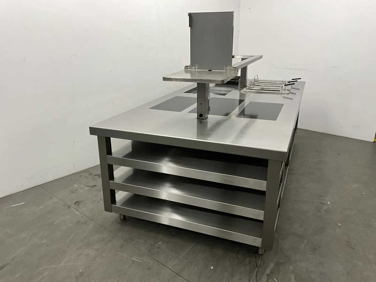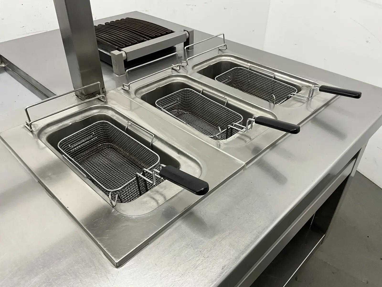 V.v. inductiefornuis, 3 elektrische friteuses, een waterbadgrill, en verchroomde bakplaat. Nee Lengte: 3200cm Breedte: 160cm Hoogte: 190cm Totale afmeting Breedte: 1600mm Totale afmeting L: 32000mm Totale afmeting Hoogte: 1900mm