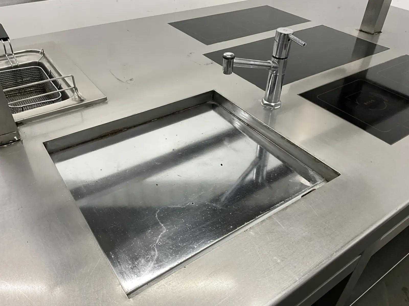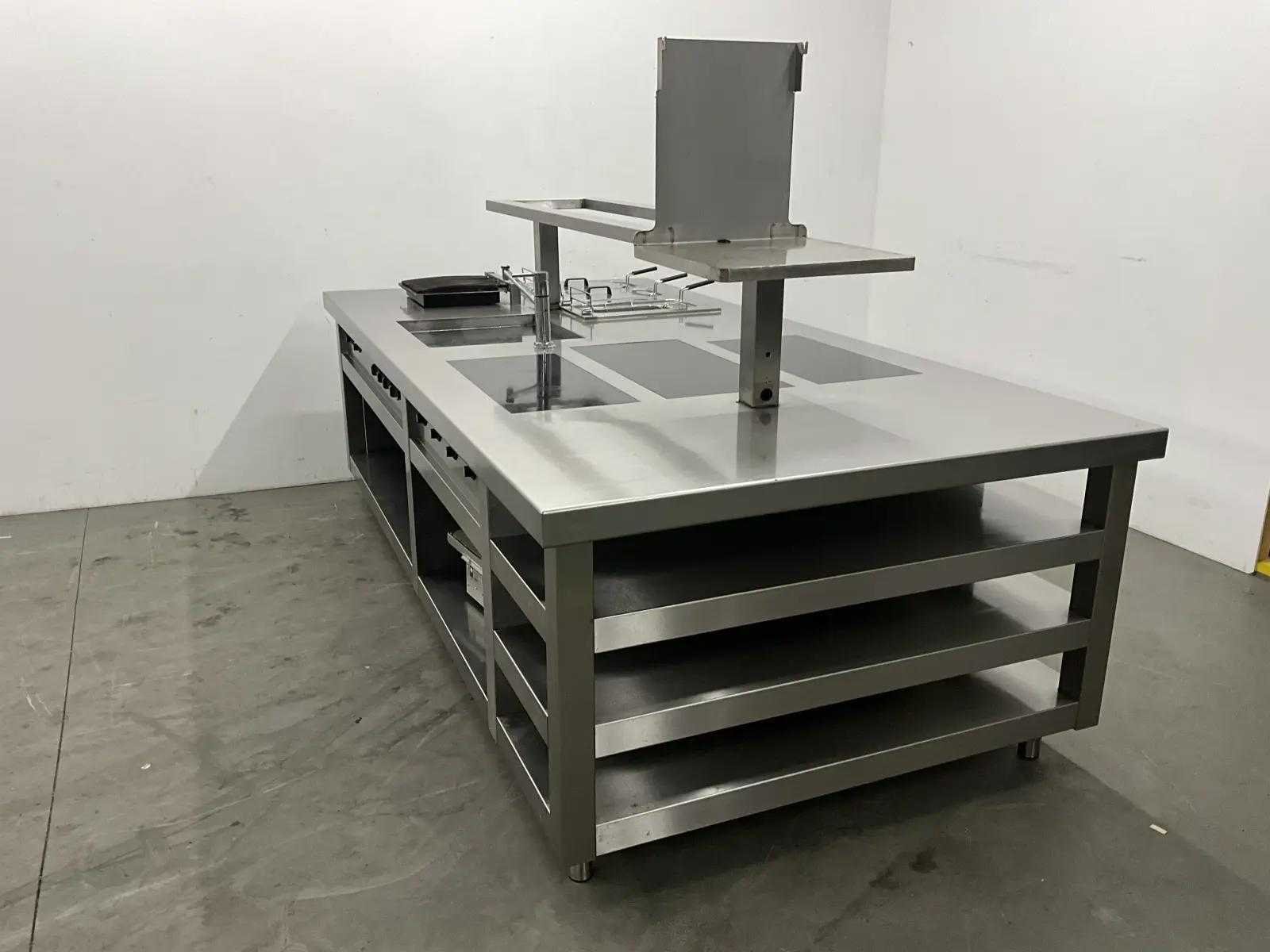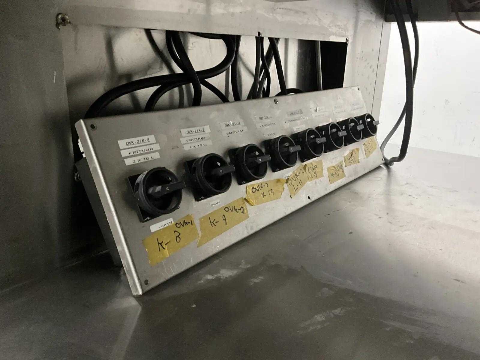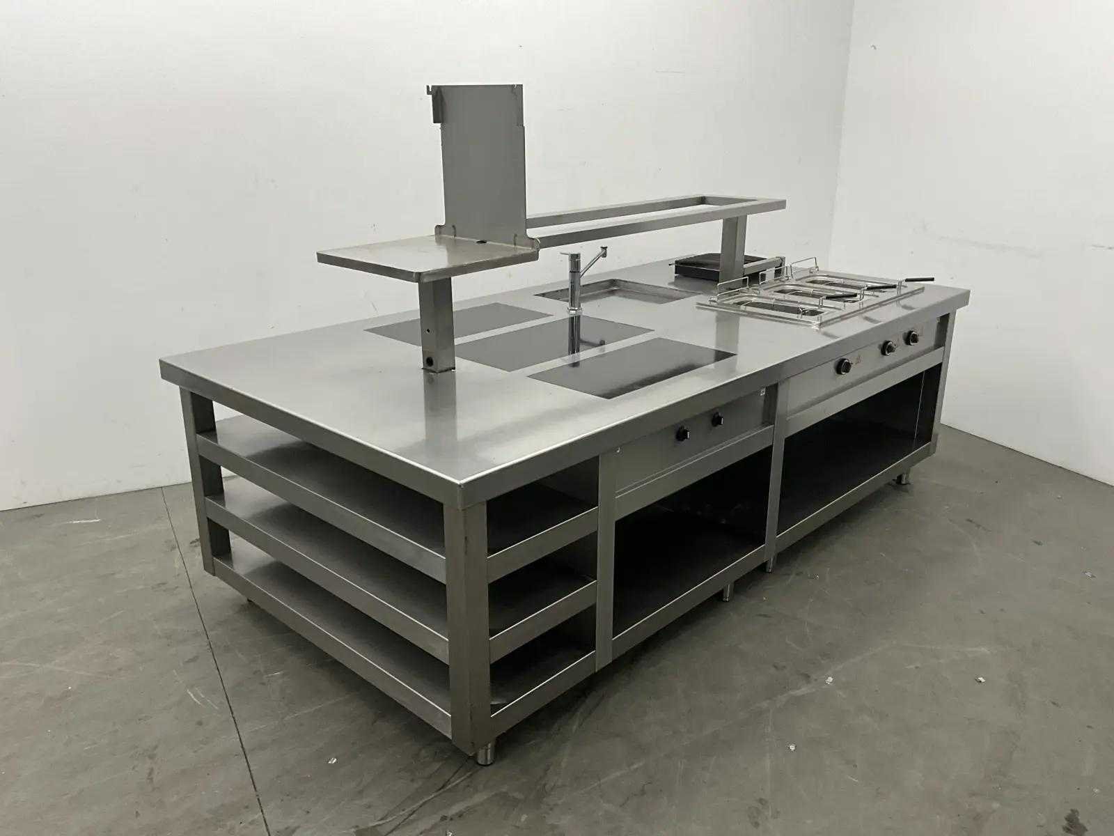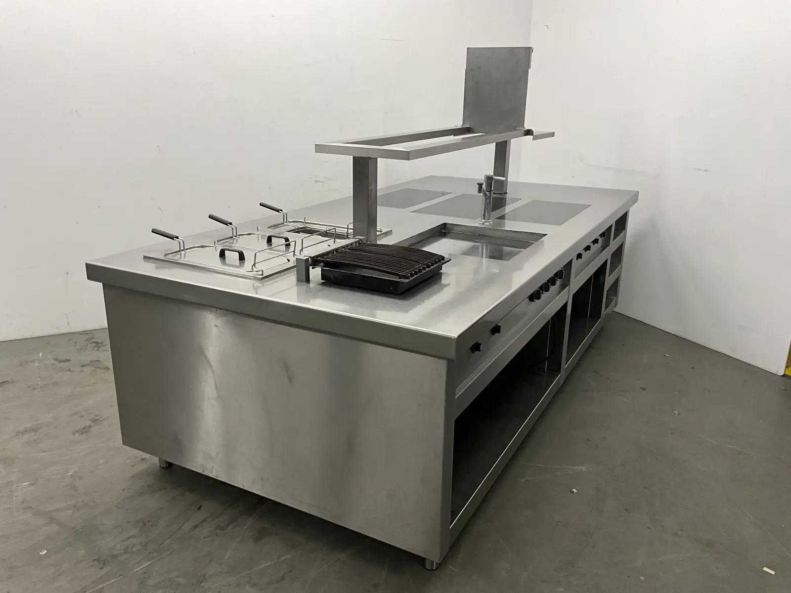 V.v. inductiefornuis, 3 elektrische friteuses, een waterbadgrill, en verchroomde bakplaat. Nee Lengte: 3200cm Breedte: 160cm Hoogte: 190cm Totale afmeting Breedte: 1600mm Totale afmeting L: 32000mm Totale afmeting Hoogte: 1900mm