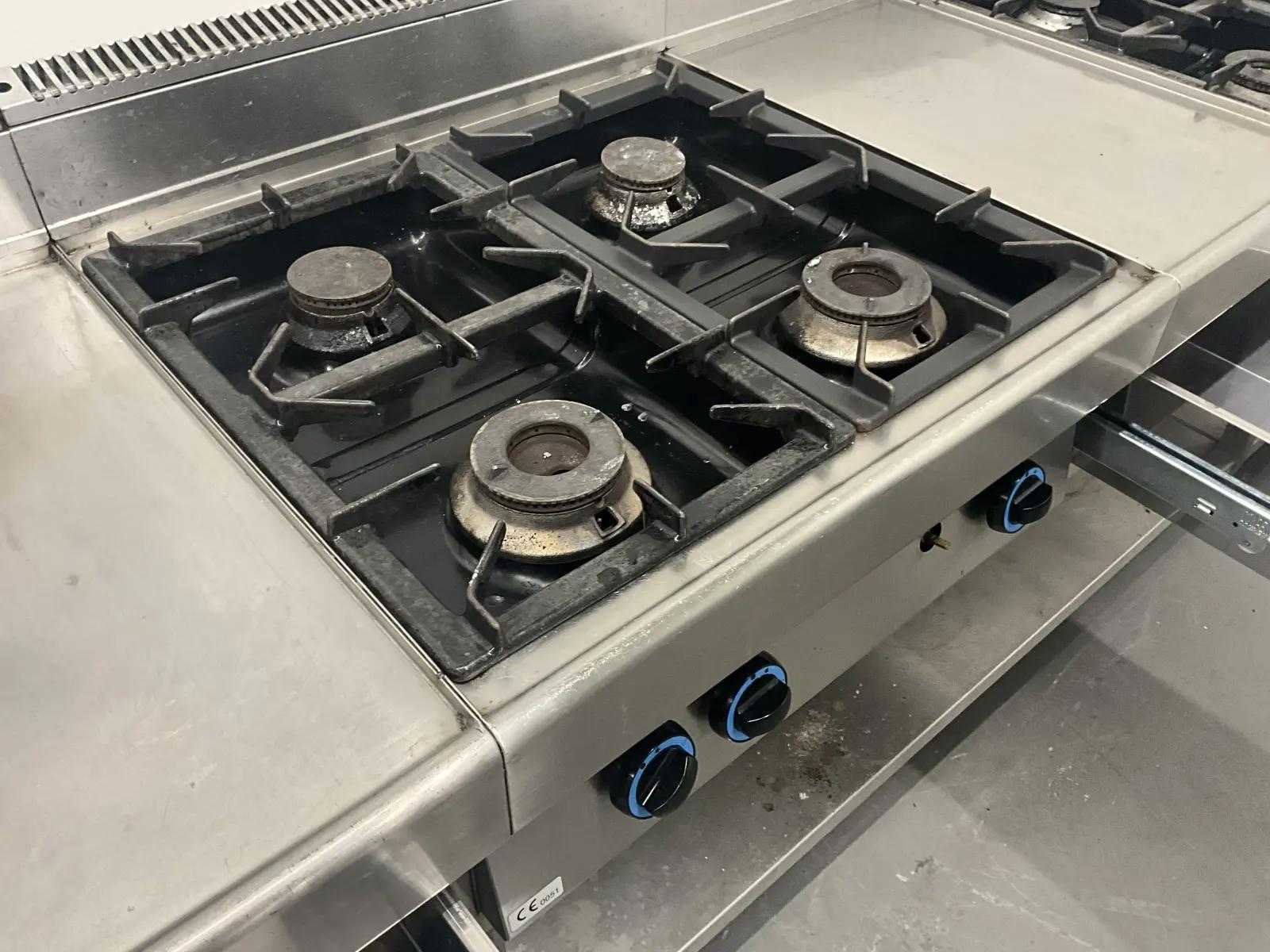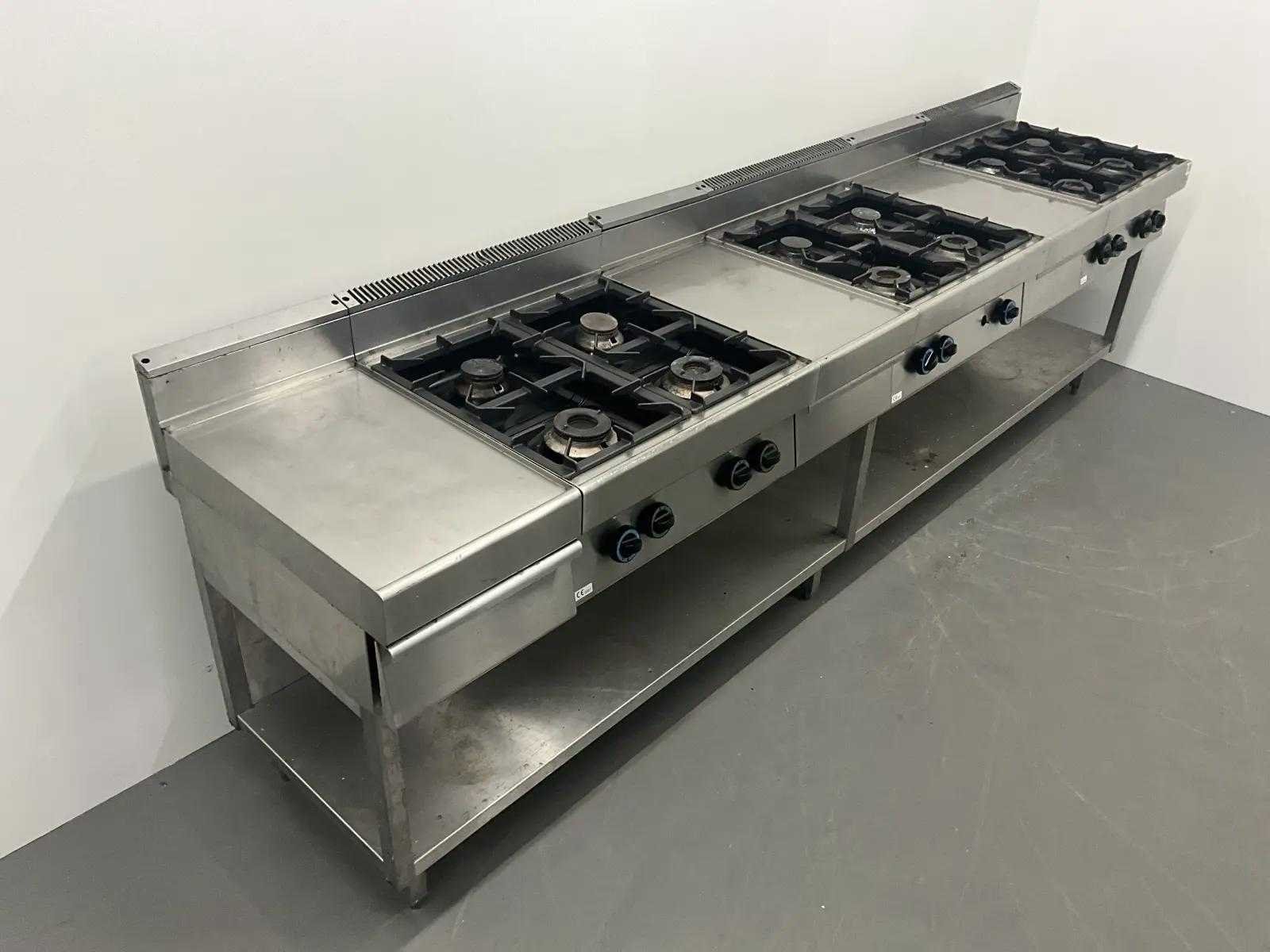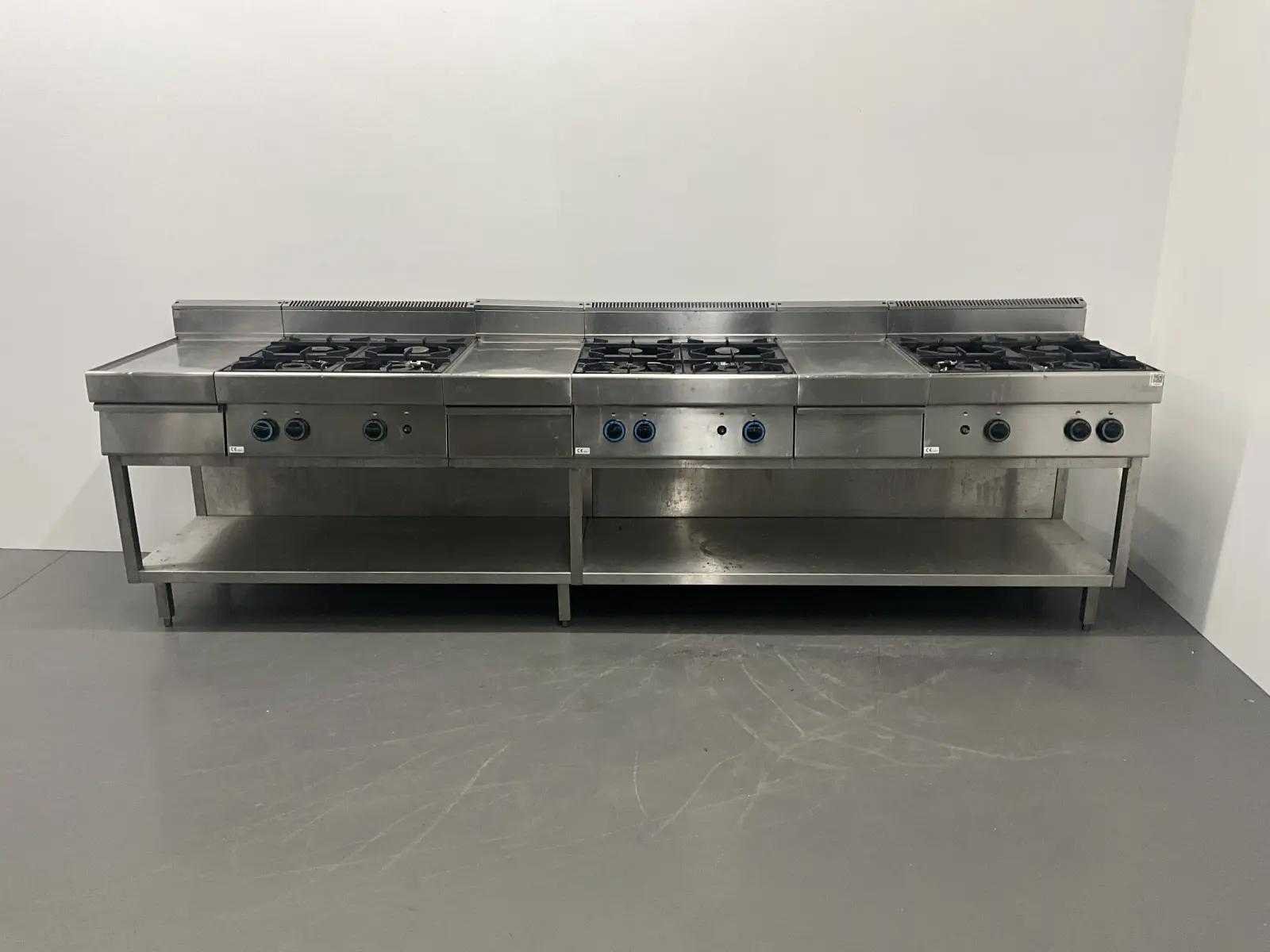 V.v. 3x 4-pits gasfornuis. Nee Merk: Modular Lengte: 330cm Breedte: 70cm Hoogte: 105cm Totale afmeting Breedte: 700mm Totale afmeting L: 3300mm Totale afmeting Hoogte: 1050mm
