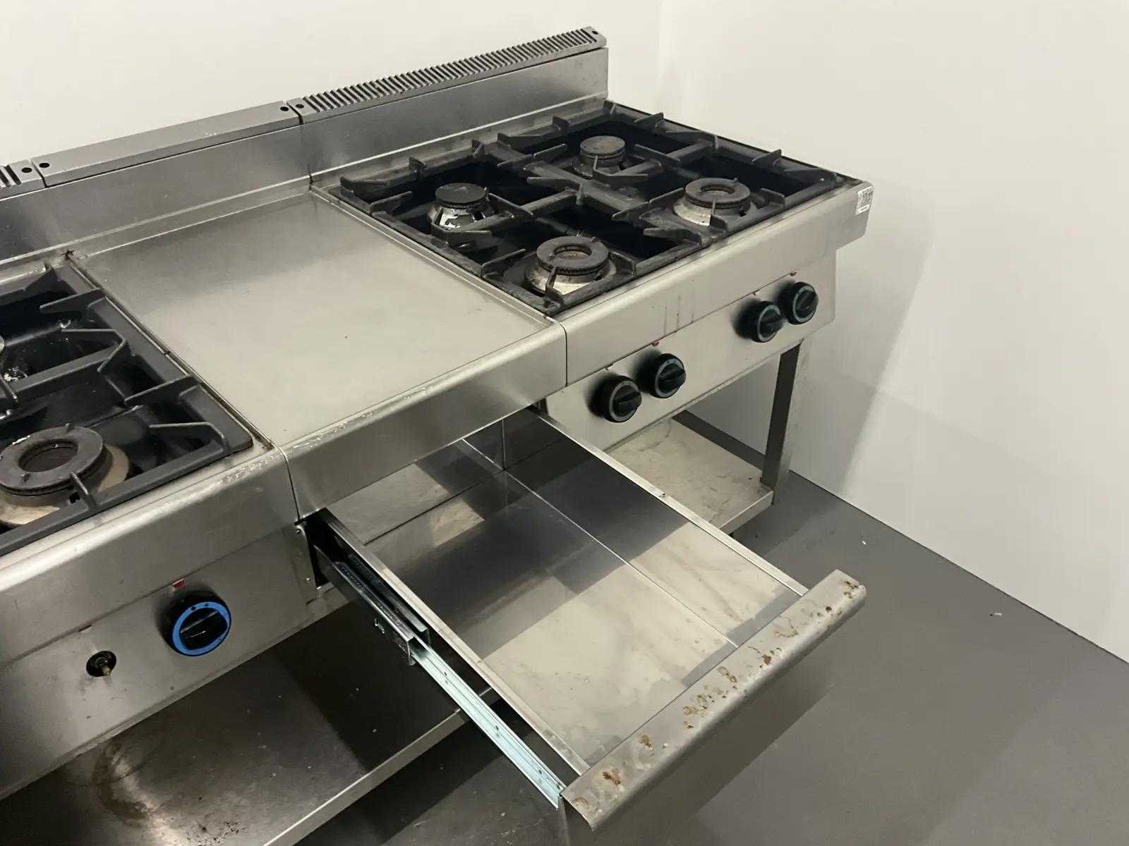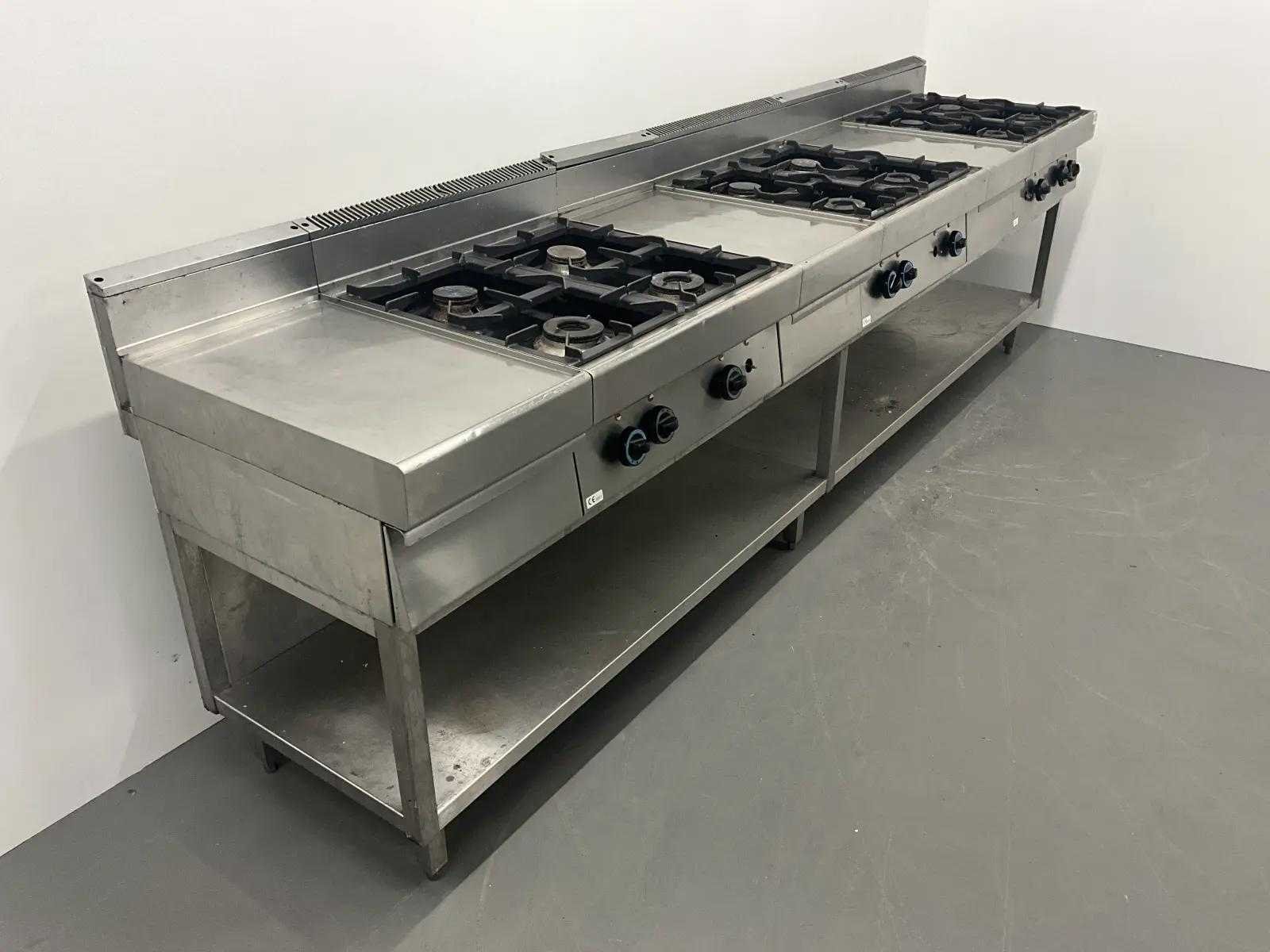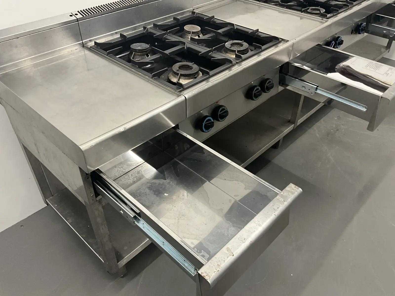V.v. 3x 4-pits gasfornuis. Nee Merk: Modular Lengte: 330cm Breedte: 70cm Hoogte: 105cm Totale afmeting Breedte: 700mm Totale afmeting L: 3300mm Totale afmeting Hoogte: 1050mm