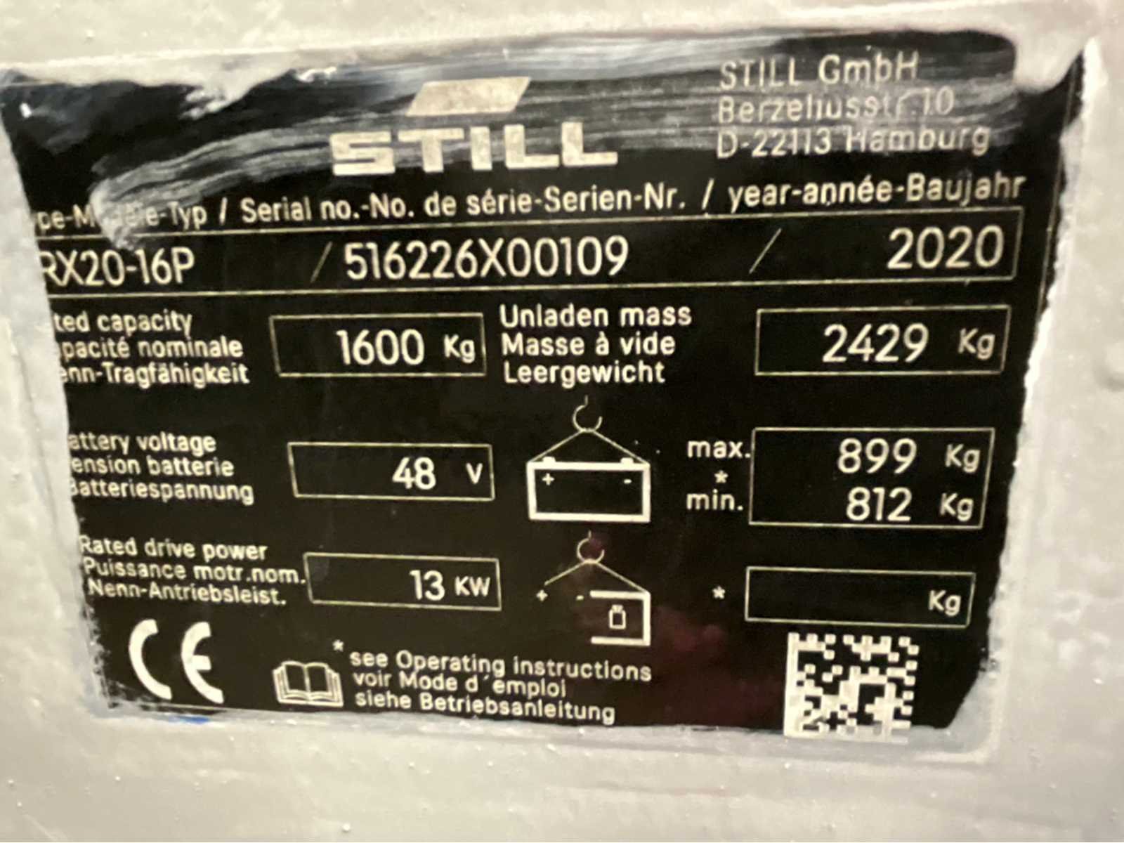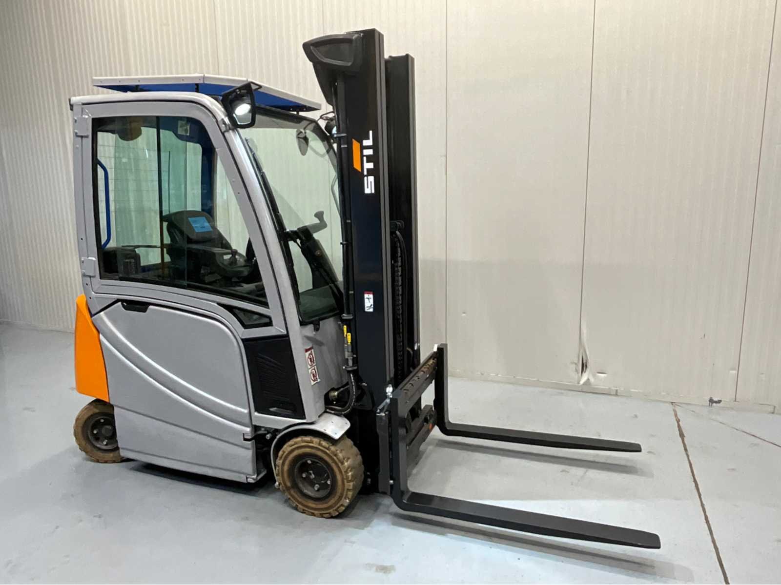 Bluespot achter, halve cabine, ruitenwissers voor en achter Nee Merk: Still Type: RX20-16P Bouwjaar: 2020 Serienummer: 516226X00109 Brandstof: Elektrisch Mast: triplex Soort band: Non marking Aantal wielen: 4 Afgelezen urenstand: 1049 Free-lift: true Side-shift: true Triple mast: true Eigen gewicht: 3328kg Hefvermogen: 1600kg Lepellengte: 1100mm Max. hefhoogte: 5350mm Hefhoogte: 5350mm Vol rubber banden: true Minimale doorrijhoogte: 2300mm Totale afmeting L: 3200mm Totale afmeting Breedte: 1200mm Totale afmeting Hoogte: 2300mm