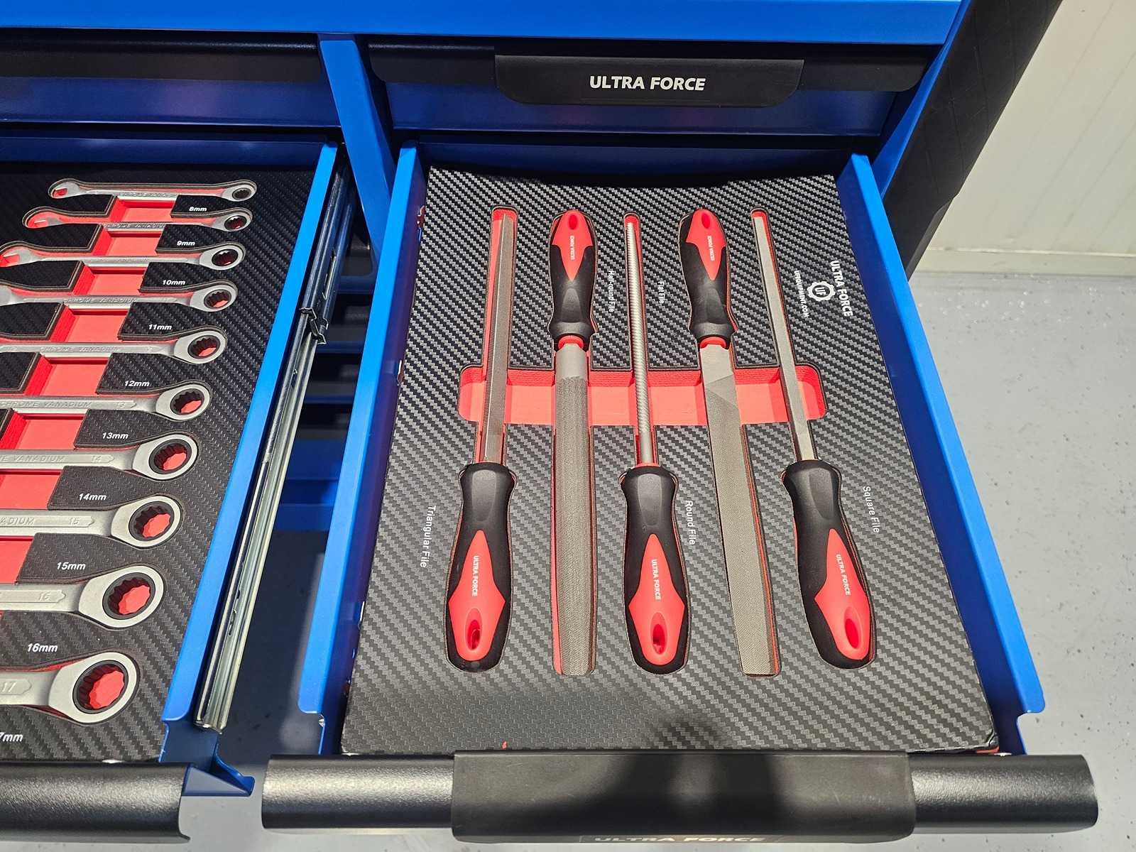 Professionele gereedschapswagen 12 laden, 293 pcs EN een 4 delige accu gereedschap set. Gereedschapswagen 12 laden waarvan 11 gevuld met 293 pcs gereedschap Heavy equipment. 600 kg laadvermogen. Softclose-mechanisme. 2 zwenkwielen en 4 sleutels. En een 4 delige accu gereedschap set: schroefmachine - slagmoersleutel - boormachine en slijper. Inclusief 2 accu's, oplader en diverse accessoires in koffer. Cordless power tools set Nee Merk: Ultra Force Equipment Type: Jumbo Gewicht: 132kg Lengte: 112cm Breedte: 50cm Hoogte: 103cm