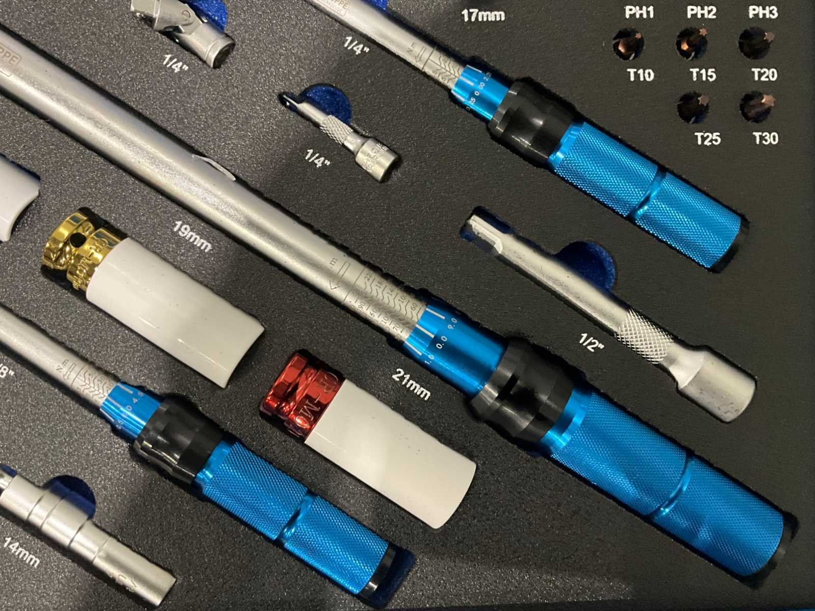 1x 1/4" momentsleutel met 72-tands aandrijving (bereik: 5-25 N/M) 1x 3/8" momentsleutel met 72-tands aandrijving (bereik: 10-60 N/M) 1x 1/2" momentsleutel met 72-tands aandrijving (bereik: 40-220 N/M) 3x Impactdoppen (1/2"): 17mm, 19mm, 21mm 3x Dopsleutels (1/2"): 17mm, 19mm, 21mm 3x Verlengstukken: 1/4" x 3", 3/8" x 3", 1/2" x 5" 2x Universele koppelingen (1/4" & 1/2") 16x Bitdoppen (1/4"): PH1, PH2, PH3, T10, T15, T20, T25, T30, H2, H2.5, H3, H4, H5, H6, H8, H10 2x Bougiesleutels (14mm, 16mm) met dunne wand, 3/8" aandrijving voor BMW ongebruikt Nee Merk: Stahlgruppe Type: 32PC Bouwjaar: 2026 Lengte: 45 Breedte: 33 Hoogte: 5