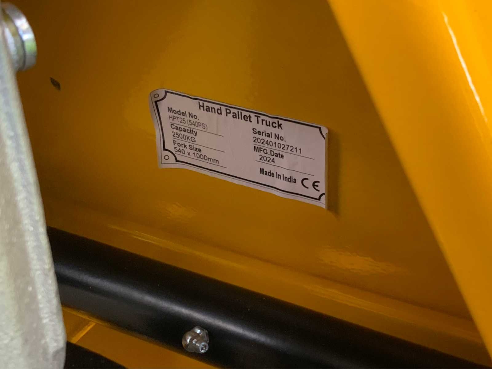 Nee Merk: JD Type: HPT 2500 Bouwjaar: 2026 Hefvermogen: 2500kg Hefhoogte: 200mm Lepellengte: 1000mm Totale afmeting L: 1400mm Totale afmeting Breedte: 540mm Totale afmeting Hoogte: 1240mm