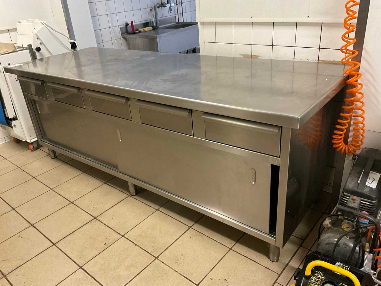 Roestvast staal, voorzien van schuifdeuren en lades. Nee Lengte: 90cm Breedte: 250cm Hoogte: 90cm