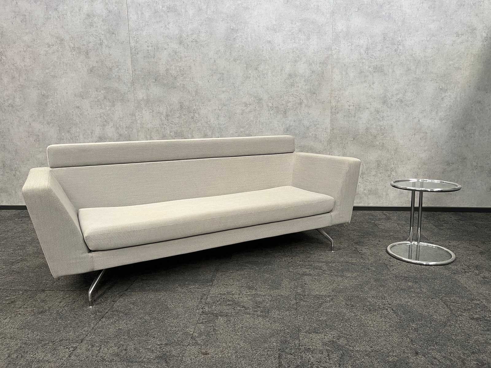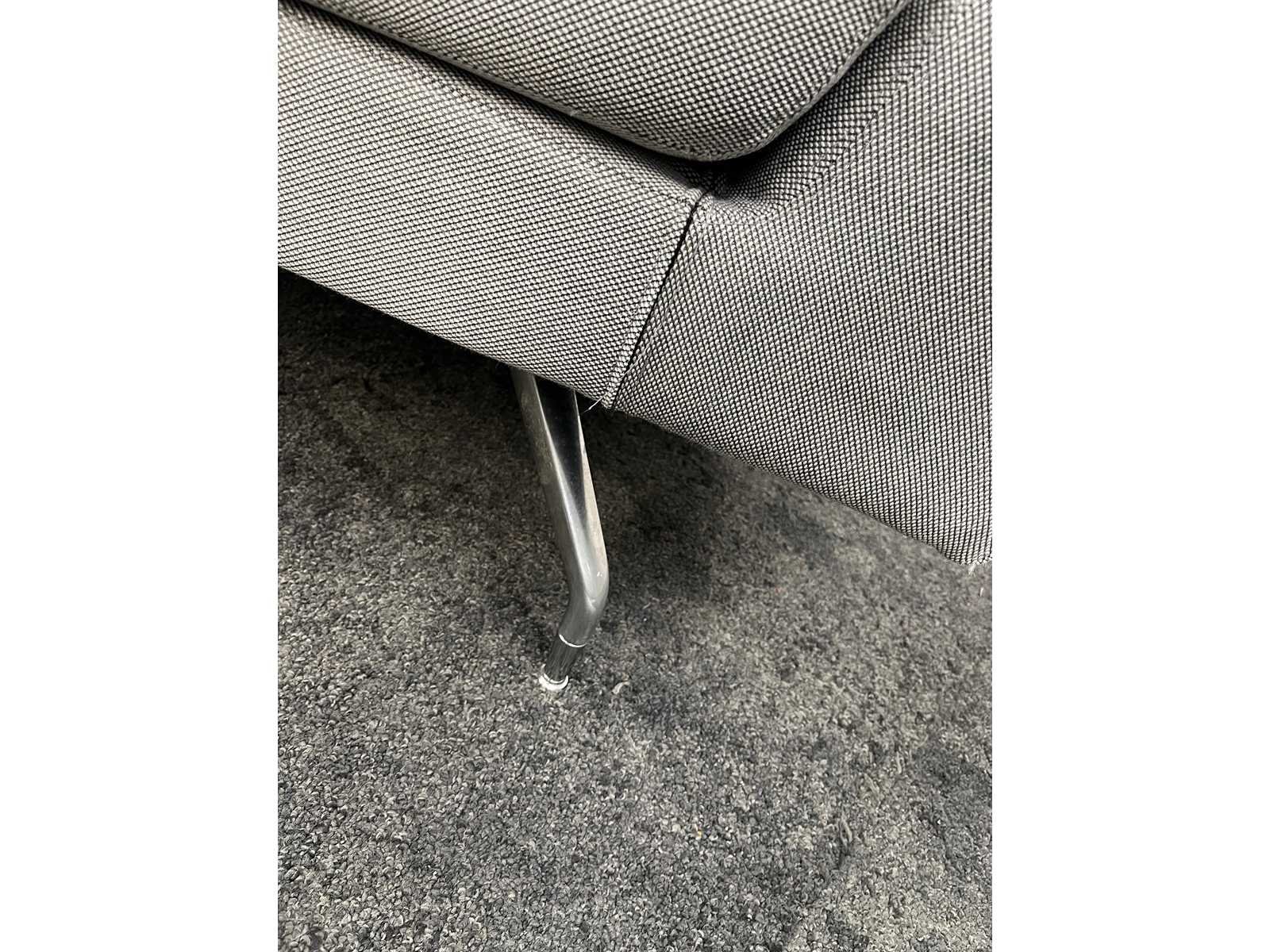 Afm. sofa ca. hxbxd 85x220x80 cm. -- Afm. bijzettafel ca. hoogte 55 cm. en diameter 46 cm. Nee Merk: Orangebox Kleur: grijs, chroom Zithoogte: 42cm