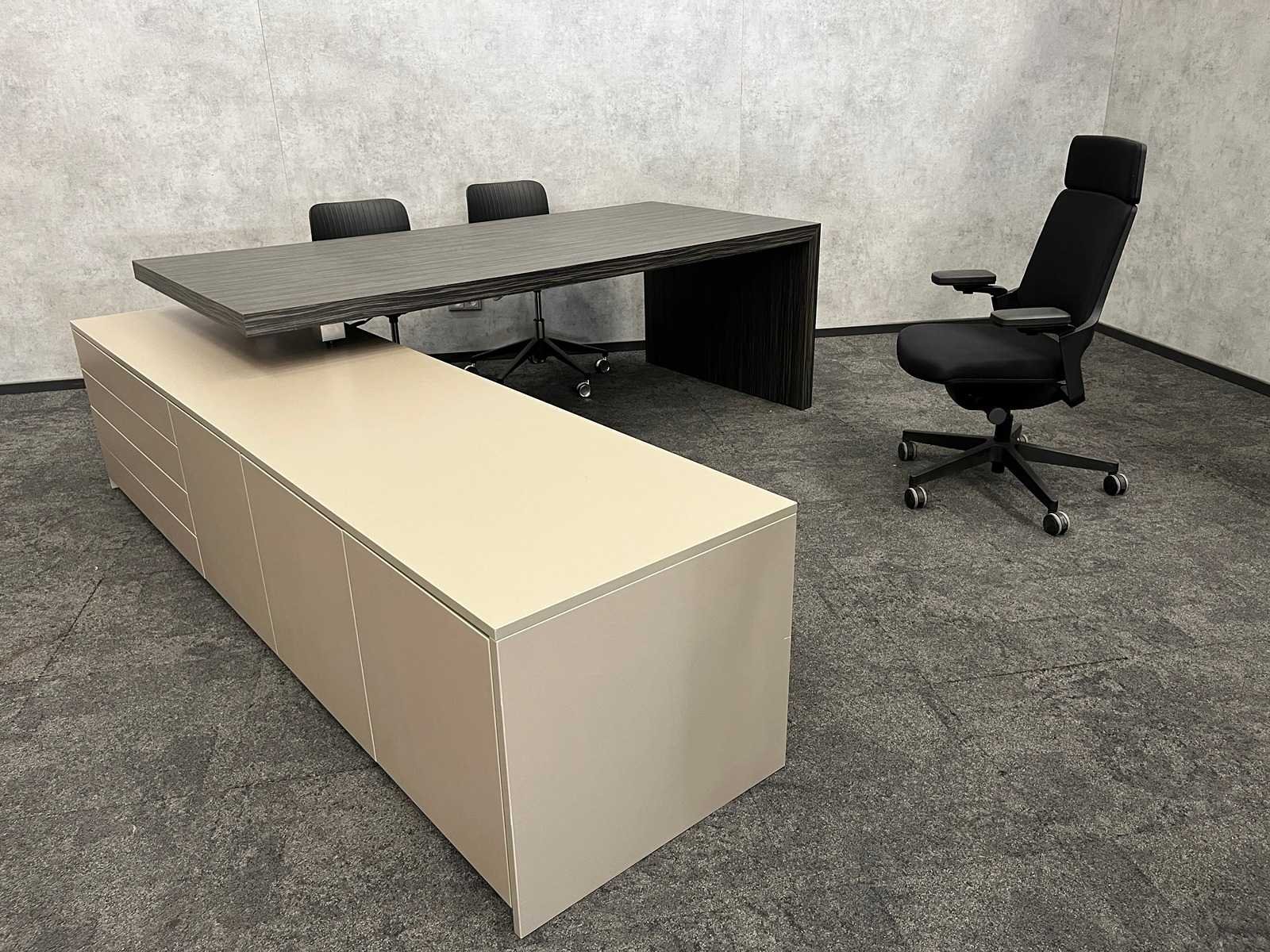 Kavel bestaande uit Interstuhl ergonomische bureaustoel v.v. 3D verstelbare armleggers, zithoogte en zitdiepte instelbaar, hoofdsteun en actief zitten. --- 2x Segis Dragonfly verrijdbare conferentie stoel. verrijdbaar, in hoogte instelbaar en draaibaar --- directiebureau met kast. Afm. bureaublad ca. hxbxd 75x220x100 cm. Afm. kast ca. hxbxd 59x260x64 cm. (kast en bureaublad zijn los van elkaar en onverpakt). Nee