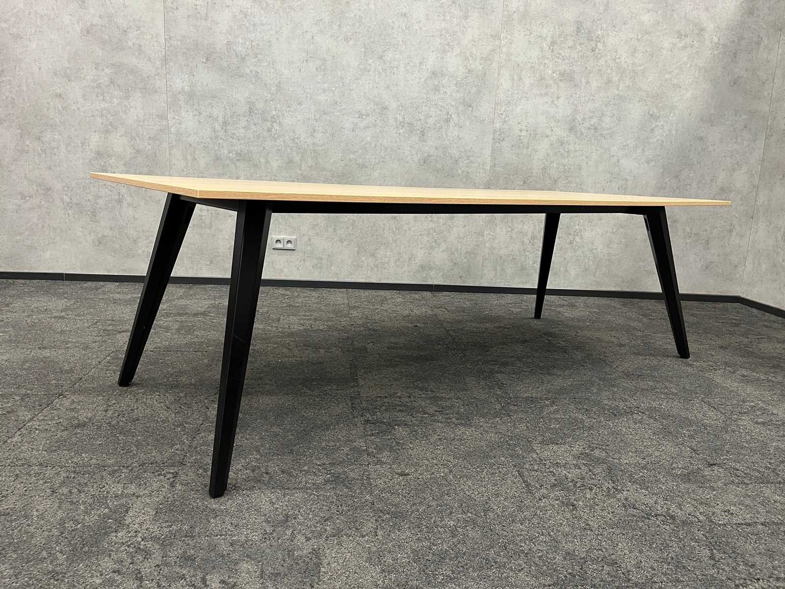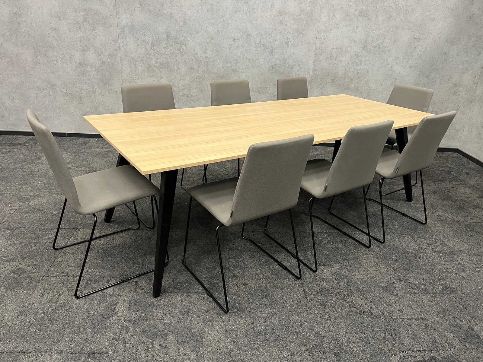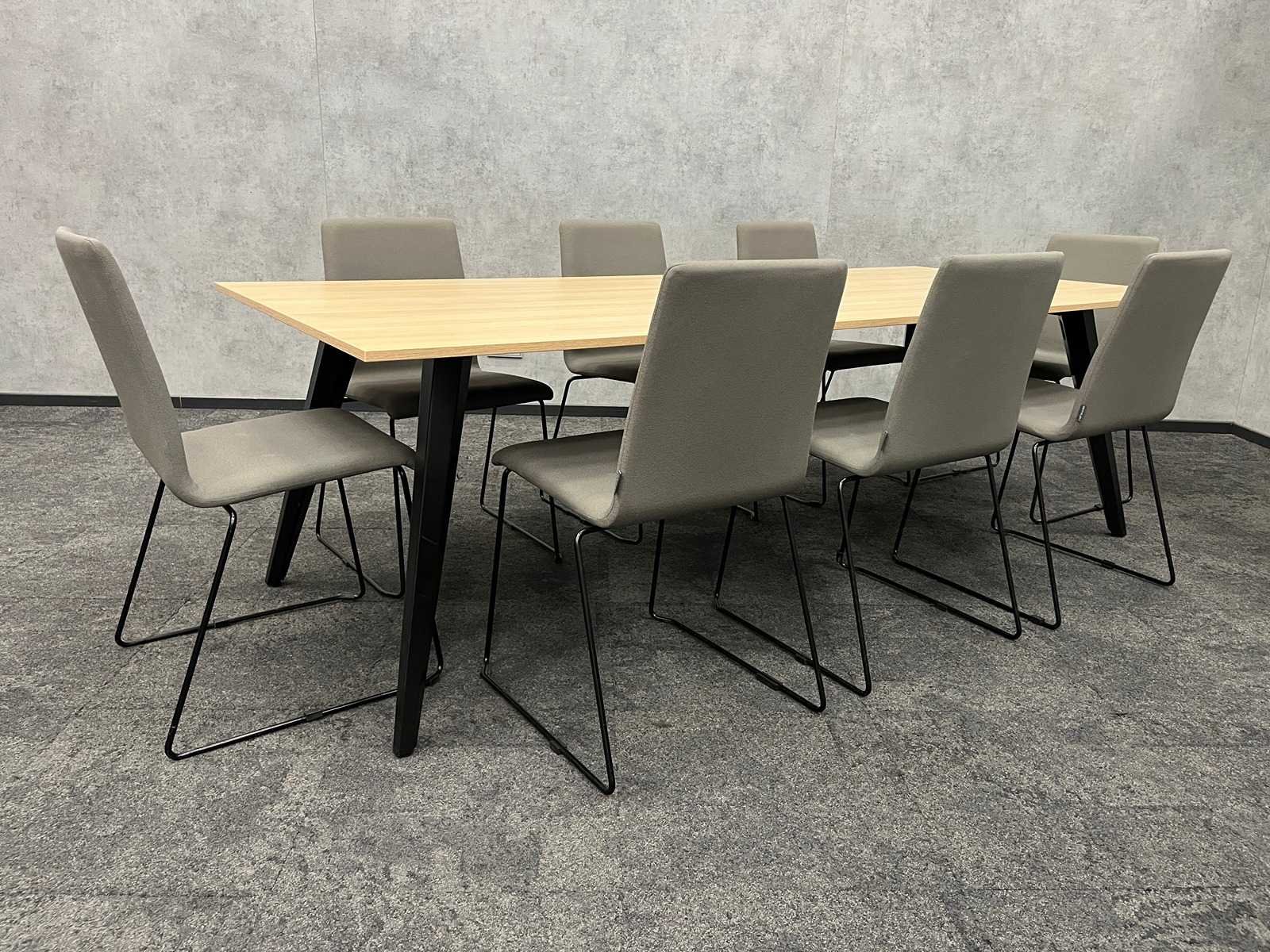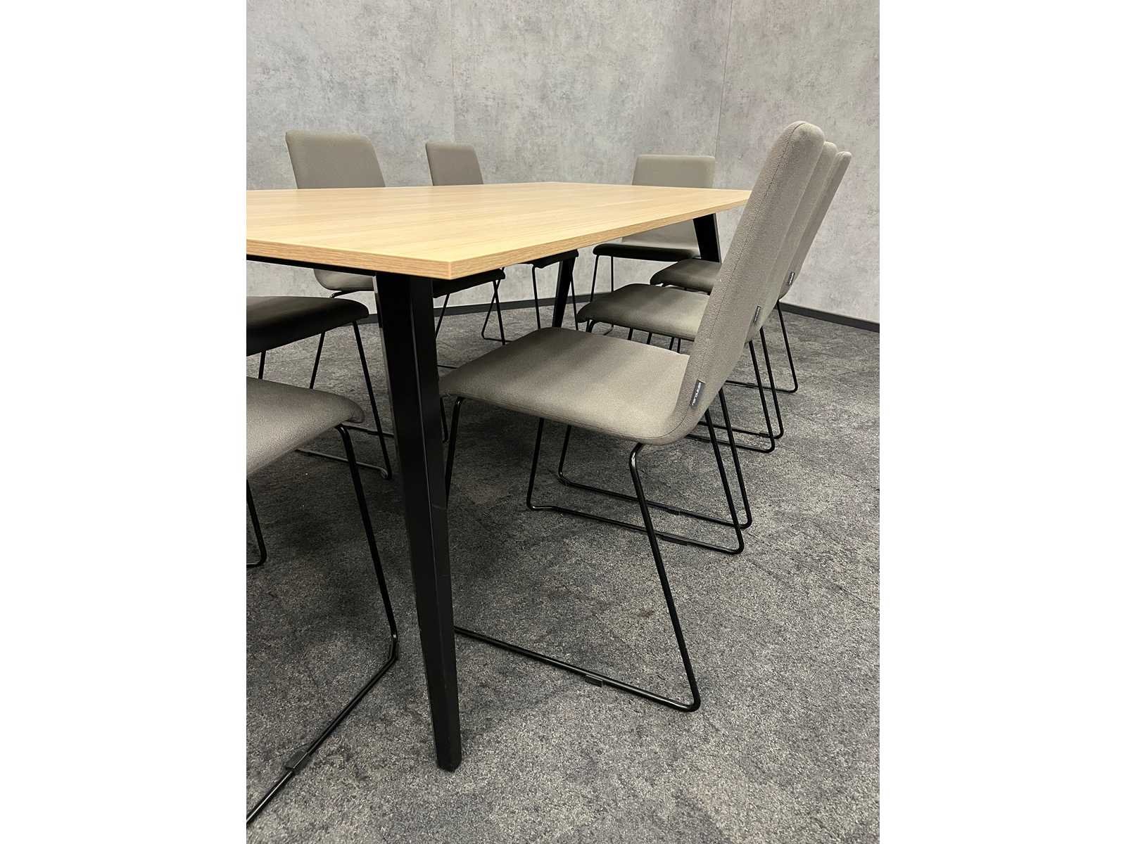 Kavel bestaande uit 8x Narbutas Moon nestelbare stoel en 1x vergadertafel v.v. zwart stalen frame en eikenlook melamine tafelblad Nee Merk: Narbutas Moon Kleur: taupe, zwart, eiken Lengte: 240cm Breedte: 100cm Hoogte: 74cm Zithoogte: 48cm