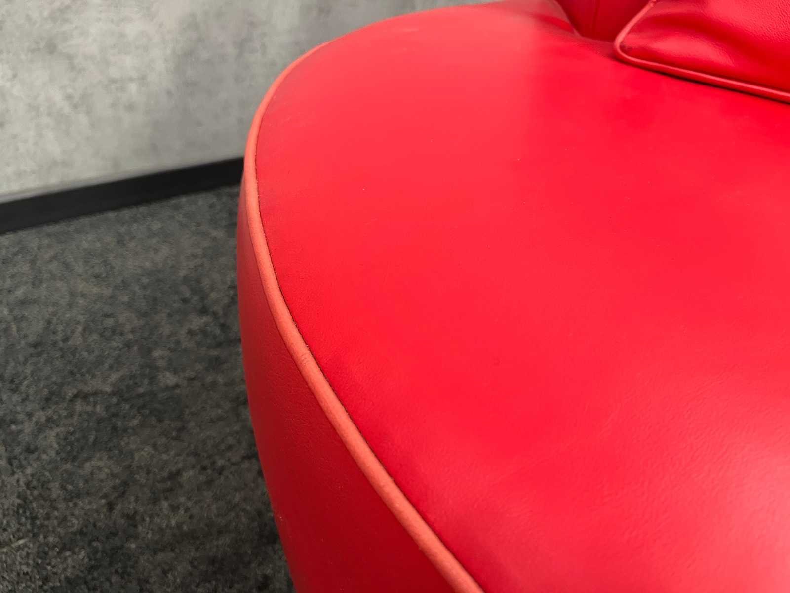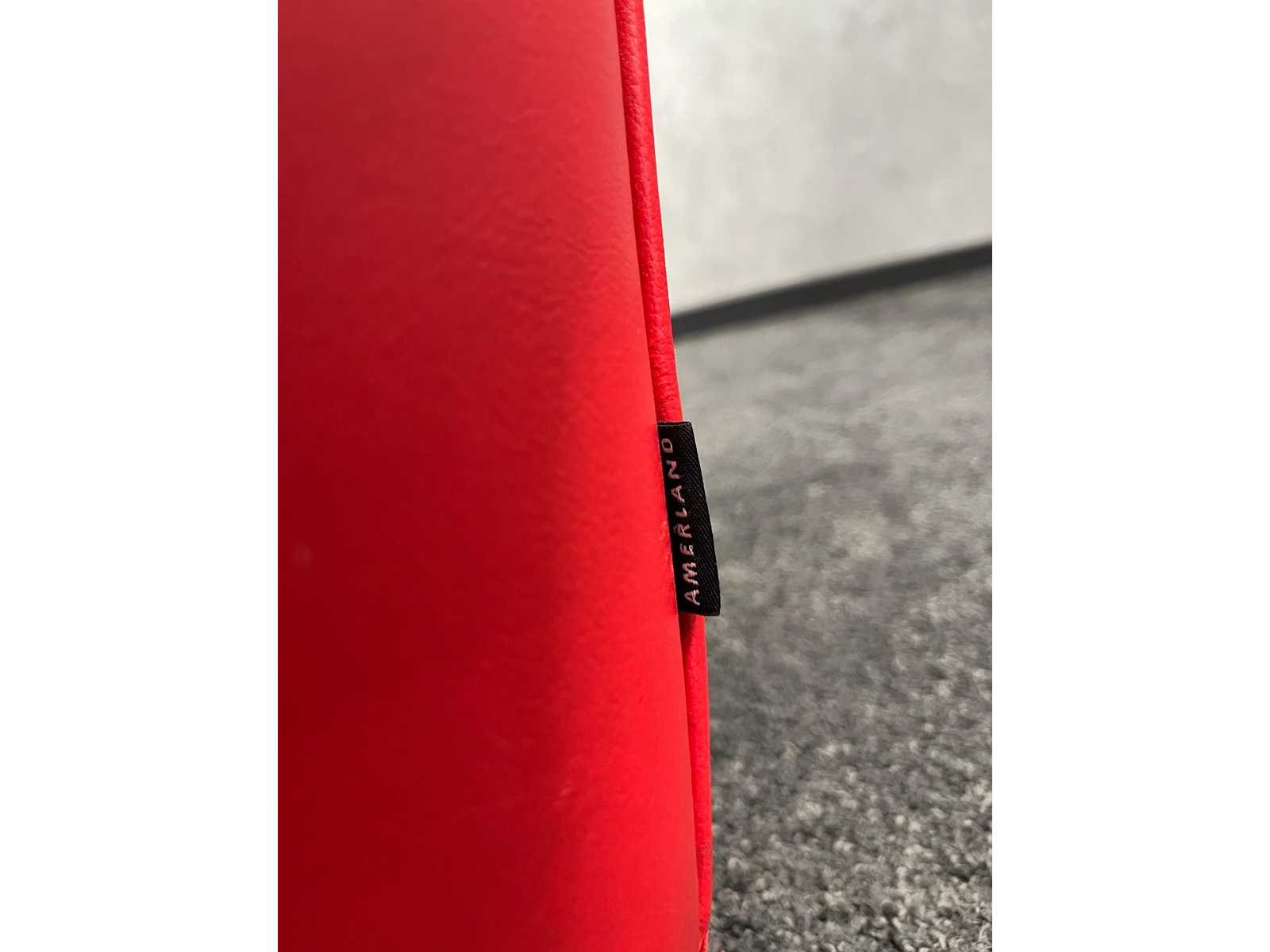 Afm. fauteuils ca. hxbxd 70x150x90 cm. zithoogte ca. 40 cm. -- Afm. design salontafel ca. hoogte 51 cm. en diameter 50 cm. Nee Merk: Amerland Kleur: rood