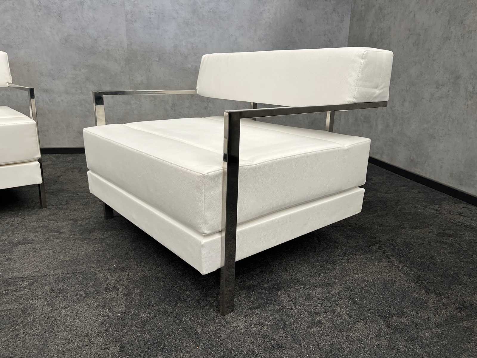 Afm. sofa ca. hxbxd 76x160x80 cm. -- Afm. fauteuil ca. hxbxd 76x94x80 cm. Nee Merk: Noti Ixo Kleur: wit, chroom Zithoogte: 44cm Materiaal: metaal, kunstleer