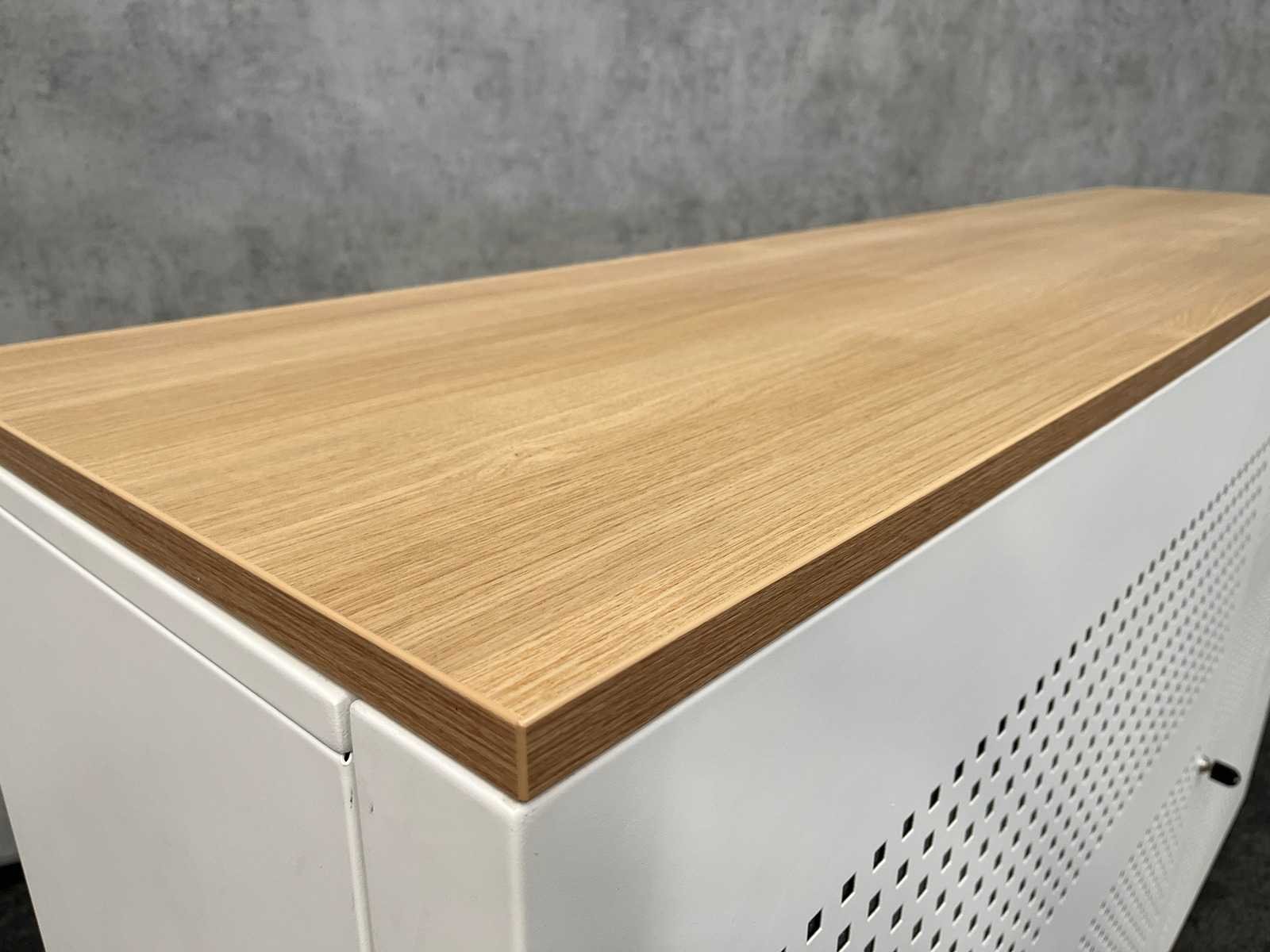 V.v. 4 verstelbare legborden en eikenlook melamine topblad. LET OP deze kast is zonder sleutel Nee Kleur: wit, eiken Breedte: 200cm Hoogte: 123cm Diepte: 50cm Materiaal: metaal, melamine