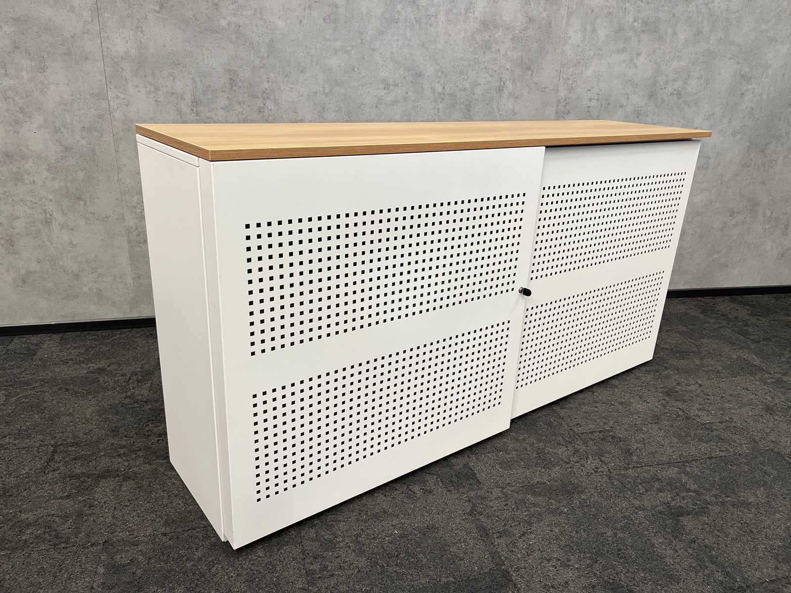 Met sleutel, v.v. 2 verstelbare legborden en eikenlook melamine topblad. Nee Kleur: wit, eiken Breedte: 200cm Hoogte: 102cm Diepte: 50cm Materiaal: metaal, melamine