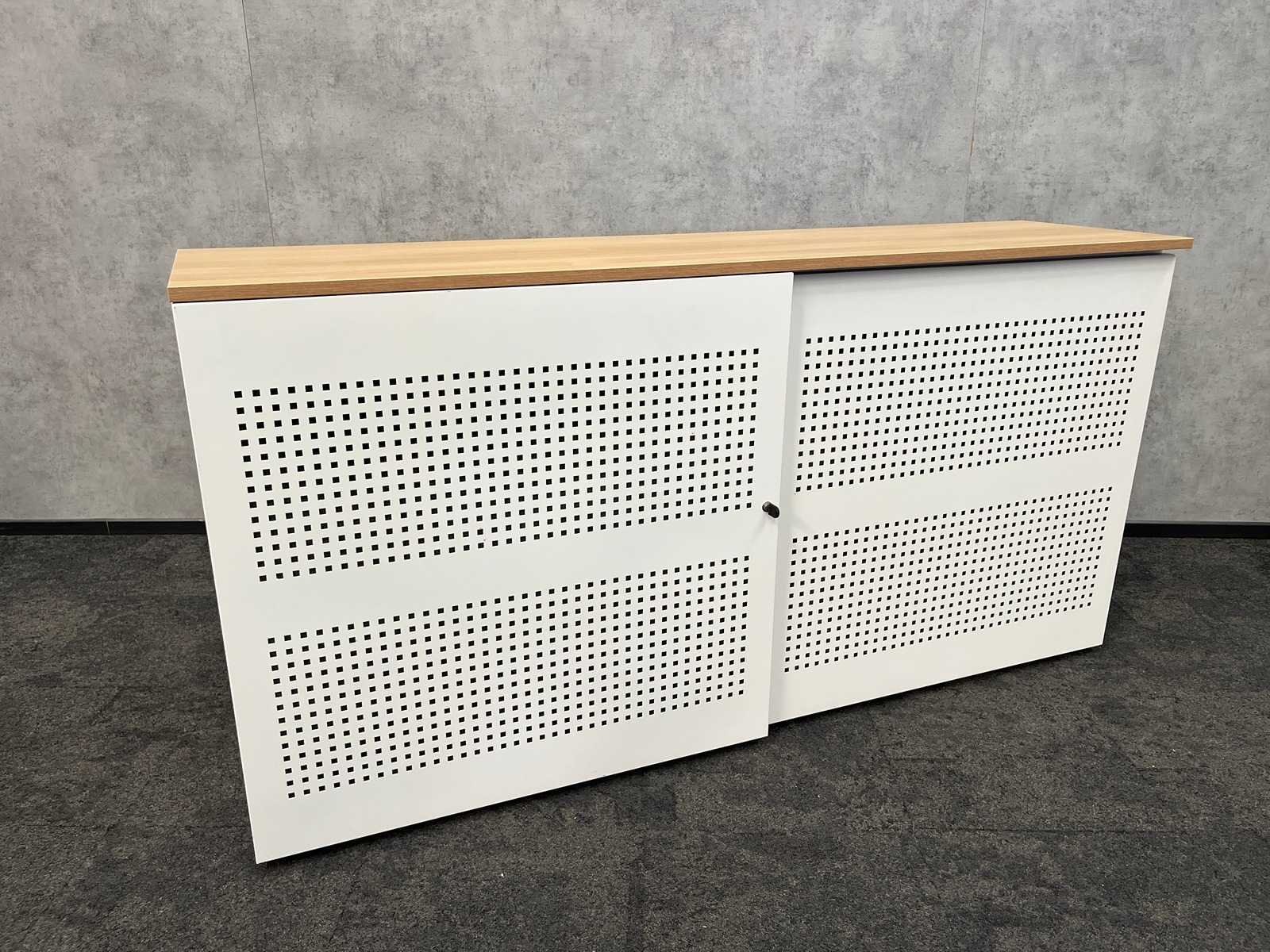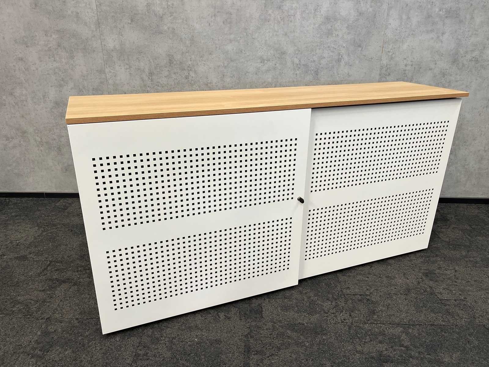 V.v. 2 verstelbare legborden en eikenlook melamine topblad. LET OP deze kast is zonder sleutel Nee Kleur: wit, eiken Breedte: 200cm Hoogte: 102cm Diepte: 50cm Materiaal: metaal, melamine