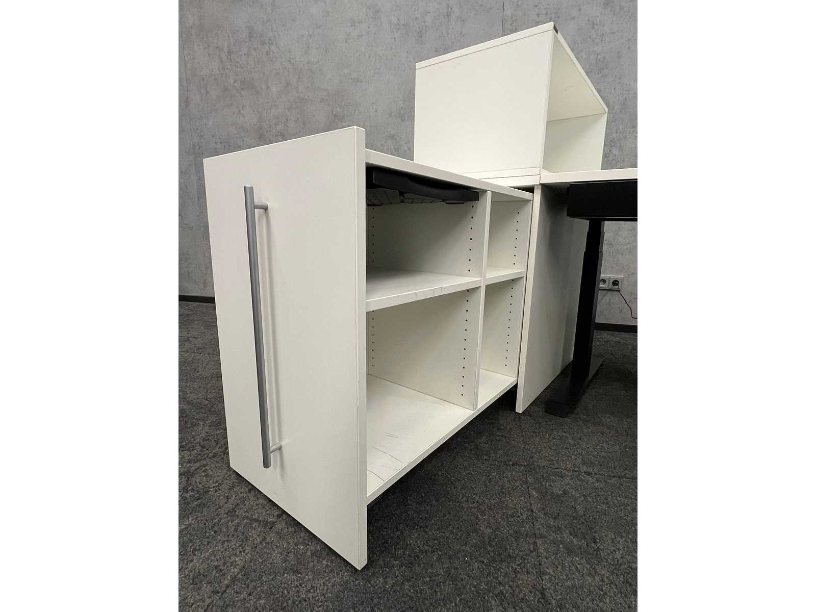 Kavel bestaande uit 1x elektrisch zit-sta bureau v.v. kabeldoorvoer, draadgoot en bureaulade. Afm. ca. hoogte 61-126 cm. bxd 140x80 cm. ----- 1x Senator ergonomische bureaustoel v.v. 4D verstelbare armleggers, zithoogte en zitdiepte instelbaar, kantelmechanisme rugleuning/ actief zitten, lendensteun en netweave rugbekleding ----- 1x uitschuifbare opbergkast. Afm. ca. hxbxd 110x44x81 cm. Nee Zit-sta: true Elektrisch verstelbaar: true Kleur: wit, zwart