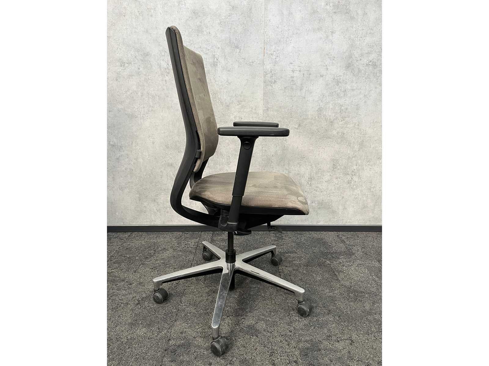 V.v. 4D verstelbare armleggers, taupe bekleding, kantelmechanisme rugleuning/ actief zitten, zithoogte en zitdiepte verstelbaar, chroom 5-teens voetenkruis. Nee Merk: klöber Kleur: taupe, zwart, chroom