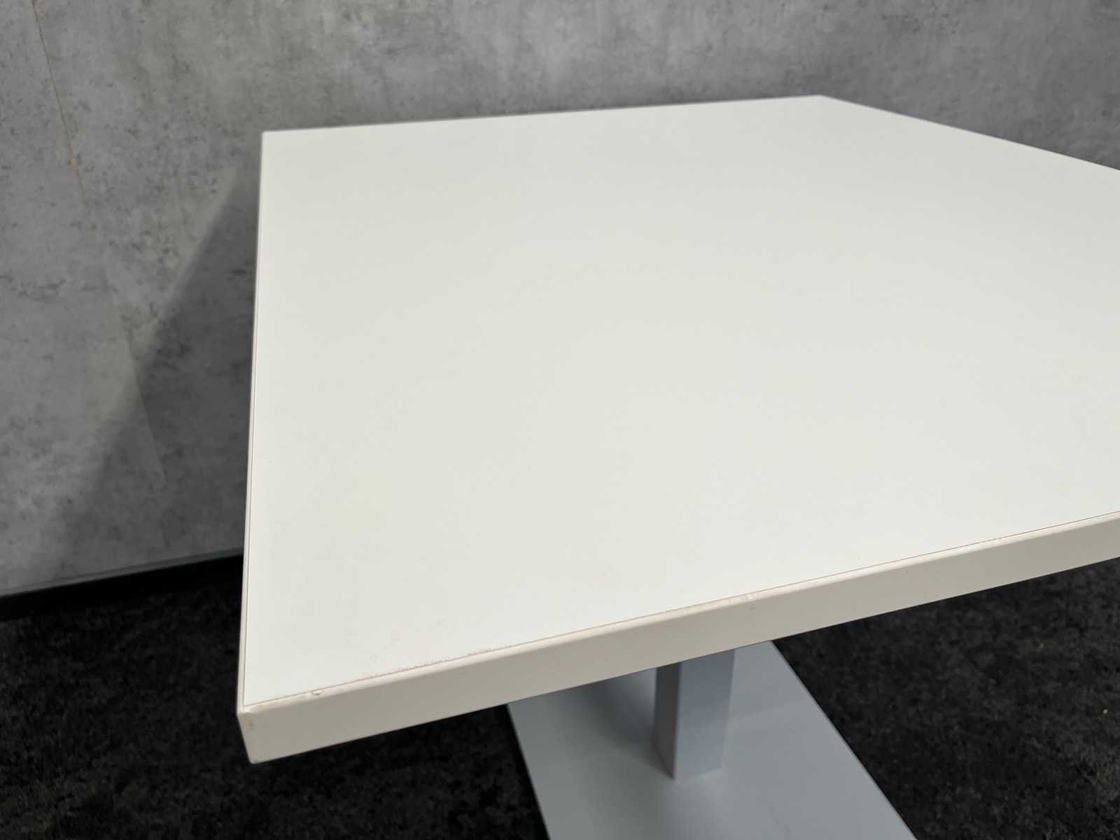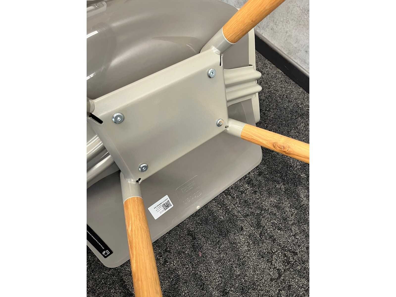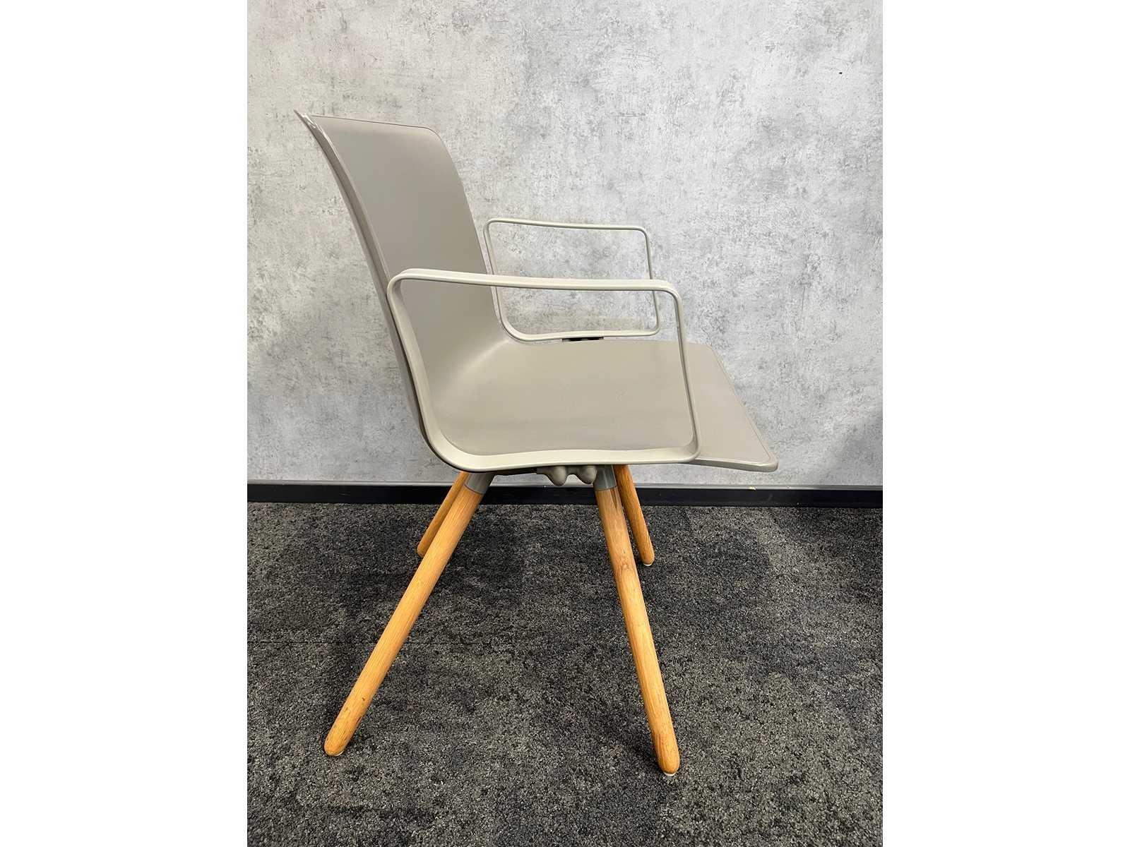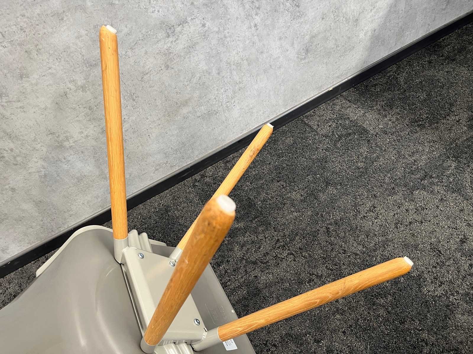 Kavel bestaande uit 3x Gispen Nomi design stoel. Design van Just Meijer. -- 1x tafel v.v. wit melamine blad en grijs stalen frame. Afm. tafel ca. hxbxd 74x80x100 cm. Nee Merk: Gispen Nomi Kleur: grijs, hout, wit