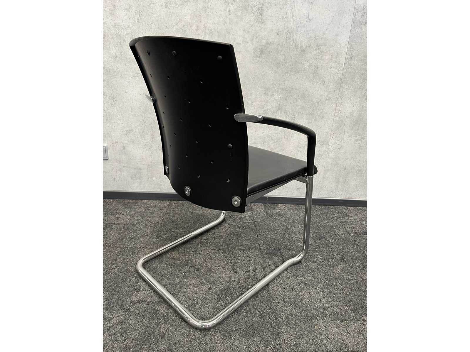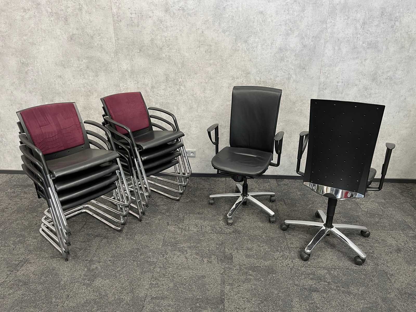 Kavel bestaande uit 2x zwart lederen König+Neurath bureaustoel v.v. in hoogte instelbare armleggers, zithoogte en zitdiepte instelbaar, kantelmechanisme rugleuning/ actief zitten. -- 8x König+Neurath nestelbare conferentiestoel v.v. zwart lederen zitvlak, bordeaux gestoffeerde rugbekleding, chroom sledeframe, zwart kunststof armleggers. Nee Merk: König+Neurath