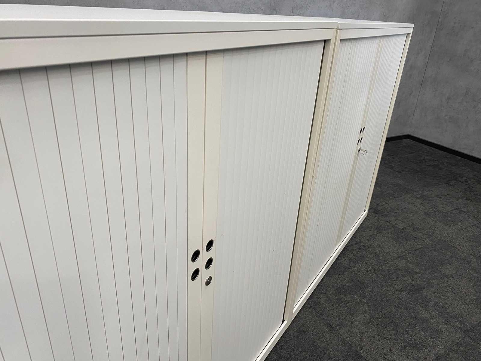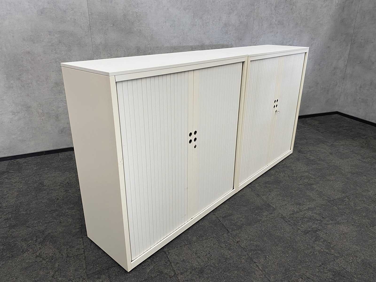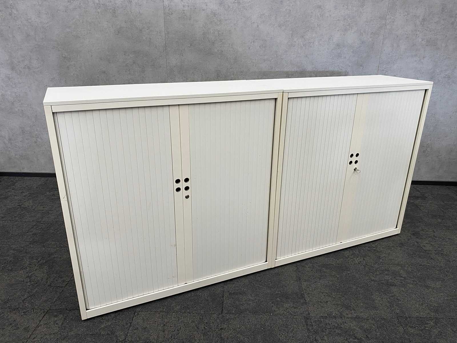 Afm. per kast ca. 123x120.5x47.5 cm. -- v.v. 2 verstelbare legborden per kast -- 1x met sleutel, 1x zonder sleutel Nee Merk: 2x Gispen Kleur: wit Materiaal: metaal, kunststof